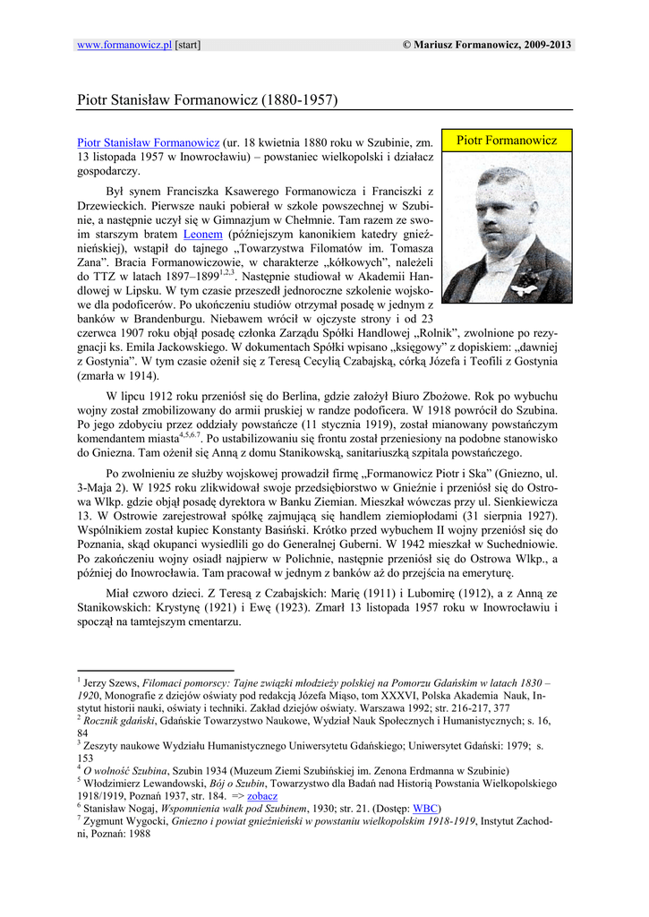 www.formanowicz.pl [start] © Mariusz Formanowicz, 2009-2013 Piotr Stanisław Formanowicz (1880-1957) Piotr Stanisław Formanowicz (ur. 18 kwietnia 1880 roku w Szubinie, zm. 13 listopada 1957 w Inowrocławiu) – powstaniec wielkopolski i działacz gospodarczy. Piotr Formanowicz Był synem Franciszka Ksawerego Formanowicza i Franciszki z Drzewieckich. Pierwsze nauki pobierał w szkole powszechnej w Szubinie, a następnie uczył się w Gimnazjum w Chełmnie. Tam razem ze swoim starszym bratem Leonem (późniejszym kanonikiem katedry gnieźnieńskiej), wstąpił do tajnego „Towarzystwa Filomatów im. Tomasza Zana”. Bracia Formanowiczowie, w charakterze „kółkowych”, należeli do TTZ w latach 1897–18991,2,3. Następnie studiował w Akademii Handlowej w Lipsku. W tym czasie przeszedł jednoroczne szkolenie wojskowe dla podoficerów. Po ukończeniu studiów otrzymał posadę w jednym z banków w Brandenburgu. Niebawem wrócił w ojczyste strony i od 23 czerwca 1907 roku objął posadę członka Zarządu Spółki Handlowej „Rolnik”, zwolnione po rezygnacji ks. Emila Jackowskiego. W dokumentach Spółki wpisano „księgowy” z dopiskiem: „dawniej z Gostynia”. W tym czasie ożenił się z Teresą Cecylią Czabajską, córką Józefa i Teofili z Gostynia (zmarła w 1914). W lipcu 1912 roku przeniósł się do Berlina, gdzie założył Biuro Zbożowe. Rok po wybuchu wojny został zmobilizowany do armii pruskiej w randze podoficera. W 1918 powrócił do Szubina. Po jego zdobyciu przez oddziały powstańcze (11 stycznia 1919), został mianowany powstańczym komendantem miasta4,5,6.7. Po ustabilizowaniu się frontu został przeniesiony na podobne stanowisko do Gniezna. Tam ożenił się Anną z domu Stanikowską, sanitariuszką szpitala powstańczego. Po zwolnieniu ze służby wojskowej prowadził firmę „Formanowicz Piotr i Ska” (Gniezno, ul. 3-Maja 2). W 1925 roku zlikwidował swoje przedsiębiorstwo w Gnieźnie i przeniósł się do Ostrowa Wlkp. gdzie objął posadę dyrektora w Banku Ziemian. Mieszkał wówczas przy ul. Sienkiewicza 13. W Ostrowie zarejestrował spółkę zajmującą się handlem ziemiopłodami (31 sierpnia 1927). Wspólnikiem został kupiec Konstanty Basiński. Krótko przed wybuchem II wojny przeniósł się do Poznania, skąd okupanci wysiedlili go do Generalnej Guberni. W 1942 mieszkał w Suchedniowie. Po zakończeniu wojny osiadł najpierw w Polichnie, następnie przeniósł się do Ostrowa Wlkp., a później do Inowrocławia. Tam pracował w jednym z banków aż do przejścia na emeryturę. Miał czworo dzieci. Z Teresą z Czabajskich: Marię (1911) i Lubomirę (1912), a z Anną ze Stanikowskich: Krystynę (1921) i Ewę (1923). Zmarł 13 listopada 1957 roku w Inowrocławiu i spoczął na tamtejszym cmentarzu. 1 Jerzy Szews, Filomaci pomorscy: Tajne związki młodzieży polskiej na Pomorzu Gdańskim w latach 1830 – 1920, Monografie z dziejów oświaty pod redakcją Józefa Miąso, tom XXXVI, Polska Akademia Nauk, Instytut historii nauki, oświaty i techniki. Zakład dziejów oświaty. Warszawa 1992; str. 216-217, 377 2 Rocznik gdański, Gdańskie Towarzystwo Naukowe, Wydział Nauk Społecznych i Humanistycznych; s. 16, 84 3 Zeszyty naukowe Wydziału Humanistycznego Uniwersytetu Gdańskiego; Uniwersytet Gdański: 1979; s. 153 4 O wolność Szubina, Szubin 1934 (Muzeum Ziemi Szubińskiej im. Zenona Erdmanna w Szubinie) 5 Włodzimierz Lewandowski, Bój o Szubin, Towarzystwo dla Badań nad Historią Powstania Wielkopolskiego 1918/1919, Poznań 1937, str. 184. => zobacz 6 Stanisław Nogaj, Wspomnienia walk pod Szubinem, 1930; str. 21. (Dostęp: WBC) 7 Zygmunt Wygocki, Gniezno i powiat gnieźnieński w powstaniu wielkopolskim 1918-1919, Instytut Zachodni, Poznań: 1988 Niektóre źródła podają, że powstańczym komendantem Szubina został Józef Formanowicz, brat Piotra8. Jest to nieprawda. W czasie Powstania Wielkopolskiego Józef Formanowicz mieszkał w Sierakowie. Tam organizował kompanię powstańczą, oraz bezpośrednio uczestniczył w przejęciu władzy w mieście. W dn. 8 stycznia 1919 roku zdobywał pocztę, 19 stycznia odbierał przysięgę kompanii na rynku sierakowskim. Obaj bracia brali udział w walkach powstańczych, ale w różnych miejscach: Piotr w Szubinie, a Józef w Sierakowie. (Fó-, Fu-) Formanowiczowie w Powstaniu Wielkopolskim 1918-1919 = > powrót do listy biograficznej 8 Marian Biskup (red.), Dzieje Szubina, Państwowe Wydawnictwo Naukowe, Warszawa; Poznań: 1974. str. 141. (Dostęp: KPBC)