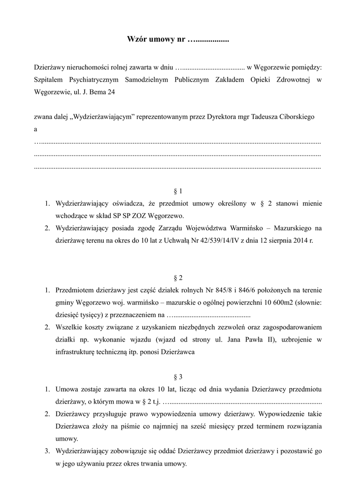 Wzór umowy nr …................ Dzierżawy nieruchomości rolnej zawarta w dniu …................................... w Węgorzewie pomiędzy: Szpitalem Psychiatrycznym Samodzielnym Publicznym Zakładem Opieki Zdrowotnej w Węgorzewie, ul. J. Bema 24 zwana dalej „Wydzierżawiającym” reprezentowanym przez Dyrektora mgr Tadeusza Ciborskiego a …............................................................................................................................................................ ................................................................................................................................................................ ................................................................................................................................................................ §1 1. Wydzierżawiający oświadcza, że przedmiot umowy określony w § 2 stanowi mienie wchodzące w skład SP SP ZOZ Węgorzewo. 2. Wydzierżawiający posiada zgodę Zarządu Województwa Warmińsko – Mazurskiego na dzierżawę terenu na okres do 10 lat z Uchwałą Nr 42/539/14/IV z dnia 12 sierpnia 2014 r. §2 1. Przedmiotem dzierżawy jest część działek rolnych Nr 845/8 i 846/6 położonych na terenie gminy Węgorzewo woj. warmińsko – mazurskie o ogólnej powierzchni 10 600m2 (słownie: dziesięć tysięcy) z przeznaczeniem na …........................................... 2. Wszelkie koszty związane z uzyskaniem niezbędnych zezwoleń oraz zagospodarowaniem działki np. wykonanie wjazdu (wjazd od strony ul. Jana Pawła II), uzbrojenie w infrastrukturę techniczną itp. ponosi Dzierżawca §3 1. Umowa zostaje zawarta na okres 10 lat, licząc od dnia wydania Dzierżawcy przedmiotu dzierżawy, o którym mowa w § 2 t.j. …..................................................................................... 2. Dzierżawcy przysługuje prawo wypowiedzenia umowy dzierżawy. Wypowiedzenie takie Dzierżawca złoży na piśmie co najmniej na sześć miesięcy przed terminem rozwiązania umowy. 3. Wydzierżawiający zobowiązuje się oddać Dzierżawcy przedmiot dzierżawy i pozostawić go w jego używaniu przez okres trwania umowy. 4. Dzierżawca oświadcza, że po wygaśnięciu umowy zwróci dzierżawioną nieruchomość w stanie niepogorszonym i nie będzie żądał od Wydzierżawiającego zwrotu nakładów finansowych poniesionych w związku z przygotowaniem i użytkowaniem przedmiotu dzierżawy. 5. Dzierżawca oświadcza, że zapoznał się z przedmiotem dzierżawy, o którym mowa w § 2 w jego używaniu i w związku z tym nie będzie występował z roszczeniami z tytułu rękojmi za wady przedmiotu dzierżawy. §4 1. Wydanie Dzierżawcy przedmiotu umowy nastąpi z chwilą podpisania umowy. §5 1. Dzierżawca zobowiązuje się używać przedmiotu dzierżawy zgodnie z zasadami prawidłowej gospodarki w celu wykonywania na nim działalności gospodarczej i nie może zmienić przeznaczenia części lub całości przedmiotu dzierżawy bez zgody Wydzierżawiającego wyrażonej pisemnie. 2. Informowania Wydzierżawiającego o każdej zmianie adresu , pod rygorem uznania za skuteczne doręczenie korespondencji pod adre4s znany Wydzierżawiającemu w chwili zawarcia umowy §6 1. Dzierżawca zobowiązuje się do używania przedmiotu dzierżawy z zachowaniem obowiązujących przepisów prawa, a w szczególności: o ochronie gruntów, o ochronie przyrody, o ochronie środowiska, przepisów prawa wodnego, prawa budowlanego i zobowiązuje się do używania przedmiotu dzierżawy stosownie do tych ograniczeń i obowiązków. §7 1. Dzierżawca zobowiązuje się do utrzymania na własny koszt przedmiotu dzierżawy przez okres jej trwania w taki sposób, aby jego poszczególne składniki nie ulegały pogorszeniu z wyjątkiem pogorszenia wynikającego z normalnego zużycia rzeczy. §8 1. Po zakończeniu dzierżawy, Dzierżawca zobowiązuje się zwrócić Wydzierżawiającemu przedmiot dzierżawy w stanie nie pogorszonym, z wyjątkiem pogorszenia wynikającego z normalnego zużycia rzeczy. §9 1. Wydzierżawiający zastrzega sobie lub upoważnionej osobie prawo wstępu na teren przedmiotu dzierżawy i dokonania oględzin poszczególnych jego składników w celu skontrolowania przestrzegania przez Dzierżawcę postanowień umowy. 2. W razie stwierdzenia naruszenia postanowień niniejszej umowy Wydzierżawiający przedstawi Dzierżawcy pisemne uwagi w terminie 7 dni od ostatniego dnia oględzin przedmiotu dzierżawy. Dzierżawca ma obowiązek złożenia pisemnego wyjaśnienia w sprawie przedstawionych uwag w ciągu 14 dni od daty ich otrzymania. § 10 1. Dzierżawca zobowiązuje się do ponoszenia, oprócz czynszu dzierżawnego, wszelkich obciążeń publiczno-prawnych związanych z przedmiotem dzierżawy, a obciążających, zgodnie z obowiązującymi przepisami właściciela lub posiadacza nieruchomości. Dzierżawca zobowiązuje się do ubezpieczenia działalności od zdarzeń losowych na okres trwania umowy i dostarczenia potwierdzającego dokumentu w terminie 30 dni od daty zawarcia umowy. 2. Dzierżawca jest zobowiązany do regulowania należności za korzystanie z energii elektrycznej, wody, wywozu nieczystości, itp. podmiotom świadczącym określone usługi. 3. Pokrycie szkody wyrządzonej przez Dzierżawcę, do której naprawienia został zobowiązany Wydzierżawiający, ciąży na Dzierżawcy. § 11 1. Dzierżawca zobowiązuje się płacić Wydzierżawiającemu czynsz dzierżawny w wysokości ….......................oraz podatek od prowadzonej działalności zgodnie z Uchwałą Rady Miejskiej określającą wysokość opłat i podatków gminnych obowiązujących w danym roku. 2. Cena czynszu dzierżawnego podana jest za okres jednego miesiąca dzierżawy w 2014 r. 3. Cena będzie regulowana corocznie wskaźnikiem inflacji za rok poprzedni ogłoszony przez GUS i wprowadzana w okresach od 1 lipca do 30 czerwca roku następnego. W przypadku, gdy ze względu na termin