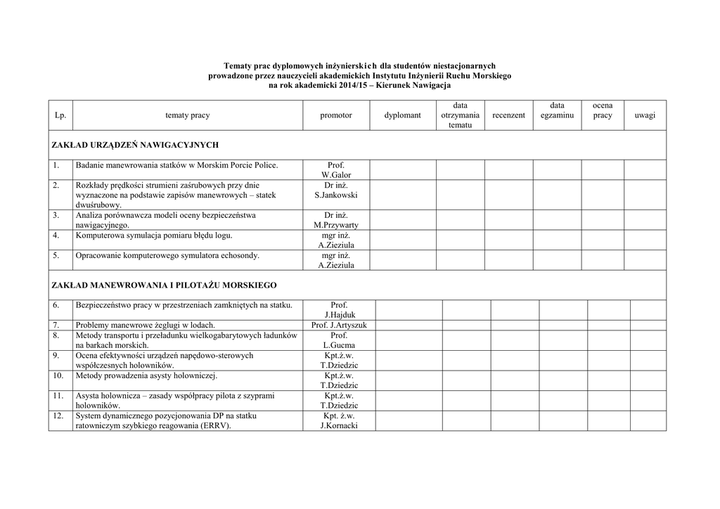 Tematy prac dyplomowych inżynierskic h dla studentów niestacjonarnych prowadzone przez nauczycieli akademickich Instytutu Inżynierii Ruchu Morskiego na rok akademicki 2014/15 – Kierunek Nawigacja Lp. tematy pracy promotor ZAKŁAD URZĄDZEŃ NAWIGACYJNYCH 1. Badanie manewrowania statków w Morskim Porcie Police. 2. 4. Rozkłady prędkości strumieni zaśrubowych przy dnie wyznaczone na podstawie zapisów manewrowych – statek dwuśrubowy. Analiza porównawcza modeli oceny bezpieczeństwa nawigacyjnego. Komputerowa symulacja pomiaru błędu logu. 5. Opracowanie komputerowego symulatora echosondy. 3. Prof. W.Galor Dr inż. S.Jankowski Dr inż. M.Przywarty mgr inż. A.Zieziula mgr inż. A.Zieziula ZAKŁAD MANEWROWANIA I PILOTAŻU MORSKIEGO 6. Bezpieczeństwo pracy w przestrzeniach zamkniętych na statku. 7. 8. Problemy manewrowe żeglugi w lodach. Metody transportu i przeładunku wielkogabarytowych ładunków na barkach morskich. Ocena efektywności urządzeń napędowo-sterowych współczesnych holowników. Metody prowadzenia asysty holowniczej. 9. 10. 11. 12. Asysta holownicza – zasady współpracy pilota z szyprami holowników. System dynamicznego pozycjonowania DP na statku ratowniczym szybkiego reagowania (ERRV). Prof. J.Hajduk Prof. J.Artyszuk Prof. L.Gucma Kpt.ż.w. T.Dziedzic Kpt.ż.w. T.Dziedzic Kpt.ż.w. T.Dziedzic Kpt. ż.w. J.Kornacki dyplomant data otrzymania tematu recenzent data egzaminu ocena pracy uwagi 13. 14. Analiza możliwości szkoleniowych na modelu akwenu portu Szczecin w zakresie manewrowania statkiem. Problematyka i specyfika manewrowania dużych kontenerowców. Kpt. ż.w. J.Kornacki Kpt. ż.w. J.Kornacki ZAKŁAD BEZPIECZEŃSTWA NAWIGACYJNEGO 15. Analiza dokładności śledzenia obiektów manewrujących przez urządzenia radarowe. 16. 17. Animacja komputerowa wybranych zderzeń statków w warunkach ograniczonej widzialności. Bezpieczeństwo statku typu PCC. 18. Analiza zderzeń z udziałem statków zajętych połowem. 19. Wpływ portów i stoczni na zanieczyszczenie środowiska morskiego. Analiza zagrożeń wynikających z ekoterroryzmu. Ochrona środowiska morskiego w aspekcie obowiązujących konwencji. Analiza wpływu globalnego ocieplenia na środowisko. 20. 21. 22. 23. Wpływ eksploatacji terminalu gazowego w Świnoujściu na środowisko. 24. Wpływ spalin silników okrętowych na globalne ocieplenie. 25. Liny włókienne typu DYNEEMA oraz ich zastosowanie w transporcie morskim i śródlądowym. Dr inż. W.Juszkiewicz Kpt.ż.w. T.Pluta Kpt.ż.w. T.Pluta Kpt.ż.w. T.Pluta Dr inż. D.Jarząbek Dr inż. D.Jarząbek Dr inż. D.Jarząbek Mgr inż. M.Górzeński Mgr inż. M.Górzeński Mgr inż. M.Górzeński Prof. P.Nowakowski