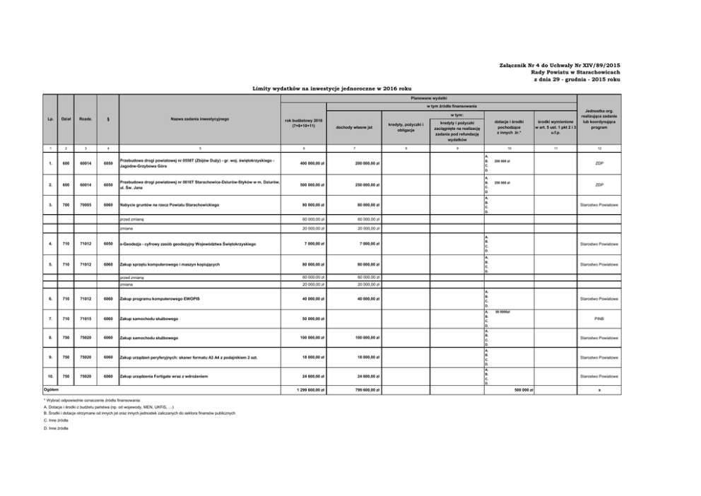 Załącznik Nr 4 do Uchwały Nr XIV/89/2015 Rady Powiatu w Starachowicach z dnia 29 - grudnia - 2015 roku Limity wydatków na inwestycje jednoroczne w 2016 roku Planowane wydatki w tym źródła finansowania Lp. 1 Dział 2 Rozdz. 3 § Nazwa zadania inwestycyjnego 4 5 w tym: rok budżetowy 2016 (7+8+10+11) dochody własne jst kredyty, pożyczki i obligacje kredyty i pożyczki zaciągnięte na realizację zadania pod refundację wydatków 6 7 8 9 dotacje i środki pochodzące z innych źr.* środki wymienione w art. 5 ust. 1 pkt 2 i 3 u.f.p. 10 11 Jednostka org. realizująca zadanie lub koordynująca program 12 1. 600 60014 6050 Przebudowa drogi powiatowej nr 0558T (Zbijów Duży) - gr. woj. świętokrzyskiego Jagodne-Grzybowa Góra 400 000,00 zł 200 000,00 zł A. B. C. D. 2. 600 60014 6050 Przebudowa drogi powiatowej nr 0616T Starachowice-Dziurów-Styków w m. Dziurów, ul. Św. Jana 500 000,00 zł 250 000,00 zł A. B. C. D. 3. 700 70005 6060 Nabycie gruntów na rzecz Powiatu Starachowickiego 80 000,00 zł 80 000,00 zł A. B. C. D. Starostwo Powiatowe przed zmianą 60 000,00 zł 60 000,00 zł zmiana 20 000,00 zł 20 000,00 zł 7 000,00 zł 7 000,00 zł A. B. C. D. Starostwo Powiatowe A. B. C. D. Starostwo Powiatowe A. B. C. D. Starostwo Powiatowe 4. 710 71012 6050 e-Geodezja - cyfrowy zasób geodezyjny Województwa Świętokrzyskiego 5. 710 71012 6060 Zakup sprzętu komputerowego i maszyn kopiujących 80 000,00 zł 80 000,00 zł przed zmianą 60 000,00 zł 60 000,00 zł zmiana 20 000,00 zł 20 000,00 zł 40 000,00 zł 200 000 zł ZDP 250 000 zł ZDP 6. 710 71012 6060 Zakup programu komputerowego EWOPIS 40 000,00 zł 7. 710 71015 6060 Zakup samochodu służbowego 50 000,00 zł A. B. C. D. 100 000,00 zł 100 000,00 zł A. B. C. D. Starostwo Powiatowe 50 0000zł PINB 8. 750 75020 6060 Zakup samochodu służbowego 9. 750 75020 6060 Zakup urządzeń peryferyjnych: skaner formatu A3 A4 z podajnikiem 2 szt. 18 000,00 zł 18 000,00 zł A. B. C. D. Starostwo Powiatowe 10. 750 75020 6060 Zakup urządzenia Fortigate wraz z wdrożeniem 24 600,00 zł 24 600,00 zł A. B. C. D. Starostwo Powiatowe 1 299 600,00 zł 799 600,00 zł 100000 100000 Ogółem * Wybrać odpowiednie oznaczenie źródła finansowania: A. Dotacje i środki z budżetu państwa (np. od wojewody, MEN, UKFiS, …) B. Środki i dotacje otrzymane od innych jst oraz innych jednostek zaliczanych do sektora finansów publicznych C. Inne źródła D. Inne źródła 500 000 zł x