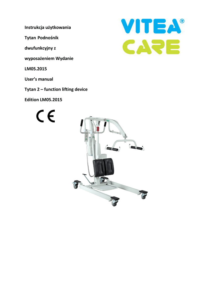 Instrukcja użytkowania Tytan Podnośnik dwufunkcyjny z wyposażeniem Wydanie LM05.2015 User’s manual Tytan 2 – function lifting device Edition LM05.2015 Ważne informacje dotyczące bezpieczeństwa Important safeguards Podnośnik służy wyłącznie do przenoszenia pacjenta. Nie używaj podnośnika w żadnym innym celu. for transferring patients only. Do not use the lift for any other purpose. Podnośnik jest przeznaczony do użycia przez osoby, które mieszczą się w limicie wagowym wskazanym dla urządzenia. Nie próbować podnosić osoby, która przekracza limit wagowy. Przed próbą przeniesienia użytkownik musi zostać poinstruowany przez wykwalifikowany personel na temat obsługi podnośnika. Podnośnik powinien być obsługiwany przez odpowiednio przeszkolonego opiekuna. Lifting device is intended to be used for persons within the specified weight limit indicated for the lift. Do not attempt to lift more than the weight limit indicated. Before attempting to transfer, the user must be assessed by qualified professional. The lifting device must be used by a caregiver with proper training to work with the person to be transferred. Tylko przeszkoleni i wykwalifikowani opiekunowie powinni przenosić pacjenta za pomocą podnośnika. Nie korzystaj z podnośnika, jeżeli nie zostałeś do tego odpowiednio przygotowany. Nie używaj nosidła, które nie jest zalecane dla podnośnika. Nie przechowuj podnośnika pod natryskiem, łaźni bądź innym miejscu o dużej wilgotności. Przechowywać wszystkie części podnośnika czyste i suche oraz z elektrycznym i mechanicznym zabezpieczeniem komponentów. Zawsze manewruj podnośnikiem korzystając z uchwytu który jest na wyposażeniu. Lifting device is Only trained and qualified caregivers should transfer a person. Do not attempt to use lift if you have not been properly trained to do so. Do not use a sling that is not recommended for the lift. Do not store the lift In a shower, bath or other area with high humidity. Keep all components of the lift clean and dry and keep electrical and mechanical safety. Always maneuver the lifting device with the handle provided. Budowa: 1. 2. 3. 4. 5. 6. 7. 8. 9. 10. Structure: Rączka sterująca Regulacja wysunięcia podstawy Maszt Zaczep łączenia nosidła Uchwyt kolan Tylne koło z hamulcem Przednie koło bez hamulca Platforma stóp Pilot Panel sterujący 1. 2. 3. 4. 5. 6. 7. 8. 9. 10. Push handle Adjustment handle Mast Sling attachment hook Knee pad Rear caster with brakes Front caster without brake Footplate Control handset Control Panel 1. 9. 4. 10. 3. 5. 2. 6. 8. 7. Instrukcja montażu Assembly instructions 1. Wyjmij wszystkie części z kartonu i połóż je na ziemi uważając, aby ich nie uszkodzić. 1. Remove all the parts from the carton and place on the floor, protecting them from damage. 2. Zamontuj zestaw masztu z wysięgnikiem do otworu w podstawie. 2. Fit the mast and boom assembly into the base socket. Przykręć śrubę. Załóż dolną śrubę siłownika przez podnośnik i siłownik. Załóż górny bolec z łańcuchem siłownika przez podnośnik i siłownik. Zamontuj panel sterowania na wsporniku montażowym zlokalizowanym na maszcie. Dokręć panel sterowania śrubami montażowymi. Tighten screw. Install bottom actuator screw through lift and actuator. Install top actuator pin in through lift and actuator. Install control box onto mounting bracket located on the mast. Tighten control box wit h mounting screws. Zamontuj baterię nad panelem sterowania. Install battery on top of control box. Podłącz pilota w wejście znajdujące się w lewej dolnej części panelu sterowania. Plug the remote control set into the socket located on the bottom left side of control box. Podłącz siłownik podnośnika w środkowe dolne wejście panelu sterowania. Plug the actuator into the bottom middle socket of control box. Uwagi: Remarks: Należy zawsze sprawdzać czy maszt jest całkowicie zablokowany. Please always check the mast is fully locked. Obsługa działania podnośnika: How to operate the Lifting Device: Ważne: Przed pierwszym użyciem należy ładować akumulator przez 24 godziny w celu osiągnięcia prawidłowego działania i wydłużenia żywotności akumulatora. Important: Prior to first use, please make sure that the battery has been charged for 24 hours in order to reach proper functioning and prolong the lifetime of battery. 1. Przed uniesieniem pacjenta należy rozszerzyć nogi podstawy do najszerszej możliwej pozycji. 2. Należy umieścić pacjenta w środku pomiędzy nogami podstawy. Pacjent powinien być tak ustawiony, aby widział opiekuna. 3. W przypadku pacjentów cierpiących na spastyczność lub pacjentów o znacznym upośledzeniu należy zachować szczególną ostrożność. 4. W jaki sposób korzystać ze standardowego nosidła lub nosidła toaletowego. a. Dla łatwego i wygodnego podnoszenia pacjenta należy mieć przygotowany podnośnik, nosidło lub nosidło kąpielowe oraz wózek inwalidzki. b. Pacjent powinien leżeć na środku łóżka, po czym należy obrócić go na bok w kierunku odwrotnym do opiekuna. 1. Spread the base legs to the widest position before lifting. 2. Keep the patient centered between the base legs and have the patient face the caregiver. 3. In the case of patients suffering from spasticity or patients with significant impairment be extremely careful. 4. How to use Standard or Commode Slings. a. For smooth and easy lifting, have the sling or bath sling and wheelchair preapared. b. With the patient in the center of the bed, roll patient on side away from the caregiver. c. Należy następnie obrócić pacjenta w kierunku opiekuna i umieścić go na środku nosidła. Przy podstawie podnośnika znajdującej się pod łóżkiem, nacisnąć przycisk “↓” na panelu sterowania w celu obniżenia wysięgnika. d. Wiszące paski należy zawiesić na pręcie z hakami. W przypadku zastosowania łańcucha, należy upewnić się, że haki w kształcie 