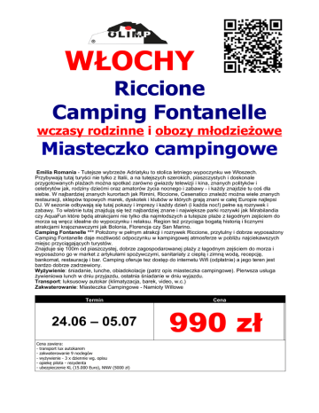 WŁOCHY Riccione Camping Fontanelle wczasy rodzinne i obozy młodzieżowe Miasteczko campingowe Emilia Romania - Tutejsze wybrzeże Adriatyku to stolica letniego wypoczynku we Włoszech. Przybywają tutaj turyści nie tylko z Italii, a na tutejszych szerokich, piaszczystych i doskonale przygotowanych plażach można spotkać zarówno gwiazdy telewizji i kina, znanych polityków i celebrytów jak, rodziny dziećmi oraz amatorów życia nocnego i zabawy - i każdy znajdzie tu coś dla siebie. W najbardziej znanych kurortach jak Rimini, Riccione, Cesenatico znaleźć można wiele znanych restauracji, sklepów topowych marek, dyskotek i klubów w których grają znani w całej Europie najlepsi DJ. W sezonie odbywają się tutaj pokazy i imprezy i każdy dzień (i każda noc!) pełne są rozrywek i zabawy. To właśnie tutaj znajdują się też najbardziej znane i największe parki rozrywki jak Mirabilandia czy AquaFun które będą atrakcjami nie tylko dla najmłodszych a tutejsze plaże z łagodnym zejściem do morza są wręcz idealne do wypoczynku i relaksu. Region też przyciąga bogatą historią i licznymi atrakcjami krajoznawczymi jak Bolonia, Florencja czy San Marino. Camping Fontanelle *** Położony w pełnym atrakcji i rozrywek Riccione, przytulny i dobrze wyposażony Camping Fontanelle daje możliwość odpoczynku w kampingowej atmosferze w pobliżu najciekawszych miejsc przyciągających turystów. Znajduje się 100m od piaszczystej, dobrze zagospodarowanej plaży z łagodnym zejściem do morza i wyposażono go w market z artykułami spożywczymi, sanitariaty z ciepłą i zimną wodą, recepcję, bankomat, restaurację i bar. Camping oferuje tez dostęp do internetu Wifi (odpłatnie) a jego teren jest bardzo dobrze zadrzewiony. Wyżywienie: śniadanie, lunche, obiadokolacje (patrz opis miasteczka campingowe). Pierwsza usługa żywieniowa lunch w dniu przyjazdu, ostatnia śniadanie w dniu wyjazdu. Transport: luksusowy autokar (klimatyzacja, barek, video, w.c.) Zakwaterowanie: Miasteczka Campingowe - Namioty Willowe Termin 24.06 – 05.07 Cena zawiera: - transport lux autokarem - zakwaterowanie 9 noclegów - wyżywienie - 3 x dziennie wg. opisu - opiekę pilota - rezydenta - ubezpieczenie KL (15.000 Euro), NNW (5000 zł) Cena 990 zł