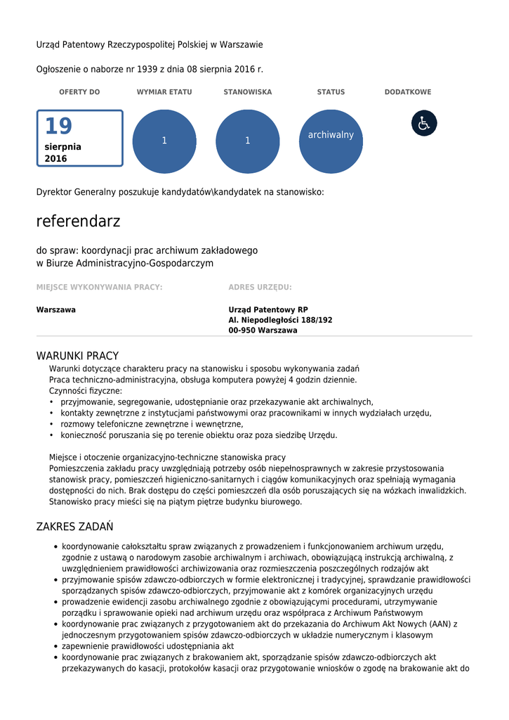 Urząd Patentowy Rzeczypospolitej Polskiej w Warszawie Ogłoszenie o naborze nr 1939 z dnia 08 sierpnia 2016 r. OFERTY DO 19 sierpnia 2016 WYMIAR ETATU STANOWISKA 1 1 STATUS DODATKOWE archiwalny Dyrektor Generalny poszukuje kandydatów\kandydatek na stanowisko: referendarz do spraw: koordynacji prac archiwum zakładowego w Biurze Administracyjno-Gospodarczym MIEJSCE WYKONYWANIA PRACY: ADRES URZĘDU: Warszawa Urząd Patentowy RP Al. Niepodległości 188/192 00-950 Warszawa WARUNKI PRACY Warunki dotyczące charakteru pracy na stanowisku i sposobu wykonywania zadań Praca techniczno-administracyjna, obsługa komputera powyżej 4 godzin dziennie. Czynności fizyczne: • przyjmowanie, segregowanie, udostępnianie oraz przekazywanie akt archiwalnych, • kontakty zewnętrzne z instytucjami państwowymi oraz pracownikami w innych wydziałach urzędu, • rozmowy telefoniczne zewnętrzne i wewnętrzne, • konieczność poruszania się po terenie obiektu oraz poza siedzibę Urzędu. Miejsce i otoczenie organizacyjno-techniczne stanowiska pracy Pomieszczenia zakładu pracy uwzględniają potrzeby osób niepełnosprawnych w zakresie przystosowania stanowisk pracy, pomieszczeń higieniczno-sanitarnych i ciągów komunikacyjnych oraz spełniają wymagania dostępności do nich. Brak dostępu do części pomieszczeń dla osób poruszających się na wózkach inwalidzkich. Stanowisko pracy mieści się na piątym piętrze budynku biurowego. ZAKRES ZADAŃ koordynowanie całokształtu spraw związanych z prowadzeniem i funkcjonowaniem archiwum urzędu, zgodnie z ustawą o narodowym zasobie archiwalnym i archiwach, obowiązującą instrukcją archiwalną, z uwzględnieniem prawidłowości archiwizowania oraz rozmieszczenia poszczególnych rodzajów akt przyjmowanie spisów zdawczo-odbiorczych w formie elektronicznej i tradycyjnej, sprawdzanie prawidłowości sporządzanych spisów zdawczo-odbiorczych, przyjmowanie akt z komórek organizacyjnych urzędu prowadzenie ewidencji zasobu archiwalnego zgodnie z obowiązującymi procedurami, utrzymywanie porządku i sprawowanie opieki nad archiwum urzędu oraz współpraca z Archiwum Państwowym koordynowanie prac związanych z przygotowaniem akt do przekazania do Archiwum Akt Nowych (AAN) z jednoczesnym przygotowaniem spisów zdawczo-odbiorczych w układzie numerycznym i klasowym zapewnienie prawidłowości udostępniania akt koordynowanie prac związanych z brakowaniem akt, sporządzanie spisów zdawczo-odbiorczych akt przekazywanych do kasacji, protokołów kasacji oraz przygotowanie wniosków o zgodę na brakowanie akt do AAN współuczestniczenie w opracowywaniu dokumentów i przygotowanie projektów pism w sprawach dotyczących archiwum urzędu przygotowywanie propozycji planów i sprawozdań w części dotyczącej archiwum WYMAGANIA NIEZBĘDNE Wykształcenie: wyższe doświadczenie zawodowe: 3 lata w różnych jednostkach znajomość ustawy o narodowym zasobie archiwalnym znajomość ustawy prawo własności przemysłowej znajomość kodeksu postępowania administracyjnego umiejętność pracy w zespole, samodzielność, systematyczność asertywność i komunikatywność umiejętność obsługi komputera (środowisko Windows, MS Office – Excel) Posiadanie obywatelstwa polskiego Korzystanie z pełni praw publicznych Nieskazanie prawomocnym wyrokiem za umyślne przestępstwo lub umyślne przestępstwo skarbowe WYMAGANIA DODATKOWE doświadczenie zawodowe: 2 lata w archiwizowaniu dokumentacji lub zbiorów przeszkolenie dla archiwistów lub kursy prowadzone bądź zlecane przez Archiwum Państwowe komunikatywna znajomość języka angielskiego znajomość systemu EZD DOKUMENTY I OŚWIADCZENIA NIEZBĘDNE Życiorys/CV i list motywacyjny Kopie dokumentów potwierdzających spełnienie wymagania niezbędnego w zakresie wykształcenia Kopie dokumentów potwierdzających spełnienie wymagania niezbędnego w zakresie doświadczenia zawodowego / stażu pracy oświadczenie kandydata o wyrażeniu zgody na przeprowadzenie postępowania sprawdzającego, umożliwiającego dostęp do informacji niejawnych zgodnie z przepisami ustawy z dnia 5 sierpnia 2010 r. o ochronie informacji niejawnych (Dz. U. Nr 182 z 2010 r., poz. 1228) w przypadku ukończenia studiów wyższych na uczelni zagranicznej, prosimy o przesłanie kopii potwierdzenia uznania dyplomu przez Departament Nadzoru i Organizacji Szkolnictwa Wyższego w Ministerstwie Nauki i Szkolnictwa Wyższego lub nostryfikacji dyplomu oraz tłumaczenie przysięgłe dyplomu w przypadku dokumentów potwierdzających doświadczenie zawodowe sporządzonych w języku obcym prosimy o załączenie tłumaczenia na język polski Oświadczenie o posiadaniu obywatelstwa polskiego albo kopia dokumentu potwierdzającego posiadanie polskiego obywatelstwa Oświadczenie o wyrażeniu zgody na przetwarzanie danych osobowych do celów naboru Oświadczenie o korzystaniu z pełni praw publicznych Oświadczenie o nieskazaniu prawomocnym wyrokiem za umyślne przestępstwo lub umyślne przestępstwo skarbowe DOKUMENTY I OŚWIADCZENIA DODATKOWE kopia dokumentu potwierdzającego niepełnosprawność - w przypadku kandydatek/kandydatów, zamierzających skorzystać z pierwszeństwa w zatrudnieniu w przypadku, gdy znajdą się w gronie najlepszych kandydatek/kandydatów Kopie dokumentów potwierdzających spełnienie wymagania dodatkowego w zakresie doświadczenia zawodowego / stażu pracy TERMINY I MIEJSCE SKŁADANIA DOKUMENTÓW Dokumenty należy złożyć do: 19 sierpnia 2016 r. Decyduje data: stempla pocztowego / osobistego dostarczenia oferty do urzędu Miejsce składania dokumentów: Urząd Patentowy Rzeczypospolitej Polskiej Wydział Kadr i Szkolenia al. Niepodległości 188/192 00-950 Warszawa z dopiskiem na kopercie i w liście motywacyjnym: „Rekrutacja BA/R_arch” oraz numerem ogłoszenia INNE INFORMACJE: W miesiącu poprzedzającym datę upublicznienia ogłoszenia wskaźnik zatrudnienia osób niepełnosprawnych w urzędzie, w rozumieniu p