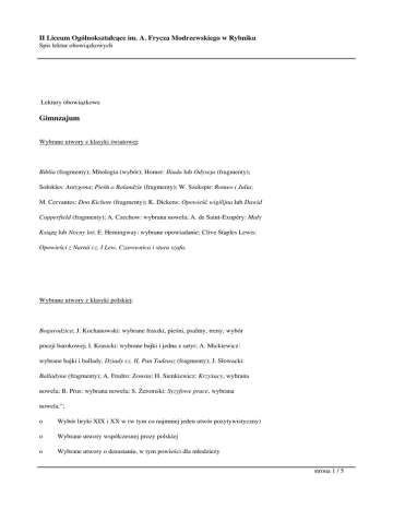 II Liceum Ogólnokształcące im. A. Frycza Modrzewskiego w Rybniku Spis lektur obowiązkowych Lektury obowiązkowe Gimnzajum Wybrane utwory z klasyki światowej: Biblia (fragmenty); Mitologia (wybór); Homer: Iliada lub Odyseja (fragmenty); Sofokles: Antygona; Pieśń o Rolandzie (fragmenty); W. Szekspir: Romeo i Julia; M. Cervantes: Don Kichote (fragmenty); K. Dickens: Opowieść wigilijna lub Dawid Copperfield (fragmenty); A. Czechow: wybrana nowela; A. de Saint-Exupéry: Mały Książę lub Nocny lot; E. Hemingway: wybrane opowiadanie; Clive Staples Lewis: Opowieści z Narnii cz. I Lew, Czarownica i stara szafa. Wybrane utwory z klasyki polskiej: Bogurodzica; J. Kochanowski: wybrane fraszki, pieśni, psalmy, treny; wybór poezji barokowej; I. Krasicki: wybrane bajki i jedna z satyr; A. Mickiewicz: wybrane bajki i ballady, Dziady cz. II, Pan Tadeusz (fragmenty); J. Słowacki: Balladyna (fragmenty); A. Fredro: Zemsta; H. Sienkiewicz: Krzyżacy, wybrana nowela; B. Prus: wybrana nowela; S. Żeromski: Syzyfowe prace, wybrana nowela.”; o Wybór liryki XIX i XX w (w tym co najmniej jeden utwór pozytywistyczny) o Wybrane utwory współczesnej prozy polskiej o Wybrane utwory o dorastaniu, w tym powieści dla młodzieży strona 1 / 5 II Liceum Ogólnokształcące im. A. Frycza Modrzewskiego w Rybniku Spis lektur obowiązkowych o Przykłady pamiętnika, dziennika, korespondencji literackich, reportażu, w tym Aleksander Kamieński Kamienie na szaniec; Miron Białoszewski Pamiętnik z powstania warszawskiego (fragmenty) o Przykłady literatury regionalnej, wkład literatury regionalnej do ogólnopolskiej skarbnicy literackiej o Wybrane z czasopism i prasy codziennej teksty publicystycznej, informacyjne i reklamowe. o Utwory zaproponowane przez uczniów i nauczycieli, w tym literatury popularna (co najmniej jeden utwór w każdej klasie). o Inne składniki kultury (przedstawienia teatralne, filmy, słuchowiska radiowe, programy telewizyjne, przekazy ikoniczne, poezja śpiewana). Lektura przykładowa: Biblia (Pieśń nad Pieśniami, Hymn św. Pawła o miłości, Apokalipsa); Antoni Czechow - Śmierć urzędnika; Ernest Hemingway - Stary człowiek i morze. Arkady Fiedler – Dywizjon 303; Melchior Wańkowicz – Ziele na kraterze; Jan Kochanowski – pieśń: Czego chcesz od nas, Panie…; Adam Mickiewicz – Ballady i romanse; Henryk Sienkiewicz - Krzyżacy; Bolesław Prus - Kamizelka; Zofia Kossak – Szczucka -Bursztyny. Utwory Krzysztofa Kamila Baczyńskiego, Konstantego Ildefonsa Gałczyńskiego, Zbigniewa Herberta, Marii Pawlikowskiej-Jasnorzewskiej, Kazimierza Wierzyńskiego, Jana Lechonia, Tadeusza Różewicza, Wisławy Szymborskiej, Czesława Miłosza, ks. Jana Twardowskiego. Powieści dla młodzieży Małgorzaty Musierowicz lub Ireny Jurgielewiczowej. Paweł Zuchniewicz – Wujek Karol. Kapłańskie lata Papieża; Karolina Lanckorońska – Wspomnienia wojenne. Liceum Literatura polska: strona 2 / 5 II Liceum Ogólnokształcące im. A. Frycza Modrzewskiego w Rybniku Spis lektur obowiązkowych Bogurodzica w kontekście poezji średniowiecznej; Jan Kochanowski - pieśni i treny (wybór); poezja baroku (wybór); Ignacy Krasicki - satyry i liryki (wybór); Adam Mickiewicz - Pan Tadeusz, Dziady cz. III; wybrane sceny z dramatów romantycznych (w tym utwory Juliusza Słowackiego i Zygmunta Krasińskiego); wybór poezji romantycznej (w tym utwory Adama Mickiewicza, Juliusza Słowackiego i Cypriana Kamila Norwida); Bolesław Prus - Lalka; Eliza Orzeszkowa - Nad Niemnem (fragmenty); wybór nowel pozytywistycznych; Henryk Sienkiewicz - wybrana powieść; wybór poezji młodopolskiej; Stanisław Wyspiański - Wesele; Władysław Stanisław Reymont - Chłopi, t. 1: Jesień; Stefan Żeromski - Ludzie bezdomni, Przedwiośnie; Witold Gombrowicz fragmenty prozy; wybrany utwór z prozy polskiej XX wieku (w tym utwór Marii Dąbrowskiej i Zofii Nałkowskiej); wybrany dramat XX wieku (w tym utwór Sławomira Mrożka i Tadeusza Różewicza); Tadeusz Borowski - wybrane opowiadania; Gustaw Herling - Grudziński - Inny świat; wybór poezji polskiej XX wieku (w tym utwory Bolesława Leśmiana, Leopolda Staffa, Juliana Tuwima, Marii Pawlikowskiej - Jasnorzewskiej, Czesława Miłosza, Krzysztofa Kamila Baczyńskiego, Tadeusza Różewicza, Zbigniewa Herberta, Mirona Białoszewskiego, Wisławy Szymborskiej, Stanisława Barańczaka i ks. Jana Twardowskiego); wybrane fragmenty prozy dokumentalnej (reportaż, dziennik, pamiętnik) i eseistycznej; utwory współczesne zaproponowane przez uczniów i nauczyciela; inne teksty kultury (spektakle teatralne, filmy, utwory muzyczne, obrazy, słuchowiska, programy telewizyjne, teksty prasowe). Literatura powszechna: strona 3 / 5 II Liceum Ogólnokształcące im. A. Frycza Modrzewskiego w Rybniku Spis lektur obowiązkowych wybrany klasyczny dramat starożytnej Grecji; Horacy - wybór pieśni; William Szekspir - wybrany dramat; Molier - wybrana komedia; Johann Wolfgang von Goethe - Cierpienia młodego Wertera; wybrana europejska powieść XIX wieku; Joseph Conrad - wybrany utwór; wybrana powieść XX wieku. Lektura przykładowa: Piotr Skarga – Kazania sejmowe (wybór); Ignacy Krasicki – Pieśń: Hymn do miłości Ojczyzny; Stanisław Staszic – Przestrogi dla Polski (fragmenty); Adam Mickiewicz – Konrad Wallenrod; Juliusz Słowacki – Kordian; Zygmunt Krasiński – Nie-Boska komedia (wybrane sceny), Listy (wybór); Henryk Sienkiewicz - Quo vadis, Potop; Maria Dąbrowska – Noce i dnie; Bruno Schulz – Sklepy cynamonowe (wybrane opowiadania); Zofia Nałkowska – Granica; Sławomir Mrożek - Tango; Zofia KossakSzczucka - Pozoga; Tadeusz Borowski - Pożegnanie z Marią (wybrane opowiadania); Witold Gombrowicz – Ferdydurke; Jan Paweł II – Pamięć i tożsamość; Ryszard Kapuściński – Cesarz; abp Kazimierz Majdański – Będziecie Moimi świadkami…; kardynał Stefan Wyszyński – Zapiski więzienne; Sofokles - Król Edyp; William Szekspir - Makbet; Molie