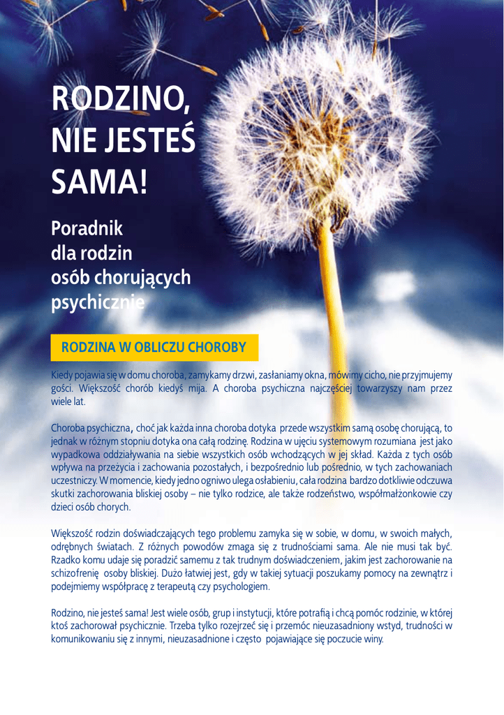 RODZINO, NIE JESTEŚ SAMA! Poradnik dla rodzin osób chorujących psychicznie RODZINA W OBLICZU CHOROBY Kiedy pojawia się w domu choroba, zamykamy drzwi, zasłaniamy okna, mówimy cicho, nie przyjmujemy gości. Większość chorób kiedyś mija. A choroba psychiczna najczęściej towarzyszy nam przez wiele lat. Choroba psychiczna, choć jak każda inna choroba dotyka przede wszystkim samą osobę chorującą, to jednak w różnym stopniu dotyka ona całą rodzinę. Rodzina w ujęciu systemowym rozumiana jest jako wypadkowa oddziaływania na siebie wszystkich osób wchodzących w jej skład. Każda z tych osób wpływa na przeżycia i zachowania pozostałych, i bezpośrednio lub pośrednio, w tych zachowaniach uczestniczy. W momencie, kiedy jedno ogniwo ulega osłabieniu, cała rodzina bardzo dotkliwie odczuwa skutki zachorowania bliskiej osoby – nie tylko rodzice, ale także rodzeństwo, współmałżonkowie czy dzieci osób chorych. Większość rodzin doświadczających tego problemu zamyka się w sobie, w domu, w swoich małych, odrębnych światach. Z różnych powodów zmaga się z trudnościami sama. Ale nie musi tak być. Rzadko komu udaje się poradzić samemu z tak trudnym doświadczeniem, jakim jest zachorowanie na schizofrenię osoby bliskiej. Dużo łatwiej jest, gdy w takiej sytuacji poszukamy pomocy na zewnątrz i podejmiemy współpracę z terapeutą czy psychologiem. Rodzino, nie jesteś sama! Jest wiele osób, grup i instytucji, które potrafią i chcą pomóc rodzinie, w której ktoś zachorował psychicznie. Trzeba tylko rozejrzeć się i przemóc nieuzasadniony wstyd, trudności w komunikowaniu się z innymi, nieuzasadnione i często pojawiające się poczucie winy. ROZMAWIAJMY ZE SPECJALISTĄ Najczęściej pierwszą osobą, z którą kontaktujemy się po ujawnieniu się choroby, jest lekarz. Pamiętajmy, że lekarz, psycholog, pielęgniarka to osoby nie tylko od przepisywania i podawania leków. Będziemy się z nimi kontaktować wielokrotnie. Spróbujmy traktować ich jak partnerów, z którymi wspólnie rozwiązujemy problemy chorego. Negatywne objawy schizofrenii: • brak napędu • trudności w planowaniu • bladość emocjonalna • izolowanie się od ludzi • zaburzenia nastroju • spłycenie uczuć wyższych Nie koncentrujmy się tylko na zewnętrznych, fizycznych, najbardziej widocznych czy uciążliwych objawach choroby i skutkach ubocznych działania leków. Rozmawiajmy ze specjalistą o potrzebach psychicznych chorego, jego relacjach z innymi, o naszych uczuciach, zmianach, jakie choroba poczyniła w naszej rodzinie. Najczęstsze problemy związane ze schizofrenią i obszary wymagające pracy: • niska samoocena • brak przyjaciół • brak pracy • depresja • zaburzenia rytmu snu i czuwania • skutki uboczne brania leków • trudności w rozporządzaniu pieniędzmi • nieumiejętność planowania przyszłości Zapytajmy także o możliwość uzyskania wsparcia dla siebie jako rodziny chorego — nie bójmy się przyznać do tego, że jest nam ciężko — nie musimy sobie ze wszystkim radzić. Skorzystajmy z bogatego doświadczenia profesjonalistów — oni współpracują z wieloma rodzinami, w których występuje problemem choroby psychicznej. Na pewno potrafią i chcą pomóc również naszej. POSZUKAJMY MIEJSC, GDZIE OSOBA CHORA CZUJE SIĘ BEZPIECZNIE Nieocenioną rolę pełnią ośrodki, stowarzyszenia czy kluby, na przykład Środowiskowe Domy Samopomocy, w których osoby cierpiące na schorzenia psychiczne uczestniczą w zajęciach przygotowanych i prowadzonych specjalnie dla nich. Codzienne problemy w rodzinie wynikające z choroby jednego z jej członków: • nieracjonalne gospodarowanie pieniędzmi • gromadzenie niepotrzebnych przedmiotów • trudności w podejmowaniu decyzji • trudności w podejmowaniu aktywności Są to na przykład: treningi umiejętności społecznych, treningi budżetowe, lekowe, grupy dyskusyjne, terapia zajęciowa, warsztaty odpowiadające zainteresowaniom itp. Placówki te przynoszą ogromne korzyści swoim podopiecznym, ale są również bardzo potrzebne bliskim osób chorych. Świadomość, że nie jesteśmy zdani na własne siły, że możemy liczyć na specjalistów, że nasz bliski przebywa w miejscu bezpiecznym i przyjaznym, nawet gdy rodziny nie ma w pobliżu, daje nam tak potrzebny „oddech” i możliwość podjęcia np. obowiązków zawodowych bez poczucia winy, że zaniedbujemy chorego. Nie zapominajmy także o instytucjach, stowarzyszeniach czy klubach, w których ludzie spotykają się, spędzają razem czas, wspierają się wzajemnie, o instytucjach nieukierunkowanych bezpośrednio na problematykę rehabilitacji chorób psychicznych. Udział w spotkaniach np. wspólnoty religijnej kładącej nacisk na duchowe aspekty naszego życia może okazać się nieoceniony w chwilach, gdy zadajemy sobie fundamentalne pytania: „Co to jest cierpienie?”, „Gdzie szukać sensu ludzkiego życia?”, „Jakie wartości są dla mnie najważniejsze?”. A właśnie takie pytania pojawiają się w momencie, gdy kogoś z naszych bliskich dotyka poważna, przewlekła choroba. STARAJMY SIĘ BYĆ RAZEM Podobnie jak wszyscy ludzie, osoby chore psychicznie potrzebują i rozwijają się poprzez doświadczenie bycia wśród bliskich. Przeżywają własne reakcje na wydarzenia zewnętrze, np. śmierć ukochanego psa, czy też reakcji pochodzących z wewnątrz organizmu, np. pragnienia seksualne, trema itp. Aby pomóc osobie chorej psychicznie trzeba być: • autentycznym • empatycznym • akceptującym Osoba chora psychicznie otrzymuje etykietę chorego i taką bierną rolę podejmuje. Wycofuje się z relacji społecznych, przez co jej uczestniczenie w świecie staje się szczególnie trudne. Utrudniony jest kontakt z innymi ludźmi, utrudnione jest kreatywne zachowanie, podejmowanie nowych aktywności społecznych. Współbycie z chorym to przede wszystkim: • bliskość uczuciowa • dawanie poczucia 
