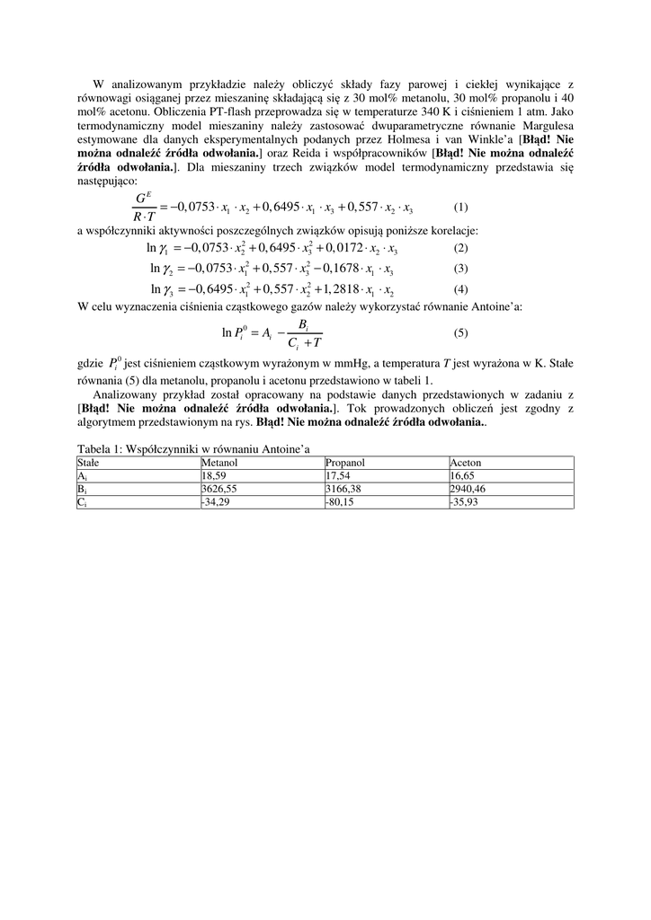 W analizowanym przykładzie należy obliczyć składy fazy parowej i ciekłej wynikające z równowagi osiąganej przez mieszaninę składającą się z 30 mol% metanolu, 30 mol% propanolu i 40 mol% acetonu. Obliczenia PT-flash przeprowadza się w temperaturze 340 K i ciśnieniem 1 atm. Jako termodynamiczny model mieszaniny należy zastosować dwuparametryczne równanie Margulesa estymowane dla danych eksperymentalnych podanych przez Holmesa i van Winkle’a [Błąd! Nie można odnaleźć źródła odwołania.] oraz Reida i współpracowników [Błąd! Nie można odnaleźć źródła odwołania.]. Dla mieszaniny trzech związków model termodynamiczny przedstawia się następująco: GE = −0, 0753 ⋅ x1 ⋅ x2 + 0, 6495 ⋅ x1 ⋅ x3 + 0, 557 ⋅ x2 ⋅ x3 R ⋅T (1) a współczynniki aktywności poszczególnych związków opisują poniższe korelacje: ln γ 1 = −0, 0753 ⋅ x22 + 0, 6495 ⋅ x32 + 0, 0172 ⋅ x2 ⋅ x3 (2) ln γ 2 = −0, 0753 ⋅ x12 + 0,557 ⋅ x32 − 0,1678 ⋅ x1 ⋅ x3 2 1 (3) 2 2 ln γ 3 = −0, 6495 ⋅ x + 0,557 ⋅ x + 1, 2818 ⋅ x1 ⋅ x2 (4) W celu wyznaczenia ciśnienia cząstkowego gazów należy wykorzystać równanie Antoine’a: ln Pi 0 = Ai − Bi Ci + T (5) gdzie Pi 0 jest ciśnieniem cząstkowym wyrażonym w mmHg, a temperatura T jest wyrażona w K. Stałe równania (5) dla metanolu, propanolu i acetonu przedstawiono w tabeli 1. Analizowany przykład został opracowany na podstawie danych przedstawionych w zadaniu z [Błąd! Nie można odnaleźć źródła odwołania.]. Tok prowadzonych obliczeń jest zgodny z algorytmem przedstawionym na rys. Błąd! Nie można odnaleźć źródła odwołania.. Tabela 1: Współczynniki w równaniu Antoine’a Stałe Ai Bi Ci Metanol 18,59 3626,55 -34,29 Propanol 17,54 3166,38 -80,15 Aceton 16,65 2940,46 -35,93