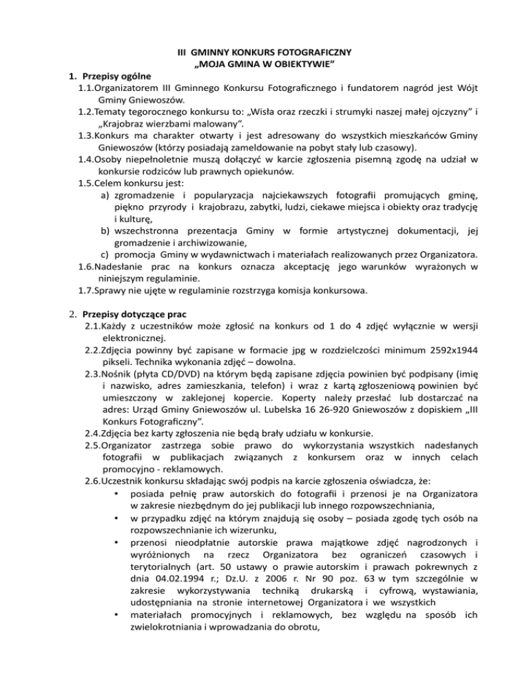 III GMINNY KONKURS FOTOGRAFICZNY „MOJA GMINA W OBIEKTYWIE” 1. Przepisy ogólne 1.1.Organizatorem III Gminnego Konkursu Fotograficznego i fundatorem nagród jest Wójt Gminy Gniewoszów. 1.2.Tematy tegorocznego konkursu to: „Wisła oraz rzeczki i strumyki naszej małej ojczyzny” i „Krajobraz wierzbami malowany”. 1.3.Konkurs ma charakter otwarty i jest adresowany do wszystkich mieszkańców Gminy Gniewoszów (którzy posiadają zameldowanie na pobyt stały lub czasowy). 1.4.Osoby niepełnoletnie muszą dołączyć w karcie zgłoszenia pisemną zgodę na udział w konkursie rodziców lub prawnych opiekunów. 1.5.Celem konkursu jest: a) zgromadzenie i popularyzacja najciekawszych fotografii promujących gminę, piękno przyrody i krajobrazu, zabytki, ludzi, ciekawe miejsca i obiekty oraz tradycję i kulturę, b) wszechstronna prezentacja Gminy w formie artystycznej dokumentacji, jej gromadzenie i archiwizowanie, c) promocja Gminy w wydawnictwach i materiałach realizowanych przez Organizatora. 1.6.Nadesłanie prac na konkurs oznacza akceptację jego warunków wyrażonych w niniejszym regulaminie. 1.7.Sprawy nie ujęte w regulaminie rozstrzyga komisja konkursowa. 2. Przepisy dotyczące prac 2.1.Każdy z uczestników może zgłosić na konkurs od 1 do 4 zdjęć wyłącznie w wersji elektronicznej. 2.2.Zdjęcia powinny być zapisane w formacie jpg w rozdzielczości minimum 2592x1944 pikseli. Technika wykonania zdjęć – dowolna. 2.3.Nośnik (płyta CD/DVD) na którym będą zapisane zdjęcia powinien być podpisany (imię i nazwisko, adres zamieszkania, telefon) i wraz z kartą zgłoszeniową powinien być umieszczony w zaklejonej kopercie. Koperty należy przesłać lub dostarczać na adres: Urząd Gminy Gniewoszów ul. Lubelska 16 26-920 Gniewoszów z dopiskiem „III Konkurs Fotograficzny”. 2.4.Zdjęcia bez karty zgłoszenia nie będą brały udziału w konkursie. 2.5.Organizator zastrzega sobie prawo do wykorzystania wszystkich nadesłanych fotografii w publikacjach związanych z konkursem oraz w innych celach promocyjno - reklamowych. 2.6.Uczestnik konkursu składając swój podpis na karcie zgłoszenia oświadcza, że: • posiada pełnię praw autorskich do fotografii i przenosi je na Organizatora w zakresie niezbędnym do jej publikacji lub innego rozpowszechniania, • w przypadku zdjęć na którym znajdują się osoby – posiada zgodę tych osób na rozpowszechnianie ich wizerunku, • przenosi nieodpłatnie autorskie prawa majątkowe zdjęć nagrodzonych i wyróżnionych na rzecz Organizatora bez ograniczeń czasowych i terytorialnych (art. 50 ustawy o prawie autorskim i prawach pokrewnych z dnia 04.02.1994 r.; Dz.U. z 2006 r. Nr 90 poz. 63 w tym szczególnie w zakresie wykorzystywania techniką drukarską i cyfrową, wystawiania, udostępniania na stronie internetowej Organizatora i we wszystkich • materiałach promocyjnych i reklamowych, bez względu na sposób ich zwielokrotniania i wprowadzania do obrotu, zdjęcia nie były wcześniej nigdzie publikowane, wyraża zgodę na przetwarzanie i udostępnianie swoich danych osobowych: imię, nazwisko, adres zamieszkania – ustawa o ochronie danych osobowych z dnia 29 sierpnia 1997 r. (Dz. U. Nr 133, poz. 833 z późn. zm.). b) 2.7. Nośniki ze zdjęciami przechodzą na własność Organizatora. 3. Terminarz 3.1.Termin nadsyłania prac upływa dnia 31.07.2017 r. (decyduje data złożenia w siedzibie Organizatora – Urząd Gminy w Gniewoszowie, sekretariat). 3.2.Prace nadesłane po terminie nie będą brały udziału w konkursie. 3.3.Oceny zdjęć i wyboru nagrodzonych i wyróżnionych dokona powołana przez Organizatora komisja konkursowa. 3.4. Ocena prac odbędzie się do dnia 10.08.2017 r. Decyzja komisji jest ostateczna i nie podlega weryfikacji. 3.5. O wynikach konkursu laureaci zostaną powiadomieni dnia 21.08.2017 r. na wystawie pokonkursowej. 3.6. Wyniki konkursu zostaną również zamieszczone na stronie internetowej Gminy Gniewoszów www.gniewoszow.pl oraz lokalnym biuletynie. 4. Nagrody i wyróżnienia Organizator przewiduje przyznanie nagród rzeczowych: I miejsca – Nagroda o wartości do 300 zł II miejsca – Nagroda o wartości do 200 zł III miejsca – Nagroda o wartości do 100 zł 4.1.Nagrodzonemu nie przysługuje prawo do żądania ekwiwalentu pieniężnego za przyznaną nagrodę. 4.2. Organizator zastrzega sobie prawo nie przyznania, którejś z nagród w konkursie. 5. Pozostałe informacje 5.1.Regulamin i karty zgłoszeń można odbierać w Urzędzie Gminy w Gniewoszowie (sekretariat) oraz pobierać ze strony internetowej www.gniewoszow.pl 5.2.Szczegółowe informacji można uzyskać wysyłając email na adres: [email protected] 5.3.Załączniki: karta zgłoszenia. • • KARTA ZGŁOSZENIA do III GMINNEGO KONKURSU FOTOGRAFICZNEGO „MOJA GMINA W OBIEKTYWIE” organizowanego przez Gminę Gniewoszów ................................................. ............................. ...................................... Imię i nazwisko telefon adres e-mail ............................................................ adres zamieszkania/korespondencji .................................................. data urodzenia ..................................................... ............................................. .................................... miejsce wykonania zdjęcia nr 1 tytuł zdjęcia data wykonania ..................................................... ............................................. .................................... miejsce wykonania zdjęcia nr 1 tytuł zdjęcia data wykonania ..................................................... ............................................. .................................... miejsce wykonania zdjęcia nr 1 tytuł zdjęcia data wykonania OŚWIADCZENIE Ja, niżej podpisana(y), oświadczam, że jestem autorem i wyłącznym właścicielem, dostarczonych zdjęć. Gminie Gniewoszów przekazuję prawa autorskie w zakresie niezbędnym do 