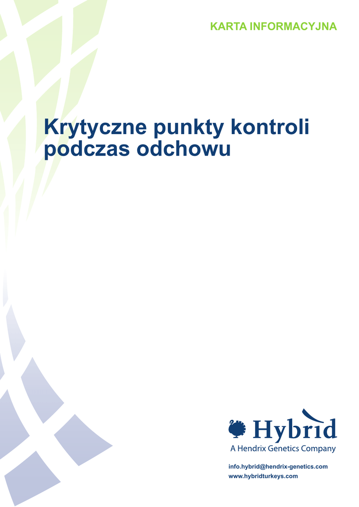 KARTA INFORMACYJNA Krytyczne punkty kontroli podczas odchowu [email protected] www.hybridturkeys.com KRYTYCZNE PUNKTY KONTROLI PODCZAS ODCHOWU Zarządzanie hodowlą podczas pierwszych kilku tygodni życia piskląt będzie miało zasadniczy wpływ na to, czy zwierzęta zrealizują swój pełny potencjał produkcyjny. Chociaż prawdą jest, że nawet dobrze rokujące stado może być zagrożone na każdym etapie cyklu produkcyjnego, ptaki, które nie miały dobrego startu, nie będą w stanie nadrobić strat ani wyrównać poziom wzrostu przed osiągnięciem dojrzałości rynkowej. Hodowcy mają dobrą wiedzę na temat dziennych przyrostów wagowych i ich znaczenia, ale rzadko przekładają te parametry na średni przyrost godzinowy. Należy zastanowić się, co to oznacza. Każda godzina i każdy dzień, w którym warunki środowiskowe nie są dla piskląt optymalne, oznacza straconą szansę produkcyjną, za którą hodowca już zapłacił. Do KPK należą: W środowisku hodowlanym indyków komercyjnych obecnych jest wiele rodzajów czynników stresogennych. Najczęściej przeoczanym z nich jest sama kwestia wzrostu. Na pytanie o największe natężenie stresu związanego ze wzrostem większość producentów odpowie, że przypada on na około 15 tydzień życia piskląt, ponieważ wtedy wzrastająca masa ciała zaczyna być łatwo zauważalna. Choć faktycznie ptaki maksymalnie przybierają na wadze w bardzo krótkim czasie, to indorki rosną najbardziej dynamicznie około 3 tygodnia życia. To właśnie wtedy procentowy przyrost metabolicznej masy ciała (masa ciała podniesiona do 0,67 potęgi) jest największy. Każdy, kto zajmuje się hodowlą piskląt lub szkoli inne osoby w tym zakresie, doskonale wie, że jest to zarówno sztuka, jak i nauka. Każde stado jest inne, a aby ocenić zachowanie piskląt i ich bieżące potrzeby, niezbędne są duże umiejętności w zakresie hodowli indyków. Należy zawsze pamiętać o tym, że ptak nie może zmienić swojego środowiska – może jedynie na nie reagować. Ważne jest, by zdawać sobie sprawę z tego, że od 1 do 5% osobników w każdym stadzie będzie miało problemy z właściwym startem i będzie wymagało większej opieki i zaangażowania hodowcy niż reszta stada. W porównaniu z kurczętami wszystkie pisklęta indyka mogłyby zostać uznane za trudne w pierwszym etapie życia. Jednym z często zadawanych pytań jest: czy obecnie pisklęta indyka są trudniejsze w hodowli niż jeszcze 10 lat temu? Stosowana często inżynieria genetyczna spowodowała, że indyk komercyjny z całą pewnością się zmienił, ale zmianom uległy również metody hodowli, często po to, aby zaoszczędzić pracy. Nie chodzi o to, że wcześniejsze metody były nieskuteczne, ale często były one po prostu zbyt czasochłonne, na co obecnie nie można sobie pozwolić. Krótko mówiąc, zmiany przeprowadzane są ze względu na ludzi, a nie na pisklęta. Z powodu dynamicznego wzrostu pisklęta są szczególnie narażone na negatywne skutki nieprawidłowego zarządzania hodowlą, takie jak słaba jakość powietrza, ściółki i wody, pasza złej jakości oraz niebezpieczeństwa związane z chorobami. Ponadto nawet drobne niedociągnięcia będą miały skutki w postaci spowolnionego wzrostu i niedostatecznych wyników produkcyjnych w tym okresie. Dlatego właśnie pierwsze 3 tygodnie życia piskląt mają tak duże znaczenie dla przyszłych wyników hodowlanych stada. Należy dołożyć wszelkich starań, aby zmaksymalizować wykorzystanie potencjału zwierząt zanim będzie za późno. Jedną z najlepszych inwestycji hodowcy w tym okresie jest optymalizacja warunków bytowania piskląt. Niniejsza prezentacja przedstawia krytyczne punkty kontroli (KPK) podczas odchowu. Punkty KPK należy traktować jako strategiczne czynniki procesu produkcyjnego. Jeśli zostaną poprawnie wdrożone, ich efektem będzie zdrowe, jednorodne, pełne wigoru stado oraz współczynnik konwersji paszy i średnie dzienne przyrosty masy ciała, które spełniają lub wykraczają poza standardowe wartości. Krótko mówiąc, KPK są elementem wzorcowego programu zarządzania hodowlą i pomagają zagwarantować wysoką jakość stada. Aby można było ocenić, czy KPK są wdrażane poprawnie, muszą one być mierzalne i udokumentowane. • przygotowanie indycznika na przybycie piskląt, • ocena jakości piskląt, • temperatury odchowu, • wentylacja indycznika. Dostępność i jakość paszy oraz wody Jeżeli hodowca ma pozytywny stosunek do swojej pracy, spodziewając się po hodowli najlepszych efektów, a jednocześnie przewidując najgorsze scenariusze, będzie gotowy, by hodować nawet najtrudniejsze pisklęta z dobrym skutkiem. W dalszej części niniejszego materiału znajduje się analiza 5 krytycznych punktów kontroli, w której omówiono metody ich audytu. KARTA INFORMACYJNA | KRYTYCZNE PUNKTY KONTROLI PODCZAS ODCHOWU | 2 KRYTYCZNE PUNKTY KONTROLI PODCZAS ODCHOWU Przygotowanie indycznika na przybycie piskląt Odchów piskląt rozpoczyna się na długo przed ich przybyciem na fermę. W rzeczywistości jest to dzień, gdy poprzedzające stado opuszcza indycznik. Mycie i dezynfekcja Jednodniowe pisklęta indyka są niezwykle wrażliwe nawet na nieznaczną ilość chorobotwórczych organizmów (bakterii, pleśni, wirusów). Z tego powodu niezwykle ważne jest, aby cały indycznik został dokładnie umyty i zdezynfekowany. Obszary, które są często pomijane to pomieszczenia wejściowe, linie pojenia i poidła, linie żywienia, panele elektryczne i osłony wentylatorów wyciągowych. Po dezynfekcji należy okresowo pobierać z indycznika wymazy, aby mieć pewność, że stosowane procedury i preparaty są skuteczne. Każdorazowo przed wstawieniem piskląt należy dokonać oględzin indycznika, korygując wszelkie braki i niedociągnięcia. Ważne jest także, aby biura fermy, pomieszczenia magazynowe, warsztaty i inne tego typu obiekty były regularnie myte i dezynfek