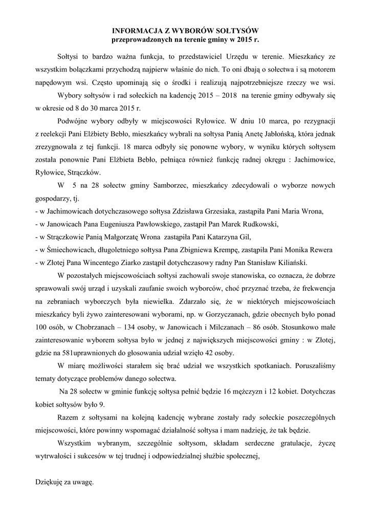 INFORMACJA Z WYBORÓW SOŁTYSÓW przeprowadzonych na terenie gminy w 2015 r. Sołtysi to bardzo ważna funkcja, to przedstawiciel Urzędu w terenie. Mieszkańcy ze wszystkim bolączkami przychodzą najpierw właśnie do nich. To oni dbają o sołectwa i są motorem napędowym wsi. Często upominają się o środki i realizują najpotrzebniejsze rzeczy we wsi. Wybory sołtysów i rad sołeckich na kadencję 2015 – 2018 na terenie gminy odbywały się w okresie od 8 do 30 marca 2015 r. Podwójne wybory odbyły w miejscowości Ryłowice. W dniu 10 marca, po rezygnacji z reelekcji Pani Elżbiety Bebło, mieszkańcy wybrali na sołtysa Panią Anetę Jabłońską, która jednak zrezygnowała z tej funkcji. 18 marca odbyły się ponowne wybory, w wyniku których sołtysem została ponownie Pani Elżbieta Bebło, pełniąca również funkcję radnej okręgu : Jachimowice, Ryłowice, Strączków. W 5 na 28 sołectw gminy Samborzec, mieszkańcy zdecydowali o wyborze nowych gospodarzy, tj. - w Jachimowicach dotychczasowego sołtysa Zdzisława Grzesiaka, zastąpiła Pani Maria Wrona, - w Janowicach Pana Eugeniusza Pawłowskiego, zastąpił Pan Marek Rudkowski, - w Strączkowie Panią Małgorzatę Wrona zastąpiła Pani Katarzyna Gil, - w Śmiechowicach, długoletniego sołtysa Pana Zbigniewa Krempę, zastąpiła Pani Monika Rewera - w Złotej Pana Wincentego Ziarko zastąpił dotychczasowy radny Pan Stanisław Kiliański. W pozostałych miejscowościach sołtysi zachowali swoje stanowiska, co oznacza, że dobrze sprawowali swój urząd i uzyskali zaufanie swoich wyborców, choć przyznać trzeba, że frekwencja na zebraniach wyborczych była niewielka. Zdarzało się, że w niektórych miejscowościach mieszkańcy byli żywo zainteresowani wyborami, np. w Gorzyczanach, gdzie obecnych było ponad 100 osób, w Chobrzanach – 134 osoby, w Janowicach i Milczanach – 86 osób. Stosunkowo małe zainteresowanie wyborem sołtysa było w jednej z największych miejscowości gminy : w Złotej, gdzie na 581uprawnionych do głosowania udział wzięło 42 osoby. W miarę możliwości starałem się brać udział we wszystkich spotkaniach. Poruszaliśmy tematy dotyczące problemów danego sołectwa. Na 28 sołectw w gminie funkcję sołtysa pełnić będzie 16 mężczyzn i 12 kobiet. Dotychczas kobiet sołtysów było 9. Razem z sołtysami na kolejną kadencję wybrane zostały rady sołeckie poszczególnych miejscowości, które powinny wspomagać działalność sołtysa i mam nadzieję, że tak będzie. Wszystkim wybranym, szczególnie sołtysom, składam serdeczne gratulacje, życzę wytrwałości i sukcesów w tej trudnej i odpowiedzialnej służbie społecznej, Dziękuję za uwagę.