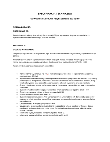 SPECYFIKACJA TECHNICZNA ODWODNIENIE LINIOWE Recyfix Standard 100 typ 60 NAZWA ZADANIA: PRZEDMIOT ST: Przedmiotem niniejszej Specyfikacji Technicznej (ST) są wymagania dotyczące materiałów do wykonania odwodnienia liniowego, oraz ich montażu. MATERIAŁY: OGÓLNE WYMAGANIA: Dla powyższego obiektu ze względu na jego przeznaczenie dobrano koryta i ruszty o parametrach jak poniżej. Materiały stosowane do wykonania odwodnień liniowych muszą posiadać deklarację zgodności z normą europejską dopuszczającą produkty do stosowania w budownictwie tj. PN EN 1433. Parametry techniczne zastosowanych produktów: • • • • • • • • • • • Korpus koryta wykonany z PE-PP, o wymiarach jak w tabe li nr 1, o powierzchni przekroju poprzecznego 35 CM2 System odwodnienia liniowego winien posiadać możliwość połączenia elementów za pomocą pióra i wpustu. Połączenie pióro wpust powinno umożliwiać doszczelnienia za pomocą masy trwale elastycznej oraz pozwolić na sprawdzenie jakości wykonania prac po montażu. Ściany i dno koryta muszą być wyposażone w żebrowanie zapewniające trwałe połączenie z zabudową System odwodnienia liniowego powinien być trwale oznakowany zgodnie z EN 1433 Ruszty: wykonane z żeliwa, w klasie obciążenia C250 Powierzchnia wlotowa rusztu 444 CM2 System mocowania rusztów Anty Vandal powinien uniemożliwić ich demontaż przez osoby postronne, a jednocześnie pozwolić na skuteczne czyszczenie/serwisowanie sytemu służbą porządkowym. Grubość rusztu w miejscu podparcia: 5 mm Uzupełnienie systemu stanowią studzienki wyposażone w kosz osadczy wykonany dające możliwość podłączenia koryta z obu stron. Ponadto elementy dodatkowe takie jak syfony i ścianki czołowe. Minimalna wytrzymałość na temperaturę stałą 80 st. C. Minimalna wytrzymałość na temperaturę chwilową 95 st. C. ZABUDOWA: Odwodnienie liniowe należy wykonać zgodnie z dokumentacją projektową, oraz ściśle z zaleceniami producenta dostarczającego materiał. W tym celu należy ustalić z dostawcą materiałów warunki zabudowy uwzględniając klasę obciążenia oraz rodzaj nawierzchni przylegającej Koryta wykonane są z PE-PP pochodzącego z procesu recyklingu i przeznaczone są do zabudowy w klasie wytrzymałości C250. Dzięki zastosowanemu materiałowi koryta są lekkie i łatwe w montażu Korpusy posiadają żebrowanie poprzeczne i podłużne dające stabilne połączenie z opaską betonową, zabezpieczające przed przesuwaniem korytka. Ponadto mają prefabrykowane profile do podłączeń kątowych oraz odpływowych w korpusie .Dno korpusów koryt , którym prowadzona jest woda jest bezspadkowe. Korpusy są odporne na działanie środków chemicznych rozpuszczonych w wodzie, między innymi benzyny, kwasu akumulatorowego, oleju napędowego, wody morskiej . W trakcie zabudowy ciągu odwodnienia fugi należy wypełnić materiałem trwale elastycznym, odpornym na długotrwałe działanie wody. W przypadku zastosowania innego niż powyższe rozwiązania, należy stosować materiały o takich samy lub lepszych parametrach technicznych i przedstawić stosowne dokumenty projektantowi i inspektorowi nadzoru w celu zatwierdzenia. TABELA NR 1: Kanały odwodnienia liniowego, materiał: Kanały odwodnienia liniowego, wymiary: Długość korpusu [mm] Szerokość wewnętrzna korpusu [mm] Szerokość zewnętrzna korpusu [mm] Wysokość zewnętrzna korpusu [mm] Wysokość wewnętrzna korpusu [mm] Powierzchnia przekroju poprzecznego koryt w przestrzeni prowadzenia wody [cm2] Waga pojedynczego korpusu odwodnienia liniowego [kg] Materiał ramy korytek odwodnienia liniowego Pojemność kanałów odwodnienia, minimum [l/m] Rodzaj rusztów odwodnienia liniowego Materiał rusztu Wymiary otworów wlotowych rusztów Powierzchnia wlotowa rusztów, min [cm2] Wytrzymałość systemu odwodnienia po zabudowie, min. Nasiąkliwość korpusu odwodnienia liniowego [%] System mocowania rusztów do korpusu Ruszt pokryty powłoką galwaniczną KTL PE-PP 1000 z możliwością docięcia na dowolny wymiar 100 146 60 40 35 1 PE-PP 3,5 Ruszt kratowy Żeliwo sferoidalne 20 mm / 30 mm 444 C250 0,00 (nienasiąkliwe) Blokada śrubowa NIE