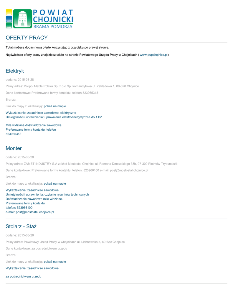 OFERTY PRACY Tutaj możesz dodać nową ofertę korzystając z przycisku po prawej stronie. Najświeższe oferty pracy znajdziesz także na stronie Powiatowego Urzędu Pracy w Chojnicach ( www.pupchojnice.pl) Elektryk dodane: 2015-08-28 Pełny adres: Polipol Meble Polska Sp. z o.o Sp. komandytowa ul. Zakładowa 1, 89-620 Chojnice Dane kontaktowe: Preferowane formy kontaktu: telefon 523965318 Branża: Link do mapy z lokalizacją: pokaż na mapie Wykształcenie: zasadnicze zawodowe, elektryczne Umiejętności i uprawnienia: uprawnienia elektroenergetyczne do 1 kV Mile widziane doświadczenie zawodowe. Preferowane formy kontaktu: telefon 523965318 Monter dodane: 2015-08-28 Pełny adres: ZAMET INDUSTRY S.A zakład Mostostal Chojnice ul. Romana Dmowskiego 38b, 97-300 Piotrków Trybunalski Dane kontaktowe: Preferowane formy kontaktu: telefon: 523966100 e-mail: [email protected] Branża: Link do mapy z lokalizacją: pokaż na mapie Wykształcenie: zasadnicze zawodowe Umiejętności i uprawnienia: czytanie rysunków technicznych Doświadczenie zawodowe mile widziane. Preferowane formy kontaktu: telefon: 523966100 e-mail: [email protected] Stolarz - Staż dodane: 2015-08-28 Pełny adres: Powiatowy Urząd Pracy w Chojnicach ul. Lichnowska 5, 89-620 Chojnice Dane kontaktowe: za pośrednictwem urzędu Branża: Link do mapy z lokalizacją: pokaż na mapie Wykształcenie: zasadnicze zawodowe za pośrednictwem urzędu Spawacz MAG 135 dodane: 2015-08-28 Pełny adres: ZAMET INDUSTRY S.A zakład Mostostal Chojnice ul. Romana Dmowskiego 38b, 97-300 Piotrków Trybunalski Dane kontaktowe: Preferowane formy kontaktu: telefon: 52 396 61 00, 52 396 61 23 e-mail:[email protected] Branża: Link do mapy z lokalizacją: pokaż na mapie Wykształcenie: zasadnicze zawodowe Umiejętności i uprawnienia: spawanie metodą MAG 135 Umiejętności i uprawnienia: spawanie w osłonie gazów Doświadczenie min. 2 lata Preferowane formy kontaktu: telefon: 52 396 61 00, 52 396 61 23 e-mail:[email protected] Spawacz dodane: 2015-08-28 Pełny adres: ZAMET INDUSTRY S.A zakład Mostostal Chojnice ul. Romana Dmowskiego 38b, 97-300 Piotrków Trybunalski Dane kontaktowe: Preferowane formy kontaktu: telefon: 052 396 61 00 e-mail: [email protected] Branża: Link do mapy z lokalizacją: pokaż na mapie Wykształcenie: zasadnicze zawodowe, techniczne Wykształcenie zawodowe lub średnie techniczne, postawowe uprawnienia MAG 135, znajomośc rysunku technicznego, umiejetność spawania w osłoniec gazów, umiejętności manualne, determinacja w nauce zawodu, stan zdrowia pozwalacjący na pracę na wyskości pow. 3 m. Preferowane formy kontaktu: telefon: 052 396 61 00 e-mail: [email protected] Lakiernik dodane: 2015-08-28 Pełny adres: Powiatowy Urząd Pracy w Chojnicach ul. Lichnowska 5, 89-620 Chojnice Dane kontaktowe: za pośrednictwem urzędu Branża: Link do mapy z lokalizacją: pokaż na mapie Wykształcenie: zasadnicze zawodowe Doświadczenie zawodowe mile widziane, umiejetność obsługi urzadzeñ lakierniczych. za pośrednictwem urzędu Magazynier dodane: 2015-08-28 Pełny adres: "DREW-TRANS II" Zenon Wrzeszcz i wspólnicy spółka zo.o. ul. Składowa 12, 89-620 Chojnice Dane kontaktowe: Preferowane formy kontaktu: osobiście, e-mail: [email protected] Branża: Link do mapy z lokalizacją: pokaż na mapie Zakres obowiązków: Obsługa magazynu, rozładunek , załadunek. Preferowane formy kontaktu: osobiście, e-mail: [email protected] Stolarz dodane: 2015-08-28 Pełny adres: "DREW-TRANS II" Zenon Wrzeszcz i wspólnicy spółka zo.o. ul. Składowa 12, 89-620 Chojnice Dane kontaktowe: Preferowane formy kontaktu: osobiście, e-mail: [email protected] Branża: Link do mapy z lokalizacją: pokaż na mapie Wykształcenie: zasadnicze zawodowe, inne Wykształcenie min. zawodowe, umiejętność posługiwania się maszynami, narzędziami, mile widziane doświadczenie i znajomość języka obcego. Preferowane formy kontaktu: osobiście, e-mail: [email protected] Menadżer dodane: 2015-08-28 Pełny adres: Doradztwo Ubezpieczeniowe Urszula Kuhn 77-300 Nieżywięć 41 Dane kontaktowe: Preferowane formy kontaktu: telefon 696 057 226 Branża: Link do mapy z lokalizacją: pokaż na mapie Wykształcenie: średnie zawodowe Wykształcenie: wyższe (w tym licencjat) mile widziane doświadczenie w sprzedaży, łatwość w nawiązywaniu kontaktów Preferowane formy kontaktu: telefon 696 057 226 Lakiernik przemysłowy dodane: 2015-08-27 Pełny adres: "CMT" CHOJNICE Sp. z o.o. ul. Zakładowa 6, 89-600 Chojnice Dane kontaktowe: Preferowane formy kontaktu: osobiście Branża: Link do mapy z lokalizacją: pokaż na mapie Wykształcenie: zasadnicze zawodowe Udokumentowany staż pracy na podobnym stanowisku, umiejętność obsługi urządzeñ natryskowych Preferowane formy kontaktu: osobiście Pomoc laboratoryjna dodane: 2015-08-27 Pełny adres: Powiatowy Urząd Pracy w Chojnicach ul. Lichnowska 5, 89-620 Chojnice Dane kontaktowe: za pośrednictwem urzędu Branża: Link do mapy z lokalizacją: pokaż na mapie Wykształcenie: średnie zawodowe Umiejętności i uprawnienia: książeczka sanepidowska Oferta realizaowana w ramach programu PO WER dla osób do 30 r.ż. za pośrednictwem urzędu Operator piły taśmowej dodane: 2015-08-27 Pełny adres: PRZEDSIĘBIORSTWO WIELOBRANŻOWE "SKALA" sp. j. ul. Polna 3, 89-632 Brusy Dane kontaktowe: tel. 059 8620897 Branża: Link do mapy z lokalizacją: pokaż na mapie Wykształcenie: zasadnicze zawodowe, inne mile widziane doświadczenie pół roku tel. 059 8620897 Operator robotów spawalniczych dodane: 2015-08-27 Pełny adres: PRZEDSIĘBIORSTWO WIELOBRANŻOWE "SKALA" sp. j. ul. Polna 3, 89-632 Brusy Dane kontaktowe: tel. 059 8620897 Branża: Link do mapy z lokalizacją: pokaż na mapie Wykształcenie: zasadnicze zawodowe, inne mile widziane doświadczenie pół roku tel. 059 8620897 Asystent nauczyciela przedszkola - staż dodane: 2015-08-27 Pełny adres: Powiatowy Urząd Pracy w Chojnicach ul. Lichnowska 5, 89-620 Chojnice