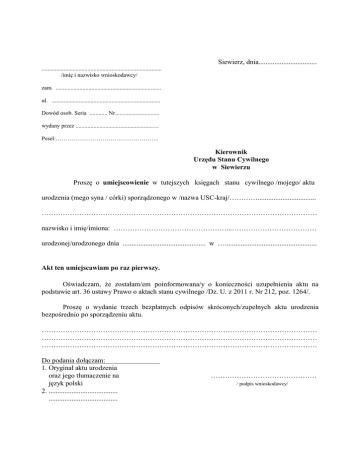 Siewierz, dnia................................. ................................................................................. /imię i nazwisko wnioskodawcy/ zam. ....................................................................... ul. ......................................................................... Dowód osob. Seria ............ Nr.............................. wydany przez ........................................................ Pesel:…………………………………………….. Kierownik Urzędu Stanu Cywilnego w Siewierzu Proszę o umiejscowienie w tutejszych księgach stanu cywilnego /mojego/ aktu urodzenia (mego syna / córki) sporządzonego w /nazwa USC-kraj/…………................................. ……………………………………………………………………………………………………… nazwisko i imię/imiona: …………………………………………...……………………………… urodzonej/urodzonego dnia ............................................... w ….................................................... Akt ten umiejscawiam po raz pierwszy. Oświadczam, że zostałam/em poinformowana/y o konieczności uzupełnienia aktu na podstawie art. 36 ustawy Prawo o aktach stanu cywilnego /Dz. U. z 2011 r. Nr 212, poz. 1264/. Proszę o wydanie trzech bezpłatnych odpisów skróconych/zupełnych aktu urodzenia bezpośrednio po sporządzeniu aktu. ……………………………………………………………………………………………………… ……………………………………………………………………………………………………… ……………………………………………………………………………………………………… Do podania dołączam: 1. Oryginał aktu urodzenia oraz jego tłumaczenie na język polski 2. ....................................... ....................................... ……………………………………… / podpis wnioskodawcy/