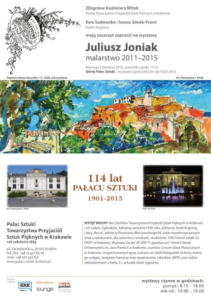 Zbigniew Kazimierz Witek Prezes Towarzystwa Przyjaciół Sztuk Pięknych w Krakowie Ewa Sadowska i Iwona Siwek-Front Public Relations mają zaszczyt zaprosić na wystawę Juliusz Joniak malarstwo 2011–2015 Wernisaż 2 kwietnia 2015, czwartek o godz. 17.15 Górny Pałac Sztuki / wystawa czynna od 2.04. do 10.05.2015 fot. Przemysław J. Witek fragment obrazu Roussillon ’13, 75x85, olej na płótnie 114 lat PAŁACU SZTUKI 1901-2015 foto: Przemysław J. Witek Pałac Sztuki Towarzystwa Przyjaciół Sztuk Pięknych w Krakowie rok założenia 1854 pl. Szczepański 4, 31-011 Kraków tel./fax: +48 12 422 66 16 mob. +48 501 451 252 www.palac-sztuki.krakow.pl patronat medialny foto: Jan Zych WSTĘP WOLNY dla członków Towarzystwa Przyjaciół Sztuk Pięknych w Krakowie i ich rodzin, Sybiraków, żołnierzy września1939 roku, żołnierzy Armii Krajowej i akcji „Burza”, żołnierzy Powstania Warszawskiego’44, osób niepełnosprawnych wraz z opiekunami, dla seniorów z wnukami, studentów: ASP, historii sztuki UJ, PWST w Krakowie, Wydziału Sztuki UP, WSF-P „Ignatianum”, Historii Sztuki Uniwersytetu im. Jana Pawła II w Krakowie, uczniów Liceum Sztuk Plastycznych w Krakowie, zorganizowanych grup uczniów ze Szkół Małopolski na karty wolnego wstępu, zastępów harcerzy oraz repatriantów, członków SMTG oraz rodzin wielodzietnych z Kartą 3+, w każdy dzień tygodnia. wystawy czynne w godzinach: pon-pt.: 8.15 – 18.00 sob-nd.: 10.00 – 18.00 Juliusz Joniak urodzony w 1925 roku we Lwowie ukończył w rodzinnym mieście podczas okupacji w latach 1941-1945 Szkołę Przemysłu Artystycznego. Po wojnie student-repatriant ukończył na Akademii Sztuk Pięknych w Krakowie dwa wydziały: Malarstwo u Prof. Czesława Rzepińskiego, który zaproponował mu asystenturę i Grafikę Artystyczną u Profesorów Andrzeja Jurkiewicza i Konrada Srzednickiego. Przeszedł na ASP wszystkie szczeble akademickiej kariery zwieńczonej profesurą zwyczajną. Był Dziekanem Wydziału Malarstwa (1978-1981) i Prorektorem Akademii Sztuk Pięknych w Krakowie (1981-1984). Działalność artystyczna to udział w wielu wystawach zbiorowych i indywidualnych w kraju i za granicą m.in. w II, III i IV Ogólnopolskich Wystawach Plastyki, wystawie w Arsenale, „Junge Generation” – Berlin, Lipsk. Współczesne malarstwo: Sofia, Praga, Kijów, Bratysława, Drezno, Nancy, Valloris, Biennale Sztuki – Merignac, Biennale „Sport w sztuce” – Madryt, Barcelona, „Pedagodzy Akademii Sztuk Pięknych” – Ateny, Saloniki, „Ateliereinblicke” – Kunsthalle, Norymberga. Wystawy indywidualne w Polsce i za granicą w Bergen, Lipsku, Pradze, Mainz, Aschaffenburgu, Wiesbaden... Prace w zbiorach muzealnych i prywatnych kolekcjach m.in.: w Muzeum Narodowym w Krakowie, Warszawie, za granicą w Australii, Danii, Kanadzie, Norwegii, Szwecji, Niemczech. W 1995 roku otrzymał najwyższą nagrodę na VII Festiwalu Sztuk w Magné – Francja, w którym uczestniczyło ponad 160 malarzy ze wszystkich kontynentów, po czym został Członkiem Honorowym Academie Européene de Arts w Paryżu. Jest laureatem szeregu nagród i wyróżnień, Wiceprezesem Towarzystwa Przyjaciół Sztuk Pięknych w Krakowie, członkiem Związku Polskich Artystów Plastyków. Pełnił Juliusz Joniak we władzach Okręgu Krakowskiego ZPAP i w Zarządzie Głównym szereg odpowiedzialnych funkcji: przez dwie kadencje był Wiceprezesem ZPAP Okręgu Krakowskiego, działał w różnych komisjach i sekcji Malarstwa Zarządu Głównego ZPAP. Za ratowanie TPSP i udział w jego odradzaniu, Prezydent RP odznaczył w 2004 roku Profesora Juliusza Joniaka Krzyżem Oficerskim Orderu Odrodzenia Polski. Wystawy indywidualne w Pałacu Sztuki TPSP w Krakowie w 1998, 2004, 2008, 2011 i 2013 roku, trzy piękne Albumy Malarstwa, katalog oraz film o artyście malarzu Juliuszu Joniaku, entuzjastyczne wpisy do Księgi Pamiątkowej, duża oglądalność i zachwyt międzynarodowej publiczności świadczą o pięknie i wielkiej klasie Jego ekspresyjnego malarstwa. Obecna wystawa twórczości z lat 2011-2015 organizowana przez Towarzystwo Przyjaciół Sztuk Pięknych w Krakowie swojemu Wiceprezesowi w kwietniu / maju 2015 roku jest również spełnieniem wielu próśb fanów malarstwa tego wspaniałego Artysty z kraju i zagranicy. Zbigniew Kazimierz Witek fot. Przemysław J. Witek Owoce na szafce I ’14, 75x85, olej na płótnie fot. Przemysław J. Witek Droga do Cadaques ’14, 75x85, olej na płótnie