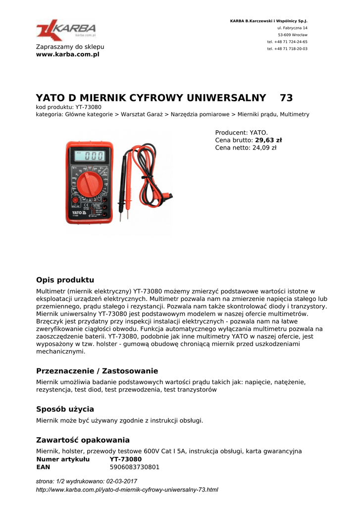 KARBA B.Karczewski i Wspólnicy Sp.J. ul. Fabryczna 14 53-609 Wrocław tel. +48 71 724-24-65 Zapraszamy do sklepu www.karba.com.pl tel. +48 71 718-20-03 YATO D MIERNIK CYFROWY UNIWERSALNY 73 kod produktu: YT-73080 kategoria: Główne kategorie > Warsztat Garaż > Narzędzia pomiarowe > Mierniki prądu, Multimetry Producent: YATO. Cena brutto: 29,63 zł Cena netto: 24,09 zł Opis produktu Multimetr (miernik elektryczny) YT-73080 możemy zmierzyć podstawowe wartości istotne w eksploatacji urządzeń elektrycznych. Multimetr pozwala nam na zmierzenie napięcia stałego lub przemiennego, prądu stałego i rezystancji. Pozwala nam także skontrolować diody i tranzystory. Miernik uniwersalny YT-73080 jest podstawowym modelem w naszej ofercie multimetrów. Brzęczyk jest przydatny przy inspekcji instalacji elektrycznych - pozwala nam na łatwe zweryfikowanie ciągłości obwodu. Funkcja automatycznego wyłączania multimetru pozwala na zaoszczędzenie baterii. YT-73080, podobnie jak inne multimetry YATO w naszej ofercie, jest wyposażony w tzw. holster - gumową obudowę chroniącą miernik przed uszkodzeniami mechanicznymi. Przeznaczenie / Zastosowanie Miernik umożliwia badanie podstawowych wartości prądu takich jak: napięcie, natężenie, rezystencja, test diod, test przewodzenia, test tranzystorów Sposób użycia Miernik może być używany zgodnie z instrukcji obsługi. Zawartość opakowania Miernik, holster, przewody testowe 600V Cat I 5A, instrukcja obsługi, karta gwarancyjna Numer artykułu YT-73080 EAN 5906083730801 strona: 1/2 wydrukowano: 02-03-2017 http://www.karba.com.pl/yato-d-miernik-cyfrowy-uniwersalny-73.html Jednostka Waga (kg) Częstotliwość próbkowania Pomiar napięcia przemiennego Pomiar napięcia stałego Pomiar rezystancji Prąd stały Test ciągłości obwodu Test diody SZT 0.2800 2-3 razy na sekundę 0-500V ±1,2% 0-500V ±1,2% 0-2000kΩ 0-5A ±2,0% wbudowany brzęczyk 1mV strona: 2/2 wydrukowano: 02-03-2017 http://www.karba.com.pl/yato-d-miernik-cyfrowy-uniwersalny-73.html