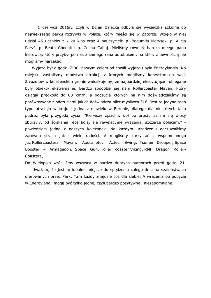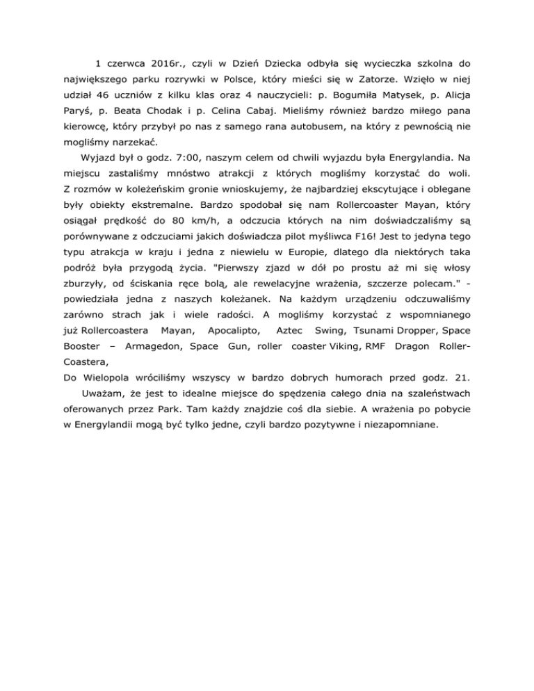 1 czerwca 2016r., czyli w Dzień Dziecka odbyła się wycieczka szkolna do największego parku rozrywki w Polsce, który mieści się w Zatorze. Wzięło w niej udział 46 uczniów z kilku klas oraz 4 nauczycieli: p. Bogumiła Matysek, p. Alicja Paryś, p. Beata Chodak i p. Celina Cabaj. Mieliśmy również bardzo miłego pana kierowcę, który przybył po nas z samego rana autobusem, na który z pewnością nie mogliśmy narzekać. Wyjazd był o godz. 7:00, naszym celem od chwili wyjazdu była Energylandia. Na miejscu zastaliśmy mnóstwo atrakcji z których mogliśmy korzystać do woli. Z rozmów w koleżeńskim gronie wnioskujemy, że najbardziej ekscytujące i oblegane były obiekty ekstremalne. Bardzo spodobał się nam Rollercoaster Mayan, który osiągał prędkość do 80 km/h, a odczucia których na nim doświadczaliśmy są porównywane z odczuciami jakich doświadcza pilot myśliwca F16! Jest to jedyna tego typu atrakcja w kraju i jedna z niewielu w Europie, dlatego dla niektórych taka podróż była przygodą życia. "Pierwszy zjazd w dół po prostu aż mi się włosy zburzyły, od ściskania ręce bolą, ale rewelacyjne wrażenia, szczerze polecam." powiedziała jedna z naszych koleżanek. Na każdym urządzeniu odczuwaliśmy zarówno strach jak i wiele radości. A mogliśmy korzystać z wspomnianego już Rollercoastera Booster – Mayan, Apocalipto, Armagedon, Space Aztec Gun, roller Swing, Tsunami Dropper, Space coaster Viking, RMF Dragon Roller- Coastera, Do Wielopola wróciliśmy wszyscy w bardzo dobrych humorach przed godz. 21. Uważam, że jest to idealne miejsce do spędzenia całego dnia na szaleństwach oferowanych przez Park. Tam każdy znajdzie coś dla siebie. A wrażenia po pobycie w Energylandii mogą być tylko jedne, czyli bardzo pozytywne i niezapomniane.