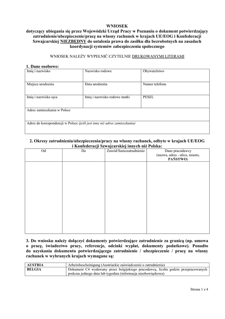 WNIOSEK dotyczący ubiegania się przez Wojewódzki Urząd Pracy w Poznaniu o dokument potwierdzający zatrudnienie/ubezpieczenie/pracę na własny rachunek w krajach UE/EOG i Konfederacji Szwajcarskiej NIEZBĘDNY do ustalenia prawa do zasiłku dla bezrobotnych na zasadach koordynacji systemów zabezpieczenia społecznego WNIOSEK NALEśY WYPEŁNIĆ CZYTELNIE DRUKOWANYMI LITERAMI 1. Dane osobowe: Imię i nazwisko Nazwisko rodowe Obywatelstwo Miejsce urodzenia Data urodzenia Numer telefonu Imię i nazwisko ojca Imię i nazwisko rodowe matki PESEL Adres zamieszkania w Polsce Adres do korespondencji w Polsce (jeśli jest inny niŜ adres zamieszkania) 2. Okresy zatrudnienia/ubezpieczenia/pracy na własny rachunek, odbyte w krajach UE/EOG i Konfederacji Szwajcarskiej innych niŜ Polska: Od Do Zawód/Samozatrudnienie Dane pracodawcy (nazwa, adres - ulica, miasto, PAŃSTWO) 3. Do wniosku naleŜy dołączyć dokumenty potwierdzające zatrudnienie za granicą (np. umowa o pracę, świadectwo pracy, referencje, odcinki wypłat, dokumenty podatkowe). Ponadto do uzyskania dokumentu potwierdzającego zatrudnienie / ubezpieczenie / pracę na własny rachunek w wybranych krajach wymagane są: AUSTRIA BELGIA Arbeitsbescheinigung (Austriackie zaświadczenie o zatrudnieniu) Dokument C4 wydawany przez belgijskiego pracodawcę, liczba godzin przepracowanych podczas jednego dnia lub tygodnia (informacja nieobowiązkowa) Strona 1 z 4 DANIA FRANCJA GIBRALTAR NIEMCY HOLANDIA WŁOCHY IRLANDIA NORWEGIA HISZPANIA WIELKA BRYTANIA SZWECJA Dokument potwierdzający nadanie duńskiego numeru Pesel (CPR- nummer) Kopia trzech ostatnich miesięcznych specyfikacji wynagrodzenia (bulletin de paie), kopia paszportu, kopia umowy o pracę (certificat de travail) oraz zaświadczenie wydane przez pracodawcę zawierające informację o przyczynie ustania stosunku pracy (motif de la rupture du contrat de travail) Formularz INS 69 oraz Certficate of service (Poświadczenie pracy) wypełnione przez pracodawcę (informacje nieobowiązkowe) Dokument potwierdzający nadanie numeru klienta z Biura Pośrednictwa Pracy – Arbeitsamt (Stammnummer) oraz numeru ubezpieczeniowego z Kasy Chorych – Krankenkasse Dokument potwierdzający nadanie Numeru Sofi/Numeru BSN Dokumenty potwierdzające zatrudnienie we Włoszech, Codice fiscale (numer ubezpieczenia społecznego) Dokument potwierdzający nadanie numeru PPS (Personal Public Service Number), P45 (oświadczenie o uzyskanych dochodach od poprzedniego pracodawcy) i/lub P60 (końcowa deklaracja podatkowa), pierwszy i ostatni odcinek wypłaty (payslip). Dokument potwierdzający nadanie norweskiego numeru identyfikacyjnego (informacja nieobowiązkowa), norweski wniosek o wydanie Formularza E 301 wypełniony przez norweskiego pracodawcę Dokument potwierdzający nadanie Numero de afiliacion (numer ubezpieczenia społecznego) oraz pełne nazwisko. Pierwszy i ostatni odcinek wypłaty (payslip), dokument potwierdzający nadanie National Insurance Number (numer ubezpieczenia), P60 (końcowa deklaracja podatkowa), data wyjazdu wnioskodawcy z Wielkiej Brytanii, P45 (informacje kontrolne od wcześniejszych pracodawców) Dokument potwierdzający nadanie szwedzkiego numeru identyfikacyjnego (Personnummer) oraz deklaracja przynaleŜności do Kasy Ubezpieczeń na wypadek bezrobocia 4. Status wnioskodawcy * Jestem osobą bezrobotną, zarejestrowaną w Powiatowym Urzędzie Pracy w…………………………………………….* * proszę wpisać nazwę miejscowości 5. Adnotacje wojewódzkiego urzędu pracy: Data i podpis osoby przyjmującej wniosek …………………………………………………………………………………... POUCZENIE Procedura postępowania wojewódzkiego urzędu pracy dotycząca ustalenia prawa do zasiłku dla bezrobotnych przedstawia się następująco: • z chwilą wpłynięcia do wojewódzkiego urzędu pracy dokumentu potwierdzającego zatrudnienie / ubezpieczenie/pracę na własny rachunek za granicą, wysyłane jest zawiadomienie do wnioskodawcy oraz właściwego ze względu na miejsce zamieszkania powiatowego urzędu pracy. Jeśli Formularz E 301/Dokument PD U1 zostanie przesłany przez instytucję zagraniczną na adres wnioskodawcy, naleŜy go niezwłocznie dostarczyć do wojewódzkiego urzędu pracy. • powiatowy urząd pracy przysyła do wojewódzkiego urzędu pracy dokumenty niezbędne do podjęcia decyzji administracyjnej dotyczącej ustalenia prawa do zasiłku, • decyzja wysyłana jest do wnioskodawcy oraz do powiatowego urzędu pracy. Strona 2 z 4 INFORMACJE DODATKOWE • KaŜdy bezrobotny po ustaniu zatrudnienia za granicą niezaleŜnie od tego, czy posiada Formularz E 301/dokument PD U1, jeŜeli chce ustalić prawo do zasiłku dla bezrobotnych musi koniecznie zarejestrować się w powiatowym urzędzie pracy jako osoba bezrobotna. • Data rejestracji jako osoba bezrobotna w powiatowym urzędzie pracy ma znaczenie w momencie ustalania prawa do zasiłku (bierze się wtedy pod uwagę okres 18 miesięcy poprzedzających dzień rejestracji w powiatowym urzędzie pracy i aby otrzymać zasiłek dla bezrobotnych naleŜy w tym okresie przepracować, co najmniej 365 dni) – art. 71 ust. 1 i 2 ustawy z dnia 20 kwietnia 2004r. o promocji zatrudnienia i instytucjach rynku pracy (tekst jednolity Dz. U. z 2008 r. Nr 69 poz. 415 z późn. zm.) • JeŜeli wnioskodawca spełni wszystkie warunki ustawy o promocji zatrudnienia i instytucjach rynku pracy (…) w zakresie warunków koniecznych do uzyskania prawa do zasiłku dla bezrobotnych, zasiłek ten zostanie przyznany od dnia złoŜenia niniejszego wniosku (wraz z załącznikami wymienionymi w punkcie 3) do Wojewódzkiego Urzędu Pracy w Poznaniu. W sytuacji, gdy zaistnieje konieczność uzupełnienia przez bezrobotnego braków we wniosku, powyŜszy zasiłek zostanie przyznany od dnia uzupełnienia ostatniego z tych braków. • Prawo do zasiłku dla bezrobotnych w związku z zatrudnieniem/ubezpieczeniem/pracą n