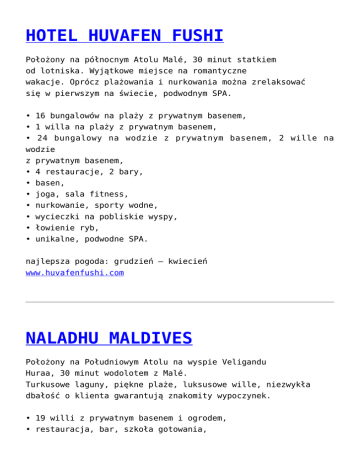 HOTEL HUVAFEN FUSHI Położony na północnym Atolu Malé, 30 minut statkiem od lotniska. Wyjątkowe miejsce na romantyczne wakacje. Oprócz plażowania i nurkowania można zrelaksować się w pierwszym na świecie, podwodnym SPA. • 16 bungalowów na plaży z prywatnym basenem, • 1 willa na plaży z prywatnym basenem, • 24 bungalowy na wodzie z prywatnym basenem, 2 wille na wodzie z prywatnym basenem, • • • • • • • 4 restauracje, 2 bary, basen, joga, sala fitness, nurkowanie, sporty wodne, wycieczki na pobliskie wyspy, łowienie ryb, unikalne, podwodne SPA. najlepsza pogoda: grudzień – kwiecień www.huvafenfushi.com NALADHU MALDIVES Położony na Południowym Atolu na wyspie Veligandu Huraa, 30 minut wodolotem z Malé. Turkusowe laguny, piękne plaże, luksusowe wille, niezwykła dbałość o klienta gwarantują znakomity wypoczynek. • 19 willi z prywatnym basenem i ogrodem, • restauracja, bar, szkoła gotowania, • basen, sala fitness, joga, • nurkowanie, sporty wodne, pikniki na bezludnych wyspach, łowienie ryb, • SPA. najlepsza pogoda: grudzień – kwiecień www.naladhu.com ST. REGIS BALI RESORT Położony przy wspaniałej plaży Nusa Dua, w tropikalnym ogrodzie. Kąpiele w turkusowych, spokojnych wodach Oceanu Indyjskiego, leniwe spacery po białej plaży, ale również nurkowanie, kajaki, windsurfing lub wycieczki w interior, to naturale atrakcje tej niezwykle ciekawej wyspy. • 72 apartamenty z livingiem, 14 z prywatnym basenem, 20 przestronnych willi z prywatnym basenem, z 1 lub 2 sypialniami, • 2 restauracje, 2 bary, • basen, sporty wodne, • sala fitness, • pole golfowe 18 dołków/72 par, • SPA. najlepsza pogoda: kwiecień – październik www.stregis.com/bali BULGARI BALI RESORT & SPA Malowniczo położony na 150 m klifie, na południowo-zachodnim wybrzeżu, w pobliżu miasteczka Pekatu. Na prywatną, romantyczną, plażę zjeżdża się windą. Hotel wyróżnia się znakomitą architekturą, łącząc wyrafinowany styl włoski z tradycyjnym stylem balijskim. • 59 przestronnych willi z basenem, z 2 lub 3 sypialniami, livingiem i tarasem, • 2 restauracje, bar, • basen, joga, • wycieczki po wyspie, • SPA. najlepsza pogoda: kwiecień – październik www.bulgarihotels.com KARMA JIMBARAN RESORT Położony w pięknej Zatoce Jimbaran, w tropikalnym ogrodzie przy białej, piaszczystej plaży. Przestronne i luksusowe wille łączą nowoczesne wyposażenie z elementami tradycyjnego, balijskiego wystroju. • • • • 38 willi z basenem z 1-4 sypialniami, restauracja, bar, basen, sporty wodne, wycieczki statkiem, joga, przejażdżki konne, wycieczki w góry, • znakomite SPA. najlepsza pogoda: kwiecień – październik www.karmajimbaran.com TIKEHAU PEARL BEACH RESORT Uważany za jeden z najpiękniejszych atoli w Polinezji, w kształcie korony, atol Tikehau utworzony jest z wysepek, „zawieszonych” pomiędzy błękitem nieba i turkusem wody. Hotel znajduje się na wysepce Motu Tiano, wsród palm kokosowych i białych plaż. Szklana podłoga w bungalowach na wodzie umożliwia obserwację świata podwodnego. • • • • • • 13 bungalowów na plaży, 24 na wodzie, restauracja, bar, basen, nurkowanie, wycieczki łodzią, piknik na plaży, wycieczki rowerem do pobliskich wiosek, SPA. najlepsza pogoda: cały rok www.pearlresorts.com/tikehaupearlbeachresort/ MOTU TETA Wchodząca w skład atolu Rangiroa – największego w Arcipelagu Tuamotu, wysepka Motu Tetaraire jest wyjątkowym miejscem. Jedyny hałas, jaki można tu usłyszeć – to szum fal i szelest palm kokosowych. Jedyne decyzje, które należy podjąć – to czego się teraz napić i co zjeść. Gwarantowany całkowity relaks, spokój i odizolowanie od świata. • 1 willa w stylu polinezyjskim z 3 sypialniami, salonem, jadalnia i oddaloną kuchnią, w której znakomity kucharz przyrządza posiłki, • 1 bungalow z 2-sypialniami, • nurkowanie, windsurfing, przejażdżki łodzią na pobliskie wyspy, • łowienie ryb, zbieranie muszli. najlepsza pogoda: cały rok www.yourdreamisland.com BORA BORA PEARL BEACH RESOR T & SPA Położony na wysepce Motu Tevairoa, 10 minut statkiem od legendarnej wyspy Bora Bora. • 20 bungalowów w ogrodzie z prywatnym basenem, 10 bungalowów na plaży z jacuzzi, 50 bungalowów na wodzie z dużym tarasem, • 3 restauracje, 2 bary, • basen, sporty wodne, wycieczki katamaranem, korty tenisowe, • loty helikopterem, • karmienie rekinów i płaszczek. najlepsza pogoda: cały rok www.pearlresorts.com/bora LE TAHA’A ISLAND RESOR T & SPA Położony na prywatnej wysepce 5 minut drogi statkiem od wyspy Taha’a, leżącej w Archipelagu Wysp Towarzystwa, 230 km na zachód od Tahiti. Taha’a często zwana jest wyspą waniliową, ponieważ rocznie produkuje 25 ton tego cennego specjału. Taha’a to także wyspa, gdzie ludzie żyją w pełnej harmonii z niezwykle piękną, bogatą i dziewiczą przyrodą. • • • • • • • 48 przestronnych bungalowów na wodzie, 12 willi na plaży z prywatnym basenem i ogrodem, 3 restauracje, 2 bary, basen, sporty wodne, kort tenisowy, loty helikopterem na Bora Bora, wycieczki jeepem po wyspie, łowienie ryb, nurkowanie, wspaniałe SPA. najlepsza pogoda: cały rok www.letahaa.com TURTLE ISLAND Bujna roślinność, białe plaże, niesamowicie błękitne wody oceanu zostały uwiecznione na filmie „Blue Lagoon”. Romantyczne pikniki na jednej z 14 dziewiczych plaż wyspy, egzotyczna przyroda, kąpiele w krystalicznie czystych lagunach, malownicze zachody słońca mogą być wspaniałą scenerią podróży poślubnych. • 14 willi 2-pokojowych, • śniadania podawane na tarasie willi, romantyczne zachodzie słońca, pikniki na plaży, wyrafinowane i urozmaicone duży wybór win, • nurkowanie z maską lub z butlami, łowienie ryb morzu, przejażdżki łodzià, piknik na plaży, wycieczki wspinaczka górska, masaże. najlepsza pogoda: kwiecień – wrzesień www.turtlefiji.com kolacje o menu o