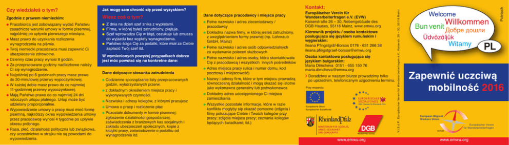Zgodnie z prawem niemieckim: Wiesz coś o tym? ● ● Pracobiorca jest zobowiązany wydać Państwu zasadnicze warunki umowy w formie pisemnej, najpóźniej po upływie pierwszego miesiąca. ● Masz prawo do uzyskania rozliczenia wynagrodzenia na piśmie. ● Twój niemiecki pracodawca musi zapewnić Ci ubezpieczenie zdrowotne. ● Dzienny czas pracy wynosi 8 godzin. ● Za przepracowane godziny nadliczbowe należy Ci się wynagrodzenie. ● Najpóźniej po 6 godzinach pracy masz prawo do 30-minutowej przerwy wypoczynkowej. ● W każdej dobie masz prawo do co najmniej 11-godzinnej przerwy wypoczynkowej. ● Mają Państwo prawo do co najmniej 24 dni roboczych urlopu płatnego. Urlop może być udzielany proporcjonalnie. ● Wypowiedzenie umowy o pracę musi mieć formę pisemną, najkrótszy okres wypowiedzenia umowy przez pracodawcę wynosi 4 tygodnie po upływie okresu próbnego. ● Rasa, płeć, działalność polityczna lub związkowa, czy uczestnictwo w strajku nie są powodami do wypowiedzenia. ● ● ● Z dnia na dzień szef znika z wypłatami. Firma, w której byłeś zatrudniony, plajtuje. Szef wprowadza Cię w błąd, oszukuje lub zmusza do wyjazdu bez wypłaty wynagrodzenia. Państwo ściga Cię za podatki, które miał za Ciebie zapłacić Twój szef itd. W wymienionych powyżej przypadkach dobrze jest móc powołać się na konkretne dane: Dane dotyczące stosunku zatrudnienia Codzienne sporządzanie listy przepracowanych godzin, wykorzystanych przerw, ● z dokładnym określeniem miejsca pracy i wykonywanych czynności. ● Nazwiska i adresy kolegów, z którymi pracujesz ● Umowa o pracę i rozliczenie płac ● Pozostałe dokumenty w formie pisemnej: zgłoszenie działalności gospodarczej, zaświadczenia z branżowych kas socjalnych i zakładu ubezpieczeń społecznych, kopie z książki pracy, zaświadczenie o podatku od wynagrodzenia itd. ● Kontakt: Dane dotyczące pracodawcy i miejsca pracy ● ● ● ● ● ● ● ● Pełne nazwisko i adres zleceniodawcy / pracodawcy Dokładna nazwa firmy, w której jesteś zatrudniony, z uwzględnieniem formy prawnej (np. Lohnraub GmbH, Mainz) Pełne nazwisko i adres osób odpowiedzialnych za wydawanie poleceń służbowych Pełne nazwisko i adres osoby, która skontaktowała Cię z pracodawcą i wszystkich innych pośredników Adres miejsca pracy (ulica i numer domu, kod pocztowy i miejscowość) Nazwy i adresy firm, które w tym miejscu prowadzą równoczesną działalność i mogą okazać się istotne jako wykonawca generalny lub podwykonawca Europäischer Verein für Wanderarbeiterfragen e.V. (EVW) Kaiserstraße 26 – 30, Nebengebäude des DGB Hauses, 55116 Mainz, www.emwu.org Kierownik projektu / osoba kontaktowa posługująca się językiem rumuńskim i węgierskim: Ileana Pfingstgräf-Borsos 0176 - 631 266 38 [email protected] Osoba kontaktowa posługująca się językiem bułgarskim: Maria Dimcheva 0151 - 655 150 76 [email protected] › Doradztwo w naszym biurze prowadzimy tylko po uprzednim, telefonicznym uzgodnieniu terminu. Przy wsparciu: Dokładny adres udostępnionego Ci miejsca zamieszkania Wszystkie pozostałe informacje, które w razie konfliktu mogłyby się okazać pomocne (zdjęcia i filmy pokazujące Ciebie i Twoich kolegów przy pracy; zdjęcia miejsca pracy; zeznania kolegów będących świadkami; itd.) www.emwu.org Polnisch Jak mogę sam chronić się przed wyzyskiem? V.i.S.d.P.: Europäischer Verein für Wanderarbeiterfragen e.V., Kaiserstr. 26 – 30, 55116 Mainz Czy wiedziałeś o tym? PL Zapewnić uczciwą mobilność 2016 European Migrant Workers Union Europäischer Verein für Wanderarbeiterfragen www.emwu.org Masz pytania dotyczące takich spraw, jak: Ustawowe wynagrodzenia minimalne w najważniejszych branżach: Tabela 1 Wynagrodzenie - stawka minimalna? ● Ubezpieczenie zdrowotne lub wypadkowe? ● Umowa o pracę lub rozliczanie płac? ● Urlop i przerwy na odpoczynek? ● Wypowiedzenie umowy o pracę? ● Zostałeś oszukany przez swojego pracodawcę, groził Ci lub stosował przemoc fizyczną i psychiczną? ● › Jeżeli mają Państwo pytania z zakresu obowiązującego prawa pracy, jeżeli uważacie, że jesteście niesprawiedliwie traktowani lub czujecie się zagrożeni, to prosimy o kontakt z nami. Udzielamy porad bezpłatnie i anonimowo. Doradzamy w poniższych językach: rumuński bułgarski niemiecki węgierski Branża Branża budowlana Niemcy Zachodnie Berlin Niemcy Wschodnie Sprzątanie budynków Niemcy Zachodnie / Berlin Niemcy Wschodnie Opieka Niemcy Zachodnie / Berlin Niemcy Wschodnie Praca tymczasowa Niemcy Zachodnie Niemcy Wschodnie / Berlin Rolnictwo – Leśnictwo - Ogrodnictwo Niemcy Zachodnie Niemcy Wschodnie / Berlin Ustawowe wynagrodzenia minimalne w najważniejszych branżach: Tabela 2 Grupa pracowników i wynagrodzenia EUR / godzina Pomocnik / Pracownik wykwalifikowany Pomocnik / Pracownik wykwalifikowany Jednolite wynagrodzenie minimalne 11,25 / 14,45 11,25 / 14,30 11,05 Sprzątanie i utrzymanie/szyby i fasady Sprzątanie i utrzymanie/szyby i fasady 9,80 / 12,98 8,70 / 11,10 Jednolite wynagrodzenie minimalne Jednolite wynagrodzenie minimalne 9,75 9,00 do 31.05.2016 r./ od 01.06.2016 r. do 31.05.2016 r./ od 01.06.2016 r. 8,80 / 9,00 8,20 / 8,50 Jednolite wynagrodzenie minimalne Jednolite wynagrodzenie minimalne 8,00 7,90 AKTUALNIE: Od 1 stycznia 2015 r. wysokość godzinowej stawki minimalnej wynosi 8,50 euro brutto (= 1.479,00 euro miesięcznie przy 40-godzinnym tygodniu pracy). Do wypłacania minimalnej stawki płacy zobowiązani są wszyscy pracodawcy z siedzibą w kraju i za granicą, o ile zatrudniają pracowników na terenie Niemiec. Branża Elektryk (montaż) Niemcy Zachodnie Niemcy Wschodnie / Berlin Malarz i lakiernik Całe terytorium Berlin Niemcy Zachodnie Niemcy Wschodnie Dekarz Całe terytorium Montażysta rusztowań Całe terytorium Grupa pracowników i wynagrodzenia EUR / godzina Jednolite wynagrodzenie minimalne Jednolite wynagrodzenie minim