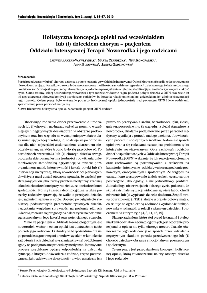 Perinatologia, Neonatologia i Ginekologia, tom 3, zeszyt 1, 63-67, 2010 Holistyczna koncepcja opieki nad wcześniakiem lub (i) dzieckiem chorym – pacjentem Oddziału Intensywnej Terapii Noworodka i jego rodzicami JADWIGA ŁUCZAK-WAWRZYNIAK1, MARTA CZARNECKA1, NINA KONOFALSKA1, ANNA BUKOWSKA1, JANUSZ GADZINOWSKI2 Streszczenie Poród przedwczesny lub (i) chorego dziecka, a potem leczenie go w Oddziale Intensywnej Opieki Medycznej jest dla rodziców sytuacją niezwykle stresującą. Początkowo ze względu na ograniczone możliwości samodzielnej egzystencji dziecka uwaga świata medycznego i rodziców zwrócona jest na potrzebę ratowania życia, a dopiero po uzyskaniu względnej stabilizacji parametrów życiowych – jakość życia. Skutki traumy, jakiej doświadczają w związku z tym rodzice, widoczne są już podczas pobytu dziecka w OITN oraz wiele lat od tego zdarzenia i dotyczą kondycji psychicznej rodziców, budowania relacji emocjonalnej z dzieckiem, ich zdolności stymulacji jego rozwoju. Celem pracy było wskazanie potrzeby holistycznej opieki jednocześnie nad pacjentem OITN i jego rodzicami, sprawowanej przez personel medyczny. Słowa kluczowe: holistyczna opieka, wcześniak, pacjent OITN, rodzice Obserwując rodziców dzieci przedwcześnie urodzonych lub (i) chorych, można zauważyć, że pomimo wcześniejszych negatywnych doświadczeń w obszarze prokreacyjnym oraz bez względu na wystąpienie powikłań w ciąży zmieniających jej przebieg, to, co dzieje się po porodzie jest dla nich najczęściej zaskoczeniem, zdarzeniem nieoczekiwanym, na które trudno było się przygotować. Po narodzinach wcześniaka lub (i) chorego dziecka uwaga otoczenia skierowana jest na trudności i powikłania uniemożliwiające samodzielną egzystencję w świecie poza organizmem matki. Intensywność i jakość opieki lub (i) interwencji medycznej, którą noworodek od pierwszych chwil życia musi zostać otoczony sprawia, że częściej postrzegany jest on jako trudny problem medyczny, rzadziej jako dziecko określonej pary rodziców, członek określonej społeczności. Normy i zasady deontologiczne, a także potrzeby rodziców sprawiają, że walka o przeżycie dziecka jest zadaniem samym w sobie. Dopiero po osiągnięciu stabilizacji podstawowych parametrów życiowych dziecka i uzyskaniu względnej sprawności na poziomie różnych układów, rozważa się prognozy na dalsze życie na poziomie egzystencjalnym, jego jakości oraz potencjalnego rozwoju. Mimo że pacjentem w Oddziale Neonatologicznym jest noworodek, ważnym celem opieki jest dostrzeżenie także potrzeb jego rodziców. Ci drudzy w bezpośrednim czasie po porodzie są postrzegani przede wszystkim w kontekście zagrożenia życia dziecka i wyrażania aktywnej bądź biernej zgody na podejmowane procedury medyczne. Intensywne procesy psychiczne będące odpowiedzią na zaistniałą sytuację, a których doświadczają rodzice, często postrzegane są jako adekwatne do sytuacji – a więc uznaje się ich prawo do przeżywania szoku, bezradności, lęku, złości, gniewu, poczucia winy. Ze względu na ciężki stan zdrowia noworodka, działania podejmowane przez personel medyczny wynikają z potrzeb małego pacjenta, obowiązujących procedur i dostępnych środków. Natomiast sposób opiekowania się rodzicami, często jest problemem tylko intuicyjnie rozwiązywanym. Opis zachowań rodziców dzieci hospitalizowanych w Oddziale Intensywnej Terapii Noworodka (OITN) wskazuje, że ich reakcje emocjonalne oraz zachowanie są porównywalne z reakcjami na katastrofę – intensywne i oddziaływujące na poziomie poznawczym, emocjonalnym i społecznym. Ze względu na uzasadnione występowanie takich reakcji, często są one postrzegane jako ogólny, a nie jednostkowy problem. Jednak długa obserwacja ich dalszego życia, pokazuje, że skutki zaistniałej sytuacji widoczne są wiele lat od chwili zdarzenia lub (i) wypisania dziecka do domu. Zespół stresu pourazowego (PTSD) istnieje u prawie połowy matek, co rzutuje na ograniczoną zdolność i wydolność funkcjonowania w roli matki, w relacji z własnym dzieckiem i otoczeniem w którym żyje [4, 8, 11, 12, 19]. Dlatego zadaniem, które stoi przed lekarzami i pielęgniarkami oddziałów neonatologicznych, jest otoczenie profesjonalną opieką nie tylko chorego noworodka, ale równocześnie jego rodziców jako sposób przeciwdziałania negatywnym skutkom porodu przedwczesnego lub (i) chorego dziecka w obszarze emocjonalnym, poznawczym i społecznym. Celem pracy jest przedstawienie koncepcji holistycznej opieki, którą równocześnie należy otoczyć dziecko i jego rodziców. 1 Zespół Psychologów Ginekologiczno-Położniczego Szpitala Klinicznego UM w Poznaniu 2 Katedra i Klinika Neonatologii Ginekologiczno-Położniczego Szpitala Klinicznego UM w Poznaniu 64 J. Łuczak-Wawrzyniak, M Czarnecka, N. Konofalska, A. Bukowska, J. Gadzinowski Materiał i metoda W pracy wykorzystano dane uzyskane z badania przeprowadzonego wśród 97 rodziców (62 matek i 35 ojców), których dzieci były leczone w OITN Kliniki Neonatologii GPSK UM w Poznaniu, od sierpnia 2007 do lutego 2008 roku. Powodem hospitalizacji było wcześniactwo, wady rozwojowe, ostre objawy zagrożenia życia. W badaniu posłużono się przygotowanym do tego celu kwestionariuszem, zawierającym pytania o dane obiektywne (wiek, wykształcenie, zawód, tydzień ciąży w którym wystąpił poród, masę urodzeniową dziecka, punktację w skali Apgar) oraz pytania, które miały pozwolić rodzicom zidentyfikować własne emocje, oczekiwania, ocenić jakość kontaktu i dostępność do lekarza opiekującego się dzieckiem. Częścią badania była też Edynburska Skala Depresji Poporodowej, którą wypełniali kobiety i mężczyźni. rodziców podczas rozmów z lekarzem, a 10 (10%) wolałoby jednak rozmawiać osobno. Dla zwiększenia efektywności rozmów na temat dzieci, 61 (63%) rodziców wskazało, że używany język p