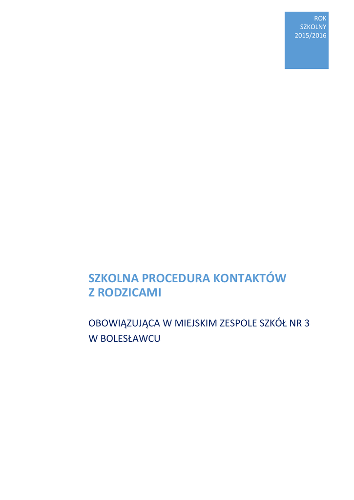ROK SZKOLNY 2015/2016 SZKOLNA PROCEDURA KONTAKTÓW Z RODZICAMI OBOWIĄZUJĄCA W MIEJSKIM ZESPOLE SZKÓŁ NR 3 W BOLESŁAWCU SZKOLNA PROCEDURA KONTAKTÓW Z RODZICAMI obowiązująca w Miejskim Zespole Szkół nr 3 w Bolesławcu I. Wprowadzenie Poniższa procedura określa zasady organizacji zebrań i kontaktów szkoły z rodzicami (także prawnymi opiekunami) oraz zadania i obowiązki poszczególnych podmiotów w tym zakresie: rodziców, wychowawcy klasy, nauczycieli i dyrektora. II. Podstawa Prawna 1. USTAWA z dnia 7 września 1991 r. o systemie oświaty (Dz. U. z 2004 r. Nr 256, poz. 2572, ze zm.). 2. ROZPORZĄDENIE MINISTRA EDUKACJI NARODOWEJ z dnia 30 kwietnia 2007 r. w sprawie warunków i sposobu oceniania, klasyfikowania i promowania uczniów i słuchaczy oraz przeprowadzania sprawdzianów i egzaminów w szkołach publicznych (Dz. U. z 2007 r. Nr 83, poz. 562 ze zm.). 3. Statut Miejskiego Zespołu Szkół nr 3 w Bolesławcu. III. Cele procedury 1. Określenie zadań i obowiązków poszczególnych podmiotów szkoły. 2. Ustalenie zasad komunikacji w relacji rodzice – szkoła. 3. Systematyczne przekazywanie rodzicom bieżącej, w tym semestralnej i rocznej informacji o postępach jego dziecka w nauce i zachowaniu. 4. Systematyczne przekazywanie rodzicom bieżącej informacji na temat postępów ucznia w ramach udzielanej pomocy psychologiczno-pedagogicznej. 5. Udzielanie rodzicom wsparcia w zakresie rozpoznawanych problemów dydaktycznych i wychowawczych dziecka. 6. Zachęcanie rodziców do systematycznego udziału w zebraniach organizowanych na terenie szkoły. 7. Zachęcenie rodziców do systematycznego informowania o mocnych i słabych stronach pracy szkoły oraz zagrożeniach bezpieczeństwa uczniów. 8. Otwarcie na wspólne poszukiwanie rozwiązań podnoszących jakość pracy szkoły. 9. Określenie stałych i zmiennych informacji przekazywanych rodzicom w czasie zebrań. 10. Ułatwienie prowadzenia ewaluacji w zakresie organizacji zebrań z rodzicami. 1 IV. Zakres procedury 1. Uzyskanie w relacji rodzice – szkoła informacji o wszechstronnym rozwoju dziecka oraz warunkach domowych i szkolnych dziecka. 2. Procedura dotyczy nauczycieli, wychowawców, rodziców (prawnych opiekunów) oraz dyrektora szkoły. V. Osoby upoważnione do udzielania informacji o dziecku (uczniu) Informacji o dziecku mogą udzielać wyłącznie wychowawcy klas, nauczyciele, pedagog/psycholog, dyrektor szkoły oraz w sytuacji związanej z udzieleniem pomocy medycznej pielęgniarka. VI. Miejsce i systematyka kontaktów z rodzicami (opiekunami): 1. Miejscem kontaktów rodziców z wychowawcami klas, nauczycielami poszczególnych przedmiotów, pedagogiem/psychologiem i dyrektorem jest szkoła. 2. Dopuszcza się również możliwość indywidualnego kontaktu rodziców ze szkołą (wizyta domowa, wywiad rodzinny). 3. Kontakty rodziców z nauczycielami odbywają się według harmonogramu zebrań i konsultacji z rodzicami ujętego corocznie w planie pracy szkoły. W uzasadnionych przypadkach dyrektor szkoły może zmienić terminy spotkań. 4. Informację z harmonogramem spotkań zamieszcza się na stronie internetowej szkoły. 5. Każdego roku organizowane są następujące formy spotkań z rodzicami: 1) zebranie ogólne i klasowe na początku roku szkolnego – wrzesień, 2) zebranie ogólne i klasowe śródokresowe w I semestrze – listopad, 3) konsultacje klasowe i indywidualne o przewidywanych semestralnych ocenach z poszczególnych przedmiotów/edukacji oraz przewidywanej ocenie zachowania ucznia – grudzień/styczeń, 4) zebranie ogólne i klasowe na zakończenie I semestru – styczeń/luty, 5) zebranie klasowe śródokresowe w II semestrze, 6) zebrania klasowe dla rodziców klas VI szkoły podstawowej i klas III gimnazjum związane z zapoznaniem rodziców z procedurami sprawdzianu na zakończenie szkoły podstawowej i egzaminu gimnazjalnego -marzec/kwiecień, 2 7) konsultacje indywidualne o przewidywanych rocznych ocenach z poszczególnych przedmiotów/edukacji oraz przewidywanej ocenie zachowania ucznia – maj/czerwiec, 8) inne formy spotkań z rodzicami zgodnie z bieżącymi potrzebami np. wychowawcy klasy, rodziców czy uczniów. 6. Dyrektor szkoły przyjmuje rodziców w każdy poniedziałek – SP 2 i czwartek – GS 3 w godzinach 10:00–12:00 w budynku szkolnym przy ul. Słowackiego 2. Dodatkowe spotkania z dyrektorem szkoły są możliwe w uzasadnionych przypadkach po wcześniejszym uzgodnieniu. 7. Rodzice uczniów szkoły mają możliwość dodatkowego kontaktu z nauczycielami w ważnych przypadkach po uprzednim uzgodnieniu takiego spotkania z nauczycielem. Spotkania takie odbywają się przed lub po zakończonych przez nauczyciela zajęciach. 8. 9. Miejscem kontaktów dyrektora, nauczycieli i rodziców na terenie szkoły są: 1) gabinet pedagoga/psychologa szkolnego, 2) sale lekcyjne, 3) gabinet dyrektora, 4) pokój spotkań z rodzicami. Wszelkich informacji o dziecku udzielamy z zachowaniem zasad poufności i dyskrecji. 10. Za niewłaściwe uważa się: 1) przekazywanie i uzyskiwanie informacji o uczniu poza szkołą np. na ulicy, 2) przeszkadzanie nauczycielowi w czasie lekcji w celu uzyskania informacji o uczniu lub w czasie pełnienia przez niego dyżuru czy innych ważnych czynności służbowych, 3) próby uzyskiwania informacji o uczniu w domu rodzinnym lub telefonicznie na prywatny numer nauczyciela bez jego zgody, 4) zasięganie informacji o uczniu od osób trzecich np. woźnych, pracowników szkoły czy nauczycieli, którzy nie prowadzą zajęć z uczniem. 11. Wychowawca klasy powiadamia rodziców poprzez uczniów, a w uzasadnionych przypadkach telefonicznie lub listownie, najpóźniej na tydzień przed wyznaczonym terminem zebrania/konsultacji, podając datę, miejsce i godzinę spotkania. 12. Powiadomienie może mieć charakter zaproszenia. 13. Informację o zebraniu zamieszcza się również na stronie internetowej szkoły. 14. Obecność rodzica na zebraniach jest obowiązkowa.