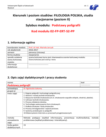 Uniwersytet Śląski w Katowicach Wydział str. 1 Kierunek i poziom studiów: FILOLOGIA POLSKA, studia stacjonarne (poziom II) Sylabus modułu: Podstawy poligrafii Kod modułu 02-FP-ERT-S2-PP 1. Informacje ogólne koordynator modułu rok akademicki semestr forma studiów sposób ustalania oceny końcowej modułu informacje dodatkowe Prof. dr hab. Mariola Jarczyk 2016-2017 pierwszy (zimowy) stacjonarne ocena końcowa kursu jest równoważna ocenie końcowej modułu Ocena końcowa jest oceną z testu ------------------------------ 2. Opis zajęć dydaktycznych i pracy studenta nazwa Podstawy poligrafii kod -------------- prowadzący grupa(-y) treści zajęć Dr Agnieszka Łakomy metody prowadzenia zajęć liczba godzin dydaktycznych Metoda podająca (wykład informacyjny, prezentacja multimedialna), metoda problemowa (wykład problemowy i interaktywny). 1. Pojęcie poligrafii i technologii poligraficznej. 2. Historia i rozwój technik drukowania. 3. Klasyczne techniki drukowania (m.in. drukowanie wypukłe wklęsłe, sitodruk, płaskie). 4. Cyfrowe techniki drukowania. 5. Procesy składania tekstów. 6. Technologia wykonywania form drukowych. 7. Podłoża drukowe i farby drukarskie. 8. Procesy introligatorskie i wykończeniowe. 9. Systemy produkcyjne w poligrafii. 10.Wykorzystanie Internetu w procesach przygotowawczych. 15 Uniwersytet Śląski w Katowicach Wydział (kontaktowych) liczba godzin pracy własnej studenta opis pracy własnej studenta organizacja zajęć literatura obowiązkowa literatura uzupełniająca str. 2 Samodzielna, wnikliwa lektura podanych tekstów, powtórka i ugruntowanie materiału omówionego na wykładzie. PUBLIKACJE DRUKOWANE 1. Drabczyński M., Galewski T., Trzaska F.: Od rękopisu do książki. Warszawa 1958. 2. Grycz J.: Z dziejów i techniki książki. Wrocław 1951 3. Kafel M.: Zarys techniki wydawniczej. Warszawa 1971. 4. Magdzik S., Jakucewicz S.: Podstawy poligrafii: podręcznik dla technikum. Warszawa 1997. 5. Poligrafia – procesy i technika. Warszawa 2005. 6. Poligrafia ogólna. Warszawa 1993. PUBLIKACJE DRUKOWANE 1. Dejidas LP., Destree T.M.: Technologia offsetowego drukowania arkuszowego. Warszawa, cop. 2007. 2. Druździel M., Fijałkowski T.: Zecerstwo. Wrocław 1988. 3. DTP: od projektu aż po druk: o współpracy grafika z drukarzem. Gliwice cop. 2013. 4. Eldred N. R.: Co drukarz powinien wiedzieć o farbach. Warszawa, cop. 2007. 5. Gehman C.: Systemy produkcyjne w poligrafii: praktyczny przewodnik. Warszawa, cop. 2007. 6. Konopelko A.: Wprowadzenie do teorii systemów politycznych. Białystok 2010. 7. Kuglin J.: Poligrafia książki. Wrocław [1968]. 8. McCue C.: Profesjonalny druk: przygotowanie materiałów: poznaj profesjonalne narzędzia, techniki i procesy z dziedziny DTP. Gliwice cop. 2007. 9. Rudziński C.: Druk wklęsły. Warszawa 1961. 10. Tedesco T.J., Clossey D., Hershey J.-M.: Procesy introligatorskie i wykończeniowe współczesnej poligrafii. Warszawa, dr. 2008. 11. Trzynadlowski J.: Autor, dzieło, wydawca. Wrocław 1988. 12. Wysocki A.: Mała poligrafia. Wrocław 1965. 13. Zadrożny Z.: Wklęsłodruk: fotografia, retusz, montaż. Warszawa 1980. PUBLIKACJE ELEKTRONICZNE 1. Die verschiedenen Druckverfahren [online]. [Data dostępu: 03.09.2014]. Dostępny w World Wide Web: http://www.hdm-stuttgart.de/~ritz/Bogenoffset/2_DRUCK VERFAHREN_D_M2.PDF. 2. Die Bogenoffsetdruckmaschine [online]. [Data dostępu: 03.09.2014]. Dostępny w World Wide Web: http://www.hdmstuttgart.de/~ritz/Bogenoffset/3_OFFSETDRUCKMA SCHINE_D_M3.PDF 3. Hafner S.: Vorlesung Drucktechnik [online]. [Data dostępu: 03.09.2014]. Dostępny w World Wide Web: http://www.idd.tudarmstadt.de/media/fachgebiet_idd/studium_und_lehre/vorlesungen_4/einfhrungdr ucktechnik/ss2011_6/drucktechnik_ss11_1einfhrein_v1.pdf. adres strony Uniwersytet Śląski w Katowicach Wydział str. 3 www zajęć informacje dodatkowe 3. Opis sposobów weryfikacji efektów kształcenia modułu Nazwa Podstawy poligrafii kod ------------------------- kod zajęć osoba przeprowadzająca weryfikację grupa wymagania merytoryczne --------------------Dr Agnieszka Łakomy kryteria oceny Podstawą oceny jest test, który obejmuje pytania wyboru jednokrotnego lub wielokrotnego i pytania otwarte. Każde z pytań jest osobno punktowane, zsumowana liczba punktów odpowiada określonej ocenie: od 50% punktów – ocena dostateczna – 3 od 55% punktów – ocena dostateczna plus – 3 + od 65% punktów – ocena dobra – 4 od 75% punktów – ocena dobra plus – 4 + od 85% punktów – ocena bardzo dobra – 5 przebieg procesu weryfikacji informacje dodatkowe 1. Pojęcie poligrafii i technologii poligraficznej. 2. Historia i rozwój technik drukowania. 3. Klasyczne techniki drukowania (m.in. drukowanie wypukłe wklęsłe, sitodruk, płaskie). 4. Cyfrowe techniki drukowania. 5. Procesy składania tekstów. 6. Technologia wykonywania form drukowych. 7. Podłoża drukowe i farby drukarskie. 8. Procesy introligatorskie i wykończeniowe. 9. Systemy produkcyjne w poligrafii. 10.Wykorzystanie Internetu w procesach przygotowawczych.
