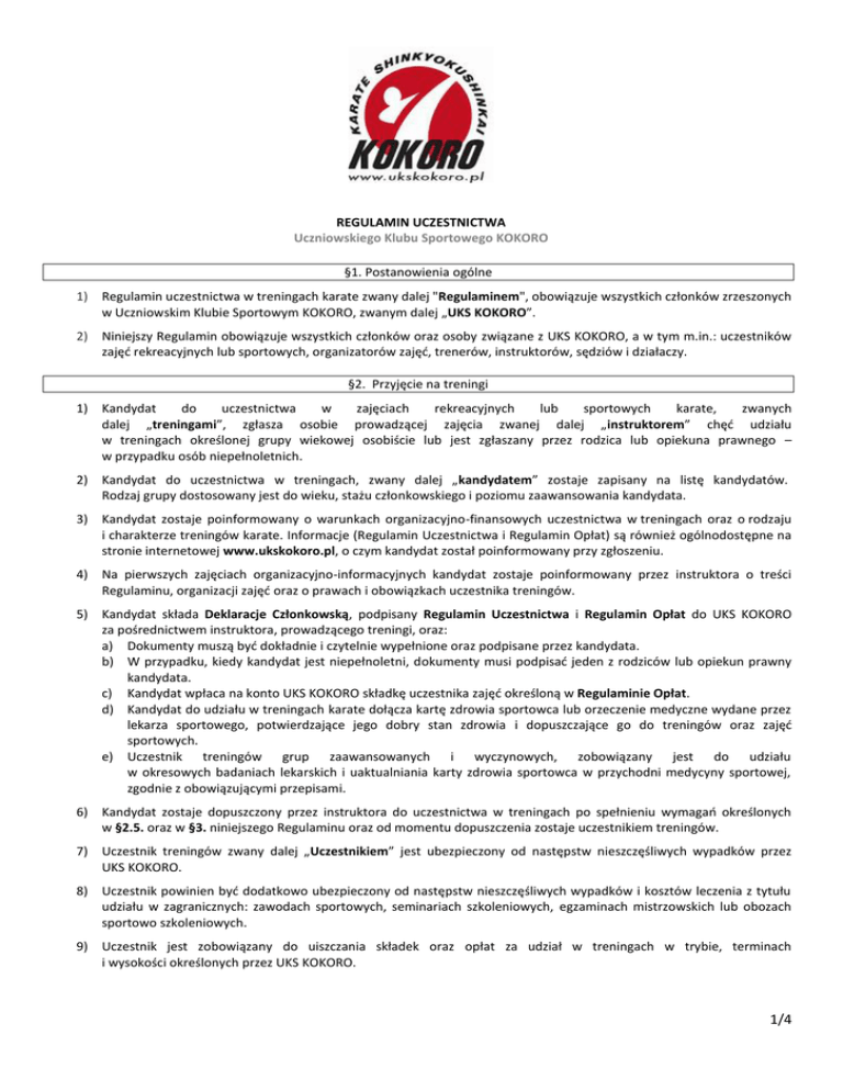 REGULAMIN UCZESTNICTWA Uczniowskiego Klubu Sportowego KOKORO §1. Postanowienia ogólne 1) Regulamin uczestnictwa w treningach karate zwany dalej "Regulaminem", obowiązuje wszystkich członków zrzeszonych w Uczniowskim Klubie Sportowym KOKORO, zwanym dalej „UKS KOKORO”. 2) Niniejszy Regulamin obowiązuje wszystkich członków oraz osoby związane z UKS KOKORO, a w tym m.in.: uczestników zajęć rekreacyjnych lub sportowych, organizatorów zajęć, trenerów, instruktorów, sędziów i działaczy. §2. Przyjęcie na treningi 1) Kandydat do uczestnictwa w zajęciach rekreacyjnych lub sportowych karate, zwanych dalej „treningami”, zgłasza osobie prowadzącej zajęcia zwanej dalej „instruktorem” chęć udziału w treningach określonej grupy wiekowej osobiście lub jest zgłaszany przez rodzica lub opiekuna prawnego – w przypadku osób niepełnoletnich. 2) Kandydat do uczestnictwa w treningach, zwany dalej „kandydatem” zostaje zapisany na listę kandydatów. Rodzaj grupy dostosowany jest do wieku, stażu członkowskiego i poziomu zaawansowania kandydata. 3) Kandydat zostaje poinformowany o warunkach organizacyjno-finansowych uczestnictwa w treningach oraz o rodzaju i charakterze treningów karate. Informacje (Regulamin Uczestnictwa i Regulamin Opłat) są również ogólnodostępne na stronie internetowej www.ukskokoro.pl, o czym kandydat został poinformowany przy zgłoszeniu. 4) Na pierwszych zajęciach organizacyjno-informacyjnych kandydat zostaje poinformowany przez instruktora o treści Regulaminu, organizacji zajęć oraz o prawach i obowiązkach uczestnika treningów. 5) Kandydat składa Deklaracje Członkowską, podpisany Regulamin Uczestnictwa i Regulamin Opłat do UKS KOKORO za pośrednictwem instruktora, prowadzącego treningi, oraz: a) Dokumenty muszą być dokładnie i czytelnie wypełnione oraz podpisane przez kandydata. b) W przypadku, kiedy kandydat jest niepełnoletni, dokumenty musi podpisać jeden z rodziców lub opiekun prawny kandydata. c) Kandydat wpłaca na konto UKS KOKORO składkę uczestnika zajęć określoną w Regulaminie Opłat. d) Kandydat do udziału w treningach karate dołącza kartę zdrowia sportowca lub orzeczenie medyczne wydane przez lekarza sportowego, potwierdzające jego dobry stan zdrowia i dopuszczające go do treningów oraz zajęć sportowych. e) Uczestnik treningów grup zaawansowanych i wyczynowych, zobowiązany jest do udziału w okresowych badaniach lekarskich i uaktualniania karty zdrowia sportowca w przychodni medycyny sportowej, zgodnie z obowiązującymi przepisami. 6) Kandydat zostaje dopuszczony przez instruktora do uczestnictwa w treningach po spełnieniu wymagań określonych w §2.5. oraz w §3. niniejszego Regulaminu oraz od momentu dopuszczenia zostaje uczestnikiem treningów. 7) Uczestnik treningów zwany dalej „Uczestnikiem” jest ubezpieczony od następstw nieszczęśliwych wypadków przez UKS KOKORO. 8) Uczestnik powinien być dodatkowo ubezpieczony od następstw nieszczęśliwych wypadków i kosztów leczenia z tytułu udziału w zagranicznych: zawodach sportowych, seminariach szkoleniowych, egzaminach mistrzowskich lub obozach sportowo szkoleniowych. 9) Uczestnik jest zobowiązany do uiszczania składek oraz opłat za udział w treningach w trybie, terminach i wysokości określonych przez UKS KOKORO. 1/4 § 2. Strój treningowy i ochraniacze 1) Uczestnik treningów grup początkujących, zobowiązany jest do posiadania czystego i schludnego sportowego stroju (dres, spodenki, podkoszulek bawełniany lub karate-GI), klapek, ręcznika i osobistych środków czystości. 2) Uczestnik treningów grup średniozaawansowanych, zaawansowanych lub wyczynowych, zobowiązany jest do posiadania czystego i kompletnego stroju do ćwiczeń karate-GI, klapek, ręcznika i osobistych środków czystości oraz zobowiązany jest do zaopatrzenia się w komplet osobistych ochraniaczy oraz ich posiadania i używania w czasie treningów. 3) Na Karate-Gi mogą być naszyte tylko emblematy i znaki graficzne Karate Shinkyokushin wymagane i dopuszczane przez UKS KOKORO. Wszelkie inne znaki są niedozwolone. 4) Uczestnikowi zajęć wolno nosić pas obi zgodny ze stopniem reprezentującego World Karate Organization Shinkyokushinkai (WKO). 5) Noszenie na treningu biżuterii i ozdób jest zabronione ze względów bezpieczeństwa. nadanym przez Szefa Regionalnego § 4. Warunki udziału w ćwiczeniach 1) Każdy uczestnik treningów dobrowolnie bierze udział w ćwiczeniach, a wszelkie problemy lub chwilowe niedyspozycje ma obowiązek zgłosić instruktorowi. 2) Każdy uczestnik zobowiązany jest do znajomości i przestrzegania zasad bezpieczeństwa, oraz zasad związanych z prowadzeniem ćwiczeń indywidualnych, z partnerem oraz grupowych i jest świadom wynikającego z nich ryzyka. 3) W przypadku złego samopoczucia, odniesienia urazu, kontuzji uczestnik treningu powinien natychmiast zgłosić się do instruktora i poinformować go o swojej dolegliwości. Instruktor ma obowiązek udzielić pierwszej pomocy uczestnikowi zgodnie z obowiązującymi przepisami. 4) W przypadku długotrwałych dolegliwości, odczuwanych po wyjściu z treningu, jego uczestnik powinien pilnie zgłosić się do lekarza oraz poinformować o tym fakcie instruktora. 5) Instruktorzy odpowiadają za bezpieczeństwo dzieci trenujących na sali gimnastycznej tylko od momentu rozpoczęcia zajęć, do ich zakończenia, a rodzice/opiekunowie (w tym opiekunowie szkolni – nauczyciele i wychowawcy) zobowiązani są dostarczyć przed i odebrać dziecko punktualnie po zakończeniu zajęć. 6) Instruktor nie odpowiada za bezpieczeństwo dzieci po zakończeniu zajęć gdy: a) Dziecko zostaje odprowadzone przez instruktora do wychowawcy/nauczyciela szkolnego (świetlicy itp.), gdzie dziecko oczekuje na rodzica/opiekuna. b) Rodzic lub opiekun nie odbierze dziecka osobiście – w przypadku zmiany osoby odbierającej powinien poinformować instruktora o zaistniałej zmianie prz