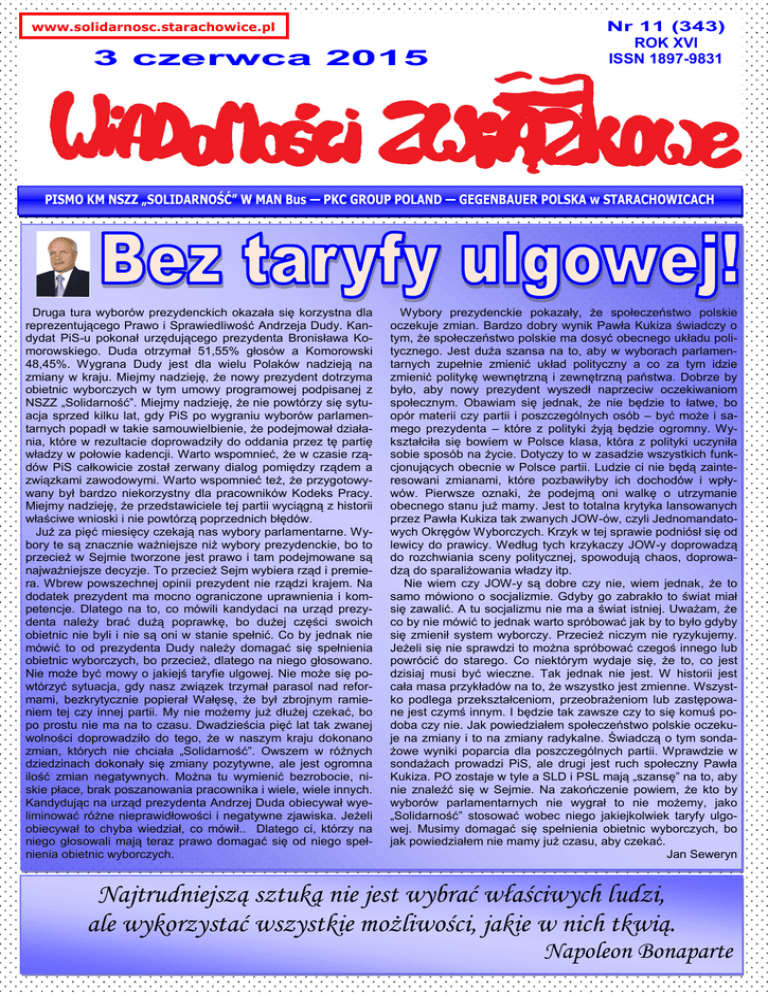 www.solidarnosc.starachowice.pl 3 czerwca 2015 Nr 11 (343) ROK XVI ISSN 1897-9831 PISMO KM NSZZ „SOLIDARNOŚĆ” W MAN Bus — PKC GROUP POLAND — GEGENBAUER POLSKA w STARACHOWICACH Druga tura wyborów prezydenckich okazała się korzystna dla reprezentującego Prawo i Sprawiedliwość Andrzeja Dudy. Kandydat PiS-u pokonał urzędującego prezydenta Bronisława Komorowskiego. Duda otrzymał 51,55% głosów a Komorowski 48,45%. Wygrana Dudy jest dla wielu Polaków nadzieją na zmiany w kraju. Miejmy nadzieję, że nowy prezydent dotrzyma obietnic wyborczych w tym umowy programowej podpisanej z NSZZ „Solidarność”. Miejmy nadzieję, że nie powtórzy się sytuacja sprzed kilku lat, gdy PiS po wygraniu wyborów parlamentarnych popadł w takie samouwielbienie, że podejmował działania, które w rezultacie doprowadziły do oddania przez tę partię władzy w połowie kadencji. Warto wspomnieć, że w czasie rządów PiS całkowicie został zerwany dialog pomiędzy rządem a związkami zawodowymi. Warto wspomnieć też, że przygotowywany był bardzo niekorzystny dla pracowników Kodeks Pracy. Miejmy nadzieję, że przedstawiciele tej partii wyciągną z historii właściwe wnioski i nie powtórzą poprzednich błędów. Już za pięć miesięcy czekają nas wybory parlamentarne. Wybory te są znacznie ważniejsze niż wybory prezydenckie, bo to przecież w Sejmie tworzone jest prawo i tam podejmowane są najważniejsze decyzje. To przecież Sejm wybiera rząd i premiera. Wbrew powszechnej opinii prezydent nie rządzi krajem. Na dodatek prezydent ma mocno ograniczone uprawnienia i kompetencje. Dlatego na to, co mówili kandydaci na urząd prezydenta należy brać dużą poprawkę, bo dużej części swoich obietnic nie byli i nie są oni w stanie spełnić. Co by jednak nie mówić to od prezydenta Dudy należy domagać się spełnienia obietnic wyborczych, bo przecież, dlatego na niego głosowano. Nie może być mowy o jakiejś taryfie ulgowej. Nie może się powtórzyć sytuacja, gdy nasz związek trzymał parasol nad reformami, bezkrytycznie popierał Wałęsę, że był zbrojnym ramieniem tej czy innej partii. My nie możemy już dłużej czekać, bo po prostu nie ma na to czasu. Dwadzieścia pięć lat tak zwanej wolności doprowadziło do tego, że w naszym kraju dokonano zmian, których nie chciała „Solidarność”. Owszem w różnych dziedzinach dokonały się zmiany pozytywne, ale jest ogromna ilość zmian negatywnych. Można tu wymienić bezrobocie, niskie płace, brak poszanowania pracownika i wiele, wiele innych. Kandydując na urząd prezydenta Andrzej Duda obiecywał wyeliminować różne nieprawidłowości i negatywne zjawiska. Jeżeli obiecywał to chyba wiedział, co mówił.. Dlatego ci, którzy na niego głosowali mają teraz prawo domagać się od niego spełnienia obietnic wyborczych. Wybory prezydenckie pokazały, że społeczeństwo polskie oczekuje zmian. Bardzo dobry wynik Pawła Kukiza świadczy o tym, że społeczeństwo polskie ma dosyć obecnego układu politycznego. Jest duża szansa na to, aby w wyborach parlamentarnych zupełnie zmienić układ polityczny a co za tym idzie zmienić politykę wewnętrzną i zewnętrzną państwa. Dobrze by było, aby nowy prezydent wyszedł naprzeciw oczekiwaniom społecznym. Obawiam się jednak, że nie będzie to łatwe, bo opór materii czy partii i poszczególnych osób – być może i samego prezydenta – które z polityki żyją będzie ogromny. Wykształciła się bowiem w Polsce klasa, która z polityki uczyniła sobie sposób na życie. Dotyczy to w zasadzie wszystkich funkcjonujących obecnie w Polsce partii. Ludzie ci nie będą zainteresowani zmianami, które pozbawiłyby ich dochodów i wpływów. Pierwsze oznaki, że podejmą oni walkę o utrzymanie obecnego stanu już mamy. Jest to totalna krytyka lansowanych przez Pawła Kukiza tak zwanych JOW-ów, czyli Jednomandatowych Okręgów Wyborczych. Krzyk w tej sprawie podniósł się od lewicy do prawicy. Według tych krzykaczy JOW-y doprowadzą do rozchwiania sceny politycznej, spowodują chaos, doprowadzą do sparaliżowania władzy itp. Nie wiem czy JOW-y są dobre czy nie, wiem jednak, że to samo mówiono o socjalizmie. Gdyby go zabrakło to świat miał się zawalić. A tu socjalizmu nie ma a świat istniej. Uważam, że co by nie mówić to jednak warto spróbować jak by to było gdyby się zmienił system wyborczy. Przecież niczym nie ryzykujemy. Jeżeli się nie sprawdzi to można spróbować czegoś innego lub powrócić do starego. Co niektórym wydaje się, że to, co jest dzisiaj musi być wieczne. Tak jednak nie jest. W historii jest cała masa przykładów na to, że wszystko jest zmienne. Wszystko podlega przekształceniom, przeobrażeniom lub zastępowane jest czymś innym. I będzie tak zawsze czy to się komuś podoba czy nie. Jak powiedziałem społeczeństwo polskie oczekuje na zmiany i to na zmiany radykalne. Świadczą o tym sondażowe wyniki poparcia dla poszczególnych partii. Wprawdzie w sondażach prowadzi PiS, ale drugi jest ruch społeczny Pawła Kukiza. PO zostaje w tyle a SLD i PSL mają „szansę” na to, aby nie znaleźć się w Sejmie. Na zakończenie powiem, że kto by wyborów parlamentarnych nie wygrał to nie możemy, jako „Solidarność” stosować wobec niego jakiejkolwiek taryfy ulgowej. Musimy domagać się spełnienia obietnic wyborczych, bo jak powiedziałem nie mamy już czasu, aby czekać. Jan Seweryn Najtrudniejszą sztuką nie jest wybrać właściwych ludzi, ale wykorzystać wszystkie możliwości, jakie w nich tkwią. Napoleon Bonaparte Nr 11 (343) Wiadomości Związkowe 3.06.2015 Spotkanie w MAN Podczas spotykania związków zawodowych z przedstawicielami MAN-a uzyskaliśmy dokładne informacje co do harmonogramu przenoszenia produkcji z Poznania i związanymi z tym przyjęciami do pracy w MAN w Starachowicach. Ponad to NSZZ „Solidarność” poruszył wiele spraw, z którymi pracownicy do Zw