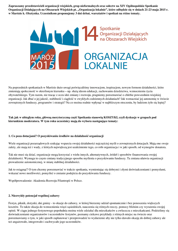 Zapraszamy przedstawicieli organizacji wiejskich, grup nieformalnych oraz sołectw na XIV Ogólnopolskie Spotkanie Organizacji Działających na Obszarach Wiejskich pt. „Organizacja lokalnie”, które odbędzie się w dniach 21-23 maja 2015 r. w Marózie k. Olsztynka. Uczestnikom proponujemy 3 dni debat, warsztatów i spotkań na różne tematy. Na poprzednich spotkaniach w Marózie dużo uwagi poświęcaliśmy innowacjom, inspiracjom, nowym formom działalności, które zmieniają społeczność w określonym kierunku – np. służą ideom edukacji, zachowaniu dziedzictwa, wzmocnieniu życia obywatelskiego. Tym razem, nie tracąc z oczu idei zmiany i rozwoju, pragniemy porozmawiać o chlebie powszednim wiejskiej organizacji. Jak dbać o jej jakość, stabilność i ciągłość w zwykłych codziennych działaniach? Jak wzmacniać jej autonomię w świecie zewnętrznych funduszy, programów i strategii? Na co można realnie wpłynąć w najbliższym otoczeniu, by ludziom żyło się lepiej? Tak jak w ubiegłym roku, główną merytoryczną część Spotkania stanowią KOSZYKI, czyli dyskusje w grupach pod kierunkiem moderatora. W tym roku uczestnicy mają do wyboru następujące tematy: 1. Co poza dotacjami? O pozyskiwaniu środków na działalność organizacji Wiele organizacji pozarządowych szukając wsparcia swojej działalności najczęściej myśli o zewnętrznych dotacjach. Mają one swoje zalety, ale mają też i wady, z których największą jest uzależnienie tego, co robi organizacja i w jaki sposób, od wymogów donatora. Tak nie musi się dziać, organizacje mogą korzystać z wielu innych, alternatywnych, źródeł i sposobów finansowania swojej działalności. Wymaga to często zmiany tradycyjnego sposobu myślenia o pozyskiwaniu funduszy. Ta zmiana ułatwia organizacji prowadzenie autonomicznej, w miarę stabilnej działalności. Jak to osiągnąć? O tym chcemy porozmawiać w trakcie spotkania, wymieniając się dobrymi i złymi doświadczeniami i pomysłami, wskazać nowe możliwości, pomyśleć o zmianie podejścia do pozyskiwania funduszy. Współprowadzenie: Akademia Rozwoju Filantropii w Polsce. 2. Niezwykły potencjał wspólnej zabawy Festyn, piknik, dożynki, dni gminy - to okazje do zabawy, w której bierzemy udział spontanicznie i bez ponoszenia większych kosztów. To także okazja do wzmocnienia więzi sąsiedzkich, nauczenia się różnych rzeczy, pomocy bliźnim czy wyrażenia swojej opinii. W ciągu jednego festynowego popołudnia można wiele zdziałać dla mieszkańców a zwłaszcza z mieszkańcami. Podzielimy się doświadczeniami organizatorów i uczestników festynów, poznamy ciekawe przykłady z różnych miejsc na świecie oraz porozmawiamy o tym, w jaki sposób zaplanować i przeprowadzić to wydarzenie aby nie tylko dawało okazję do dobrej zabawy ale też angażowało, integrowało i zachwycało jego uczestników. 3. Poza moim podwórkiem Jak mogę wpłynąć na to, aby w mojej wsi było ładniej i wygodniej? Jakie potrzeby związane z przestrzenią mają różne grupy mieszkańców i w jaki sposób możemy je zaspokoić działając w organizacji? Dyskutować będziemy m.in. o społecznych konsultacjach przy tworzeniu prawa miejscowego, akcjach podejmowanych przez mieszkańców na rzecz wspólnych przestrzeni, wpływie na decyzje rady gminy, ratowaniu zabytków. Porozmawiamy również o tym, co decyduje, że w danym miejscu czujemy się dobrze i bezpiecznie, co temu przeszkadza oraz w jaki sposób tworzyć miejsca przyjazne do życia i działania. 4. Nasz fundusz sołecki Fundusz sołecki jest narzędziem służącym poprawie życia mieszkańców danej wsi, jednocześnie zaś kształtuje postawy obywatelskie, zachęcając ludzi do wpływania na ważne dla nich sprawy. Byłoby dobrze, gdyby jak najszersze grono mieszkańców angażowało się w decydowanie o jego przeznaczeniu. Czy tak jest w rzeczywistości? Wymienimy się doświadczeniami z wdrażania funduszy tworząc listę najważniejszych problemów i wskazując ich przyczyny. Określimy co należy zmienić w dotychczasowej praktyce. Współprowadzenie: Instytut Spraw Publicznych. UWAGA! Zapraszamy osoby (szczególnie sołtysów) z gmin, w których działa już fundusz sołecki. Warsztaty 4-godzinne warsztaty dla 20-osobowych grup będą tematycznie powiązane z koszykami i dostarczą uczestnikom konkretnych umiejętności. Dobre praktyki W Marózie nie może zabraknąć inspiracji i pomysłów. Pokażemy konkretne przykłady udanych projektów, działań itp. do wykorzystania przez każdą organizację. Wśród nich znajdą się wioski tematyczne, praktyczne zabawy i konkursy do wykorzystania na festynie, i wiele, wiele innych. Kultura i rozrywka Prócz wieczornych koncertów i seansów filmowych oferujemy uczestnikom możliwość podzielenia się swoimi talentami i pasjami (np. muzyką, tańcem) na oddzielnych scenach. Organizatorami spotkania są Fundacja Wspomagania Wsi i Nidzicka Fundacja Rozwoju NIDA. Spotkanie współfinansowane jest przez Fundację Wspomagania Wsi i Polsko-Amerykańską Fundację Wolności. Powered by TCPDF (www.tcpdf.org)