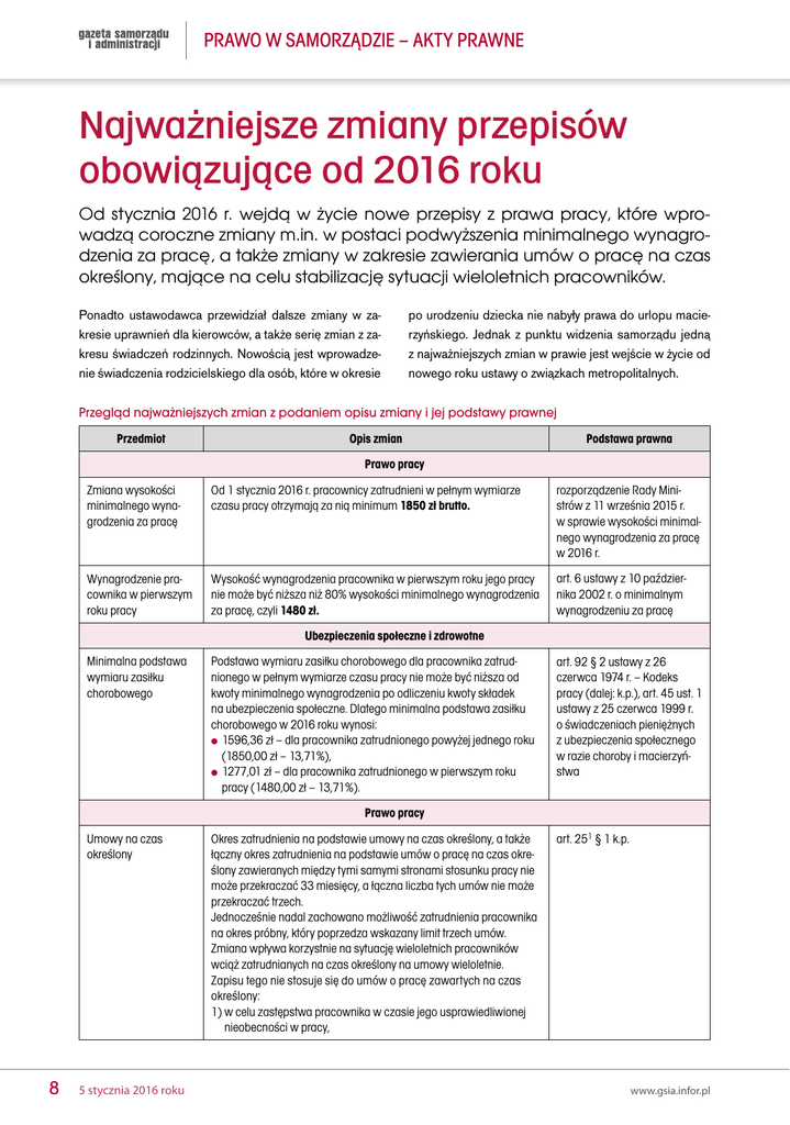 PRAWO W SAMORZĄDZIE – AKTY PRAWNE Najważniejsze zmiany przepisów obowiązujące od 2016 roku Od stycznia 2016 r. wejdą w życie nowe przepisy z prawa pracy, które wprowadzą coroczne zmiany m.in. w postaci podwyższenia minimalnego wynagrodzenia za pracę, a także zmiany w zakresie zawierania umów o pracę na czas określony, mające na celu stabilizację sytuacji wieloletnich pracowników. Ponadto ustawodawca przewidział dalsze zmiany w zakresie uprawnień dla kierowców, a także serię zmian z zakresu świadczeń rodzinnych. Nowością jest wprowadzenie świadczenia rodzicielskiego dla osób, które w okresie po urodzeniu dziecka nie nabyły prawa do urlopu macierzyńskiego. Jednak z punktu widzenia samorządu jedną z najważniejszych zmian w prawie jest wejście w życie od nowego roku ustawy o związkach metropolitalnych. Przegląd najważniejszych zmian z podaniem opisu zmiany i jej podstawy prawnej Przedmiot Opis zmian Podstawa prawna Prawo pracy Zmiana wysokości minimalnego wynagrodzenia za pracę Od 1 stycznia 2016 r. pracownicy zatrudnieni w pełnym wymiarze czasu pracy otrzymają za nią minimum 1850 zł brutto. rozporządzenie Rady Ministrów z 11 września 2015 r. w sprawie wysokości minimalnego wynagrodzenia za pracę w 2016 r. Wynagrodzenie pracownika w pierwszym roku pracy Wysokość wynagrodzenia pracownika w pierwszym roku jego pracy nie może być niższa niż 80% wysokości minimalnego wynagrodzenia za pracę, czyli 1480 zł. art. 6 ustawy z 10 października 2002 r. o minimalnym wynagrodzeniu za pracę Ubezpieczenia społeczne i zdrowotne Minimalna podstawa wymiaru zasiłku chorobowego Podstawa wymiaru zasiłku chorobowego dla pracownika zatrudnionego w pełnym wymiarze czasu pracy nie może być niższa od kwoty minimalnego wynagrodzenia po odliczeniu kwoty składek na ubezpieczenia społeczne. Dlatego minimalna podstawa zasiłku chorobowego w 2016 roku wynosi: ●● 1596,36 zł – dla pracownika zatrudnionego powyżej jednego roku (1850,00 zł – 13,71%), ●● 1277,01 zł – dla pracownika zatrudnionego w pierwszym roku pracy (1480,00 zł – 13,71%). art. 92 § 2 ustawy z 26 czerwca 1974 r. – Kodeks pracy (dalej: k.p.), art. 45 ust. 1 ustawy z 25 czerwca 1999 r. o świadczeniach pieniężnych z ubezpieczenia społecznego w razie choroby i macierzyństwa Prawo pracy Umowy na czas określony 8 5 stycznia 2016 roku Okres zatrudnienia na podstawie umowy na czas określony, a także łączny okres zatrudnienia na podstawie umów o pracę na czas określony zawieranych między tymi samymi stronami stosunku pracy nie może przekraczać 33 miesięcy, a łączna liczba tych umów nie może przekraczać trzech. Jednocześnie nadal zachowano możliwość zatrudnienia pracownika na okres próbny, który poprzedza wskazany limit trzech umów. Zmiana wpływa korzystnie na sytuację wieloletnich pracowników wciąż zatrudnianych na czas określony na umowy wieloletnie. Zapisu tego nie stosuje się do umów o pracę zawartych na czas określony: 1) w celu zastępstwa pracownika w czasie jego usprawiedliwionej nieobecności w pracy, art. 251 § 1 k.p. www.gsia.infor.pl PRAWO W SAMORZĄDZIE – AKTY PRAWNE Przedmiot Opis zmian Podstawa prawna 2) w celu wykonywania pracy o charakterze dorywczym lub sezonowym, 3) w celu wykonywania pracy przez okres kadencji, 4) w przypadku gdy pracodawca wskaże obiektywne przyczyny leżące po jego stronie – jeżeli ich zawarcie w danym przypadku służy zaspokojeniu rzeczywistego okresowego zapotrzebowania i jest niezbędne w tym zakresie w świetle wszystkich okoliczności zawarcia umowy. O przedłużeniu obowiązywania umowy terminowej należy jednak zawiadomić okręgowego inspektora pracy, a sama przyczyna odstępstwa musi być wskazana już w umowie o pracę. Niepowiadomienie okręgowego inspektora pracy skutkuje karą grzywny określoną w przepisach k.p. od 1 tys. do 30 tys. zł. Okresy wypowiedzenia Zrównane zostają okresy wypowiedzenia umowy o pracę zawartej na czas określony i na czas nieokreślony i są one uzależnione od okresu zatrudnienia u danego pracodawcy. Należy jednak zwrócić uwagę na fakt, że pracodawca, ustalając długość wypowiedzenia pracownika zatrudnionego na czas określony, nie ma obowiązku uwzględnienia zatrudnienia, które miało miejsce przed wejściem w życie nowelizacji do k.p. Jednocześnie dezaktualizacji ulega obowiązujący dotąd art. 33 k.p., zgodnie z którym umowy na czas określony mogą podlegać wypowiedzeniu, jeżeli strony w umowie o pracę dopuściły możliwość 14-dniowego wypowiedzenia. art. 36 § 1 k.p. Zwolnienie pracownika z obowiązku świadczenia pracy Pracodawca jednostronną decyzją ma możliwość zwolnienia pracownika ze świadczenia pracy z zachowaniem prawa do wynagrodzenia. art. 36 § 2 k.p. Świadczenia rodzinne Wzrost wysokości świadczeń Od 1 listopada 2016 r. zasiłek rodzinny będzie wynosił 95,00 zł na dziecko w wieku do ukończenia 5. roku życia, natomiast 124,00 zł będzie przysługiwało na dziecko w wieku powyżej 5. roku życia do ukończenia 18. roku życia, zaś zasiłek rodzinny w wysokości 135 zł przysługuje na dziecko w wieku powyżej 18. roku życia do ukończenia 24. roku życia. Dodatek do zasiłku rodzinnego z tytułu samotnego wychowywania dziecka to 193,00 zł miesięcznie na dziecko, nie więcej jednak niż 386,00 zł na wszystkie dzieci. Dodatek do zasiłku rodzinnego z tytułu wychowywania dziecka w rodzinie wielodzietnej, wyniesie 95,00 zł miesięcznie na trzecie i na następne dzieci uprawnione do zasiłku rodzinnego. A dodatek do zasiłku rodzinnego z tytułu kształcenia i rehabilitacji dziecka niepełnosprawnego, to: a) 90,00 zł miesięcznie na dziecko w wieku do ukończenia 5. roku życia, b) 110,00 zł miesięcznie na dziecko w wieku powyżej 5. roku życia do ukończenia 24. roku życia. Dodatek do zasiłku rodzinnego z tytułu podjęcia przez dziecko nauki w szkole poza miejscem zamieszkania w wysokośc