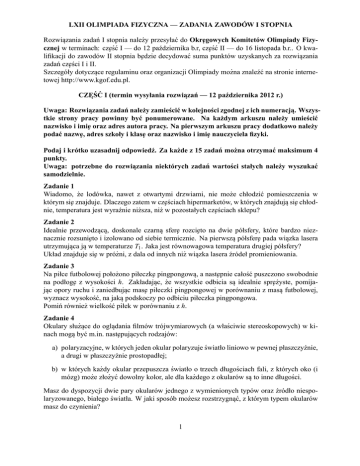 LXII OLIMPIADA FIZYCZNA — ZADANIA ZAWODÓW I STOPNIA Rozwiazania ˛ zadań I stopnia należy przesyłać do Okr˛egowych Komitetów Olimpiady Fizycznej w terminach: cz˛eść I — do 12 października b.r, cz˛eść II — do 16 listopada b.r.. O kwalifikacji do zawodów II stopnia b˛edzie decydować suma punktów uzyskanych za rozwiazania ˛ zadań cz˛eści I i II. Szczegóły dotyczace ˛ regulaminu oraz organizacji Olimpiady można znaleźć na stronie internetowej http://www.kgof.edu.pl. CZE˛ŚĆ I (termin wysyłania rozwiaza ˛ ń — 12 października 2012 r.) Uwaga: Rozwiazania ˛ zadań należy zamieścić w kolejności zgodnej z ich numeracja.˛ Wszystkie strony pracy powinny być ponumerowane. Na każdym arkuszu należy umieścić nazwisko i imi˛e oraz adres autora pracy. Na pierwszym arkuszu pracy dodatkowo należy podać nazw˛e, adres szkoły i klas˛e oraz nazwisko i imi˛e nauczyciela fizyki. Podaj i krótko uzasadnij odpowiedź. Za każde z 15 zadań można otrzymać maksimum 4 punkty. Uwaga: potrzebne do rozwiazania ˛ niektórych zadań wartości stałych należy wyszukać samodzielnie. Zadanie 1 Wiadomo, że lodówka, nawet z otwartymi drzwiami, nie może chłodzić pomieszczenia w którym si˛e znajduje. Dlaczego zatem w cz˛eściach hipermarketów, w których znajduja˛ si˛e chłodnie, temperatura jest wyraźnie niższa, niż w pozostałych cz˛eściach sklepu? Zadanie 2 Idealnie przewodzac ˛ a,˛ doskonale czarna˛ sfer˛e rozci˛eto na dwie półsfery, które bardzo nieznacznie rozsuni˛eto i izolowano od siebie termicznie. Na pierwsza˛ półsfer˛e pada wiazka ˛ lasera utrzymujaca ˛ ja˛ w temperaturze T1 . Jaka jest równowagowa temperatura drugiej półsfery? Układ znajduje si˛e w próżni, z dala od innych niż wiazka ˛ lasera źródeł promieniowania. Zadanie 3 Na piłce futbolowej położono piłeczk˛e pingpongowa,˛ a nast˛epnie całość puszczono swobodnie na podłog˛e z wysokości h. Zakładajac, ˛ że wszystkie odbicia sa˛ idealnie spr˛eżyste, pomijajac ˛ opory ruchu i zaniedbujac ˛ mas˛e piłeczki pingpongowej w porównaniu z masa˛ futbolowej, wyznacz wysokość, na jaka˛ podskoczy po odbiciu piłeczka pingpongowa. Pomiń również wielkość piłek w porównaniu z h. Zadanie 4 Okulary służace ˛ do ogladania ˛ filmów trójwymiarowych (a właściwie stereoskopowych) w kinach moga˛ być m.in. nast˛epujacych ˛ rodzajów: a) polaryzacyjne, w których jeden okular polaryzuje światło liniowo w pewnej płaszczyźnie, a drugi w płaszczyźnie prostopadłej; b) w których każdy okular przepuszcza światło o trzech długościach fali, z których oko (i mózg) może złożyć dowolny kolor, ale dla każdego z okularów sa˛ to inne długości. Masz do dyspozycji dwie pary okularów jednego z wymienionych typów oraz źródło niespolaryzowanego, białego światła. W jaki sposób możesz rozstrzygnać, ˛ z którym typem okularów masz do czynienia? 1 Zadanie 5 Wykorzystujac ˛ nitk˛e zawieszono na statywie mały ci˛eżarek, a nast˛epnie wprawiono go w ruch. Rzut toru tego ci˛eżarka na płaszczyzn˛e pozioma˛ jest przedstawiony na rysunku. Narysuj szkic układu, w którym można otrzymać taki rzut toru oraz podaj jego istotne parametry. Zadanie 6 Na Ksi˛eżycu przeprowadzono zawody w strzelaniu z armat na odległość. Pociski wystrzeliwano pod katem ˛ 45o z bieguna Ksi˛eżyca, a odległość mierzono wzdłuż południków. Wiadomo, że wpływ innych ciał niebieskich na ruch pocisku był zaniedbywalny. W komunikacie prasowym podano, że najlepsza armata osiagn˛ ˛ eła wynik 9 tys. km. Jednak pewien fizyk po przeczytaniu tego komunikatu stwierdził, że taki rezultat jest niemożliwy. Dlaczego? Zadanie 7 Postanowiono, że w trakcie "Ekologicznej wyprawy kosmicznej", w czasie gdy statek kosmiczny porusza si˛e z wyłaczonym ˛ nap˛edem z dala od gwiazd, energia elektryczna b˛edzie wytwarzana wyłacznie ˛ przez silnik cieplny, pobierajacy ˛ ciepło z ciała podróżników. Jaka jest (teoretycznie) maksymalna sprawność takiego silnika? Wynik podaj z dokładnościa˛ do 0, 2%. Zadanie 8 Wewnatrz ˛ hermetycznie zamkni˛etego naczynia w kształcie walca o wysokości h znajduje si˛e H2 O. W stanie poczatkowym ˛ temperatura wody i pary wynosi 20 o C, a powierzchnia rozdziału para-woda jest w połowie wysokości naczynia, tzn. na wysokości h/2. Temperatur˛e we wn˛etrzu naczynia podwyższono do 400 o C. Na jakim poziomie b˛edzie znajdowała si˛e powierzchnia rozdziału para-woda: a) nie wi˛ekszej niż h/4, ale wi˛ekszej niż 0, b) nie wi˛ekszej niż h/2 ale wi˛ekszej niż h/4, c) mniejszej niż h ale wi˛ekszej niż h/2, d) w ogóle nie b˛edzie powierzchni rozdziału para-woda. Zadanie 9 W odległości d od małego, ale silnego magnesu, na jego osi, znajduje si˛e mała kulka wykonana z paramagnetyka. Ile razy wzrośnie siła działajaca ˛ na kulk˛e, jeśli drugi taki sam magnes umieścimy (patrz rysunek): (i) tuż obok pierwszego magnesu, 2 (ii) w odległości 2d od pierwszego magnesu, po "drugiej stronie" kulki? Zadanie 10 Przez nieważki bloczek jest przerzucona nieważka lina. Jeden koniec trzyma sportowiec A o masie m, a drugi – sportowiec B o masie 2m. Sportowcy poczatkowo ˛ stoja˛ na podłodze, a w pewnej chwili zaczynaja˛ si˛e wspinać po linie: sportowiec A z przyspieszeniem g wzgl˛edem liny, sportowiec B z przyspieszeniem 2g wzgl˛edem liny. Który ze sportowców szybciej dotrze do bloczka? Pomiń opory ruchu i przyjmij, że liny cały czas pozostaja˛ pionowe. Zadanie 11 Prostopadłościenne akwarium z woda˛ stoi na obracajacej ˛ si˛e tarczy. Naszkicuj (w rzucie prostopadłym na najwi˛eksza˛ pionowa˛ ścian˛e akwarium) tor, po którym b˛eda˛ si˛e poruszały babelki ˛ powietrza wydobywajace ˛ si˛e z pompki akwariowej. Zadanie 12 Planowana energia protonów w akceleratorze LHC w CERN pod Genewa˛ wynosi 7 TeV. Rozważmy obserwatora inercjalnego, poruszajacego ˛ si˛e wzgl˛e