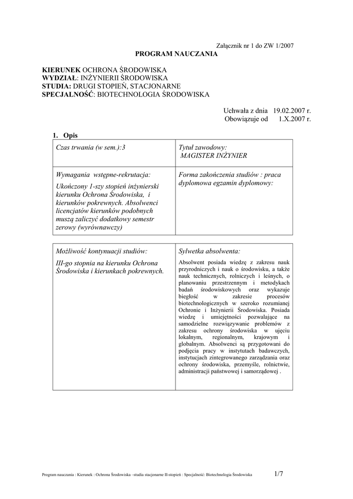 Załącznik nr 1 do ZW 1/2007 PROGRAM NAUCZANIA KIERUNEK OCHRONA ŚRODOWISKA WYDZIAŁ: INŻYNIERII ŚRODOWISKA STUDIA: DRUGI STOPIEŃ, STACJONARNE SPECJALNOŚĆ: BIOTECHNOLOGIA ŚRODOWISKA Uchwała z dnia 19.02.2007 r. Obowiązuje od 1.X.2007 r. 1. Opis Czas trwania (w sem.):3 Tytuł zawodowy: MAGISTER INŻYNIER Wymagania wstępne-rekrutacja: Forma zakończenia studiów : praca dyplomowa egzamin dyplomowy: Ukończony 1-szy stopień inżynierski kierunku Ochrona Środowiska, i kierunków pokrewnych. Absolwenci licencjatów kierunków podobnych muszą zaliczyć dodatkowy semestr zerowy (wyrównawczy) Możliwość kontynuacji studiów: Sylwetka absolwenta: III-go stopnia na kierunku Ochrona Środowiska i kierunkach pokrewnych. Absolwent posiada wiedzę z zakresu nauk przyrodniczych i nauk o środowisku, a także nauk technicznych, rolniczych i leśnych, o planowaniu przestrzennym i metodykach badań środowiskowych oraz wykazuje biegłość w zakresie procesów biotechnologicznych w szeroko rozumianej Ochronie i Inżynierii Środowiska. Posiada wiedzę i umiejętności pozwalające na samodzielne rozwiązywanie problemów z zakresu ochrony środowiska w ujęciu lokalnym, regionalnym, krajowym i globalnym. Absolwenci są przygotowani do podjęcia pracy w instytutach badawczych, instytucjach zintegrowanego zarządzania oraz ochrony środowiska, przemyśle, rolnictwie, administracji państwowej i samorządowej . Program nauczania : Kierunek : Ochrona Środowiska –studia stacjonarne II-stopień : Specjalność: Biotechnologia Środowiska 1/7 2. Struktura programu nauczania 1) w układzie punktowym Struktura programu w ukladzie punktowym ECTS 47 ponkty ECTS 50 40 30 20 17 20 3 3 10 Pr ze dm io ty Pr ni ze et dm ec h. i o .. Pr ty ze po dm ds t.. io . t y Pr k ie ze ru dm n. io .. ty sp ec pr ac ja ... a dy pl om ow a 0 2) w układzie godzinowym Struktura programu w układzie godzinowym 600 210 sp ec ja ... n. ru io Pr ze dm io dm ty kie ty ty io Pr ze dm Pr ze .. . t.. ds po et ni ty io Pr ze dm 30 60 ec h. .. lość godzin, godziny 600 500 400 300 200 100 0 Program nauczania : Kierunek : Ochrona Środowiska –studia stacjonarne II-stopień : Specjalność: Biotechnologia Środowiska 2/7 Ramowy program studiów stacjonarnych drugiego stopnia Wydział Inżynierii Środowiska , Kierunek: Ochrona Środowiska, Specjalizacja: Biotechnologia Środowiska Kurs wybieralny 10000 (1) 24 23 22 21 20 19 18 17 Kurs wybieralny 10000 (1) Język Obcy 04000 (3) Inżynieria biofilmów i korozja mikrobiologiczna 10001 (1+1) Enzymologia 00101 (2+1) 16 15 14 13 12 11 10 9 8 7 Kurs wybieralny 10000 (1) Genetyka z elementami inżynierii genetycznej 20101 E (2+1+1) Biologiczne oczyszczanie gazów 10100 (1+1) Procesy membranowe w biotechnologii 20000 (3) Recykling wybranych grup odpadów 10101 (2+1+1) Praca Dyplomowa Magisterska (15 godzin) – p – 20 pkt ECTS Procedury korzystania ze środowiska 00002 (2) Remediacja środowisk wodno-gruntowych 10002 E (2+2) Procesy biologiczne w uzdatnianiu i dystrybucji wody 10100 (2+1) Mutageneza i karcynogeneza środowiska 10001 E (2+1) Hydrobiologia wód śródlądowych 10100 (1+1) 6 Monitoring biologiczny 21100 E (3+1+1) Biologia osadu czynnego i złóż biologicznych 10100 (1+1) Seminarium dyplomowe 00002 (2) Biotechnologia w gospodarce odpadami 20000 (2) Materiały biodegradowalne 11000 (1+1) Ekotoksykologia 20200 E (3+3) Środowiskowe zagrożenia zdrowia 20000 (3) 1 Statystyka i modelowanie w naukach o środowisku 10001(2+1) Gospodarowanie przestrzenią i planowanie przestrzenne 30000 (3) Polityka ochrony środowiska 10001(1+1) g/t I semestr II semestr III semestr 5 4 3 2 Rewaloryzacja krajobrazu 10001 (1+1) Legenda Przedmioty podstawowe Przedmioty kierunkowe Przedmioty specjalnościowe Przedmioty wybieralne Oznaczenia: 21020 -liczba godzin tygodniu odpowiednio: wykłady, ćwiczenia, laboratorium, projekt, seminarium (2+1+2) – punkty ECTS przypisane kolejno ( w tym przypadku do : wykładu, ćwiczeń i ćwiczeń projektowych) Program nauczania : Kierunek : Ochrona Środowiska –studia stacjonarne II-stopień : Specjalność: Biotechnologia Środowiska 3/7 3. Lista kursów L.p. Kod kursu/ grupy kursów Tygodniowa liczba godzin Nazwa kursu/grupy kursów w ć l p s Liczba godzin ZZU Liczba godzin CNPS Liczba punktów ECTS Forma zaliczenia 1 OSS2001 Język obcy 0 4 0 0 0 60 90 3 2 OSS2002 Statystyka i modelowanie w naukach o środowisku 1 0 0 0 1 30 90 2+1 3 OSS2003 Ekotoksykologia 2 0 2 0 0 60 180 3+3 4 OSS2004 Środowiskowe zagrożenia zdrowia 2 0 0 0 0 30 90 3 5 OSS2005 Gospodarowanie przestrzenią i planowanie przestrzenne 3 0 0 0 0 45 90 3 6 OSS2006 Polityka ochrony środowiska 1 0 0 0 1 30 60 1+1 10 OSS2010 Kurs wybieralny 1 0 0 0 0 15 30 1 11 OSS2011 Praca dyplomowa magisterska 0 0 0 15 0 225 600 20 12 OSS2012 Seminarium dyplomowe 0 0 0 0 2 30 60 2 13 OSS2013 Inżynieria biofilmów i korozja mikrobiologiczna 1 0 0 0 1 30 60 1+1 14 OSS2014 Enzymologia 0 0 1 0 1 30 90 2+1 15 OSS2015 Genetyka z elementami inżynierii genetycznej 2 0 1 0 1 60 120 2+1+1 16 OSS2016 Procesy biologiczne w uzdatnianiu i dystrybucji wody 1 0 1 0 0 30 90 2+1 17 OSS2017 Mutageneza i karcenogeneza środowiska 1 0 0 0 1 30 90 2+1 18 OSS2018 Hydrobiologia wód śródlądowych 1 0 1 0 0 30 60 1+1 19 OSS2019 Biologiczne oczyszczanie gazów 1 0 1 0 0 30 60 1+1 20 OSS2020 Procesy membranowe w biotechnologii 2 0 0 0 0 30 90 3 21 OSS2021 Recykling wybranych grup odpadów 1 0 1 0 1 45 120 2+1+1 22 OSS2022 Procedury korzystania ze środowiska 0 0 0 0 2 30 60 2 23 OSS2023 Remediacja środowisk wodno-gruntowych 1 0 0 0 2 45 120 2+2 E 24 OSS2024 Monitoring biologiczny 2 1 1 0 0 60 150 3+1+1 E 25 OSS2025 Biologia osadu czynnego i złóż biologicznych 1 0 1 0 0 30 60 1+1 26 OSS2026 Biotechnologia w gospodarce odpadami 2 0 0 0 0 30 60 2 27 OSS2027 Materiały biodegradowalne 1 1 0 0 0 30 60 1+1 28 OSS2028 Rewaloryzacja krajobrazu 1 0 0 0 1 30 60 1+1 29 ISW1047 Urządzenia kontrolno-pomiarowe w biotechnologii środ