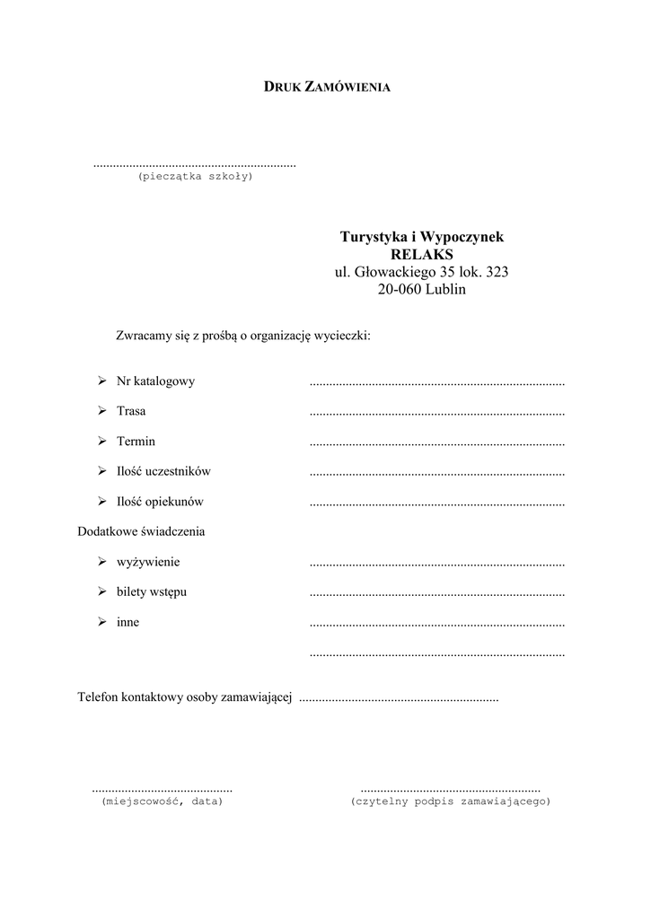 DRUK ZAMÓWIENIA .............................................................. (pieczątka szkoły) Turystyka i Wypoczynek RELAKS ul. Głowackiego 35 lok. 323 20-060 Lublin Zwracamy się z prośbą o organizację wycieczki: Nr katalogowy .............................................................................. Trasa .............................................................................. Termin .............................................................................. Ilość uczestników .............................................................................. Ilość opiekunów .............................................................................. Dodatkowe świadczenia wyżywienie .............................................................................. bilety wstępu .............................................................................. inne .............................................................................. .............................................................................. Telefon kontaktowy osoby zamawiającej ............................................................. ........................................... ....................................................... (miejscowość, data) (czytelny podpis zamawiającego)