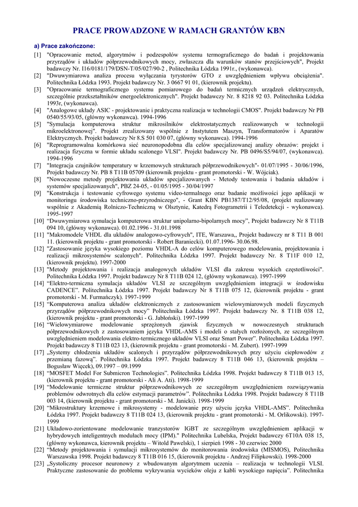 PRACE PROWADZONE W RAMACH GRANTÓW KBN a) Prace zakończone: [1] "Opracowanie metod, algorytmów i podzespołów systemu termograficznego do badań i projektowania przyrządów i układów półprzewodnikowych mocy, zwłaszcza dla warunków stanów przejściowych", Projekt badawczy Nr. I16/0181/179/DSN-T/05/027/90-2 , Politechnika Łódzka 1991r., (wykonawca). [2] "Dwuwymiarowa analiza procesu wyłączania tyrystorów GTO z uwzględnieniem wpływu obciążenia". Politechnika Łódzka 1993. Projekt badawczy Nr. 3 0667 91 01, (kierownik projektu). [3] "Opracowanie termograficznego systemu pomiarowego do badań termicznych urządzeń elektrycznych, szczególnie przekształtników energoelektronicznych". Projekt badawczy Nr. 8 8218 92 03. Politechnika Łódzka 1993r, (wykonawca). [4] "Analogowe układy ASIC - projektowanie i praktyczna realizacja w technologii CMOS". Projekt badawczy Nr PB 0540/55/93/05, (główny wykonawca). 1994-1996 [5] "Symulacja komputerowa struktur mikrosilników elektrostatycznych realizowanych w technologii mikroelektronowej". Projekt zrealizowany wspólnie z Instytutem Maszyn, Transformatorów i Aparatów Elektrycznych. Projekt badawczy Nr 8.S 501 030 07, (główny wykonawca). 1994-1996 [6] "Reprogramowalna komórkowa sieć neuronopodobna dla celów specjalizowanej analizy obrazów: projekt i realizacja fizyczna w formie układu scalonego VLSI". Projekt badawczy Nr. PB 0496/S5/94/07, (wykonawca). 1994-1996 [7] "Integracja czujników temperatury w krzemowych strukturach półprzewodnikowych"- 01/07/1995 - 30/06/1996, Projekt badawczy Nr. PB 8 T11B 05709 (kierownik projektu - grant promotorski - W. Wójciak). [8] "Nowoczesne metody projektowania układów specjalizowanych - Metody testowania i badania układów i systemów specjalizowanych", PBZ 24-05, - 01/05/1995 - 30/04/1997 [9] "Konstrukcja i testowanie cyfrowego systemu video-termalnego oraz badanie możliwości jego aplikacji w monitoringu środowiska techniczno-przyrodniczego", - Grant KBN PB1387/T12/95/08, (projekt realizowany wspólnie z Akademią Rolniczo-Techniczną w Olsztynie, Katedrą Fotogrametrii i Teledetekcji - wykonawca). 1995-1997 [10] “Dwuwymiarowa symulacja komputerowa struktur unipolarno-bipolarnych mocy”, Projekt badawczy Nr 8 T11B 094 10, (główny wykonawca). 01.02.1996 - 31.01.1998 [11] "Makromodele VHDL dla układów analogowo-cyfrowych", ITE, Warszawa,, Projekt badawczy nr 8 T11 B 001 11. (kierownik projektu - grant promotorski - Robert Baraniecki). 01.07.1996- 30.06.98. [12] "Zastosowanie języka wysokiego poziomu VHDL-A do celów komputerowego modelowania, projektowania i realizacji mikrosystemów scalonych". Politechnika Łódzka 1997. Projekt badawczy Nr. 8 T11F 010 12, (kierownik projektu). 1997-2000 [13] "Metody projektowania i realizacja analogowych układów VLSI dla zakresu wysokich częstotliwości". Politechnika Łódzka 1997. Projekt badawczy Nr 8 T11B 024 12, (główny wykonawca). 1997-1999 [14] “Elektro-termiczna symulacja układów VLSI ze szczególnym uwzględnieniem integracji w środowisku CADENCE”. Politechnika Łódzka 1997. Projekt badawczy Nr 8 T11B 075 12, (kierownik projektu - grant promotorski - M. Furmańczyk). 1997-1999 [15] “Komputerowa analiza układów elektronicznych z zastosowaniem wielowymiarowych modeli fizycznych przyrządów półprzewodnikowych mocy” Politechnika Łódzka 1997. Projekt badawczy Nr. 8 T11B 038 12, (kierownik projektu - grant promotorski - G. Jabłoński). 1997-1999 [16] “Wielowymiarowe modelowanie sprzężonych zjawisk fizycznych w nowoczesnych strukturach półprzewodnikowych z zastosowaniem języka VHDL-AMS i modeli o stałych rozłożonych, ze szczególnym uwzględnieniem modelowania elektro-termicznego układów VLSI oraz Smart Power”. Politechnika Łódzka 1997. Projekt badawczy 8 T11B 023 13, (kierownik projektu - grant promotorski - M. Zubert). 1997-1999 [17] „Systemy chłodzenia układów scalonych i przyrządów półprzewodnikowych przy użyciu ciepłowodów z przemianą fazową”. Politechnika Łódzka 1997. Projekt badawczy 8 T11B 046 13, (kierownik projektu – Bogusław Więcek), 09.1997 – 09.1999 [18] “MOSFET Model For Submicron Technologies”. Politechnika Łódzka 1998. Projekt badawczy 8 T11B 013 15, (kierownik projektu - grant promotorski - Ali A. Ati). 1998-1999 [19] “Modelowanie termiczne struktur półprzewodnikowych ze szczególnym uwzględnieniem rozwiązywania problemów odwrotnych dla celów estymacji parametrów”. Politechnika Łódzka 1998. Projekt badawczy 8 T11B 003 14, (kierownik projektu - grant promotorski - M. Janicki). 1998-1999 [20] “Mikrostruktury krzemowe i mikrosystemy - modelowanie przy użyciu języka VHDL-AMS”. Politechnika Łódzka 1997. Projekt badawczy 8 T11B 024 13, (kierownik projektu - grant promotorski - M. Orlikowski). 19971999 [21] Układowo-zorientowane modelowanie tranzystorów IGBT ze szczególnym uwzględnieniem aplikacji w hybrydowych inteligentnych modułach mocy (IPM)." Politechnika Lubelska, Projekt badawczy 6T10A 038 15, (główny wykonawca, kierownik projektu – Witold Pawelski), 1 sierpień 1998 - 30 czerwiec 2000 [22] “Metody projektowania i symulacji mikrosystemów do monitorowania środowiska (MISMOS), Politechnika Warszawska 1998. Projekt badawczy 8 T11B 016 15, (kierownik projektu - Andrzej Filipkowski). 1998-2000 [23] „Systoliczny procesor neuronowy z wbudowanym algorytmem uczenia – realizacja w technologii VLSI. Praktyczne zastosowanie do problemu wykrywania wycieków oleju z kabli wysokiego napięcia”. Politechnika Łódzka 1998. Projekt badawczy 8 T11B 029 15, (kierownik projektu - grant promotorski - Cezary Bolek). 19982000 [24] „Projektowanie układów Smart Power ze szczególnym uwzględnieniem układów sterowania i zabezpieczeń”, Politechnika Łódzka 1998. Projekt badawczy 8 T11B 031 15, (kierownik projektu). 1998-2000 [25] "Projektowanie układów scalonych Smart-Power - metody i narzędzia specjalizowane do projekt