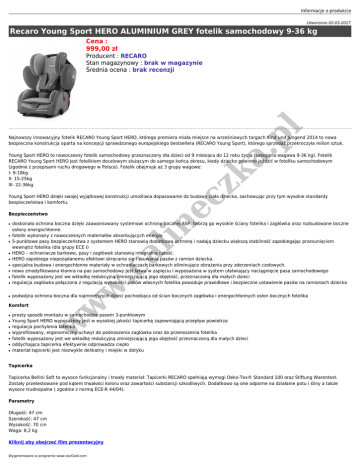 Informacje o produkcie Utworzono 02-03-2017 Recaro Young Sport HERO ALUMINIUM GREY fotelik samochodowy 9-36 kg Cena : 999,00 zł pl Producent : RECARO Stan magazynowy : brak w magazynie Średnia ocena : brak recenzji zk a. Najnowszy innowacyjny fotelik RECARO Young Sport HERO, którego premiera miała miejsce na wrześniowych targach Kind und Jungend 2014 to nowa bezpieczna konstrukcja oparta na koncepcji sprawdzonego europejskiego bestsellera (RECARO Young Sport), którego sprzedaż przekroczyła milion sztuk. Young Sport HERO to nowoczesny fotelik samochodowy przeznaczony dla dzieci od 9 miesiąca do 12 roku życia (kategoria wagowa 9-36 kg). Fotelik RECARO Young Sport HERO jest fotelikiem docelowym służącym do samego końca okresu, kiedy dziecko powinno jeździć w foteliku samochodowym (zgodnie z przepisami ruchu drogowego w Polsce). Fotelik obejmuje aż 3 grupy wagowe: I- 9-18kg II- 15-25kg III- 22-36kg. ec Young Sport HERO dzięki swojej wyjątkowej konstrukcji umożliwia dopasowanie do budowy ciała dziecka, zachowując przy tym wysokie standardy bezpieczeństwa i komfortu. Bezpieczeństwo ● ● ● ● ● ● ● in ● .c al ● doskonała ochrona boczna dzięki zaawansowany systemowi ochrony bocznej ASP, tworzą go wysokie ściany fotelika i zagłówka oraz rozbudowane boczne osłony energochłonne. fotelik wykonany z nowoczesnych materiałów absorbujących energię 5-punktowe pasy bezpieczeństwa z systemem HERO stanowią dodatkową ochronę i nadają dziecku większą stabilność zapobiegając przesunięciom wewnątrz fotelika (dla grupy ECE I) HERO – ochraniacze barkowe, pasy i zagłówek stanowią integralną całość. HERO zapobiega niepożądanemu efektowi skręcania się i zsuwania pasów z ramion dziecka. specjalna budowa i energochłonne materiały w ochraniaczach barkowych eliminujące obrażenia przy zderzeniach czołowych. nowa zmodyfikowana klamra na pas samochodowy jest łatwa w zapięciu i wyposażona w system ułatwiający naciągnięcie pasa samochodowego fotelik wyposażony jest we wkładkę redukcyjną zmniejszającą jego objętość, przeznaczoną dla małych dzieci regulacja zagłówka połączona z regulacją wysokości pasów własnych fotelika powoduje prawidłowe i bezpieczne ustawienie pasów na ramionach dziecka w ● podwójna ochrona boczna dla najmniejszych dzieci pochodząca od ścian bocznych zagłówka i energochłonnych osłon bocznych fotelika ● ● ● ● ● ● prosty sposób montażu w samochodzie pasem 3-punktowym Young Sport HERO wyposażony jest w wysokiej jakości tapicerkę zapewniającą przepływ powietrza regulacja pochylenia fotelika wyprofilowany, ergonomiczny uchwyt do podnoszenia zagłówka oraz do przenoszenia fotelika fotelik wyposażony jest we wkładkę redukcyjną zmniejszającą jego objętość przeznaczoną dla małych dzieci oddychająca tapicerka efektywnie odprowadza ciepło materiał tapicerki jest niezwykle delikatny i miękki w dotyku w ● w Komfort Tapicerka Tapicerka Bellini Soft to wysoce funkcjonalny i trwały materiał: Tapicerki RECARO spełniają wymogi Oeko-Tex® Standard 100 oraz Stiftung Warentest. Zostały przetestowane pod kątem trwałości koloru oraz zawartości substancji szkodliwych. Dodatkowo są one odporne na działanie potu i śliny a także wysoce trudnopalne ( zgodnie z normą ECE-R 44/04). Parametry Długość: 47 cm Szerokość: 47 cm Wysokość: 70 cm Waga: 8,2 kg Kliknij aby obejrzeć film prezentacyjny Wygenerowano w programie www.oscGold.com Young Sport HERO należy do kategorii uniwersalnej dzięki czemu pasuje do każdego samochodu wyposażonego w 3 punktowe pasy bezpieczeństwa. Bez względu na miejsce montażu fotelika w samochodzie należy pamiętać, że mocujemy go zawsze przodem do kierunku jazdy. Aby fotelik zapewniał maksymalne bezpieczeństwo musi być odpowiednio zamocowany w samochodzie. W Young Sporcie HERO ułatwiają to prowadnice i klamry mocujące pas samochodowy. Podczas montażu fotelika musimy pamiętać o prawidłowym przebiegu pasa samochodowego przez odpowiednie klamry. w w w .c al in ec zk a. pl Kliknij aby obejrzeć film instruktażowy