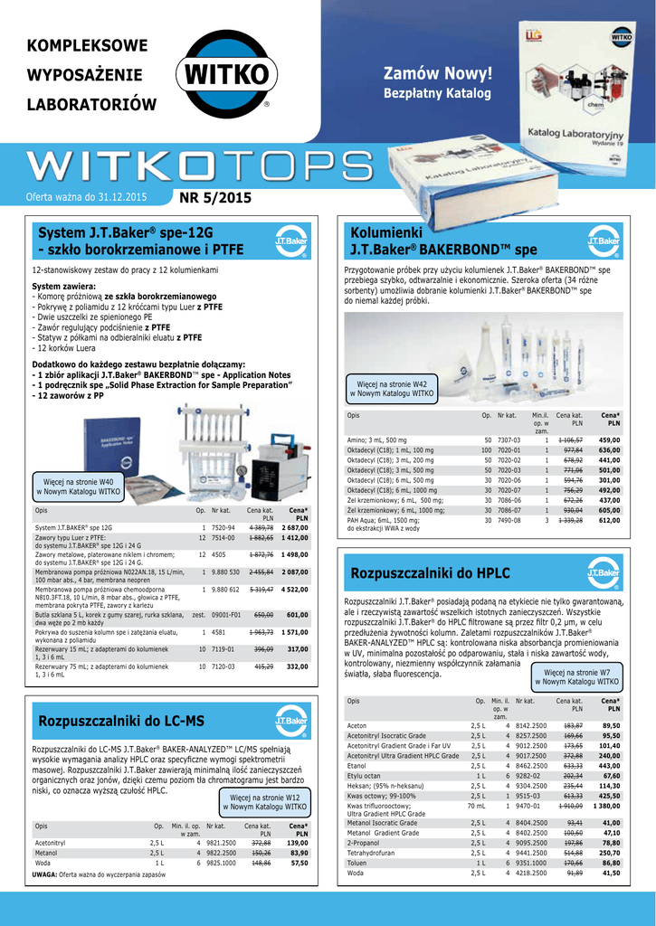 KOMPLEKSOWE Zamów Nowy! WYPOSAŻENIE Bezpłatny Katalog LABORATORIÓW NR 5/2015 Oferta ważna do 31.12.2015 System J.T.Baker® spe-12G - szkło borokrzemianowe i PTFE Kolumienki J.T.Baker® BAKERBOND™ spe 12-stanowiskowy zestaw do pracy z 12 kolumienkami Przygotowanie próbek przy użyciu kolumienek J.T.Baker® BAKERBOND™ spe przebiega szybko, odtwarzalnie i ekonomicznie. Szeroka oferta (34 różne sorbenty) umożliwia dobranie kolumienki J.T.Baker® BAKERBOND™ spe do niemal każdej próbki. System zawiera: - Komorę próżniową ze szkła borokrzemianowego - Pokrywę z poliamidu z 12 króćcami typu Luer z PTFE - Dwie uszczelki ze spienionego PE - Zawór regulujący podciśnienie z PTFE - Statyw z półkami na odbieralniki eluatu z PTFE - 12 korków Luera Dodatkowo do każdego zestawu bezpłatnie dołączamy: - 1 zbiór aplikacji J.T.Baker® BAKERBOND™ spe - Application Notes - 1 podręcznik spe „Solid Phase Extraction for Sample Preparation” - 12 zaworów z PP Więcej na stronie W42 w Nowym Katalogu WITKO Opis 50 7307-03 Min.il. op. w zam. 1 Oktadecyl (C18); 1 mL, 100 mg 100 7020-01 1 Oktadecyl (C18); 3 mL, 200 mg 50 7020-02 1 678,92 441,00 Oktadecyl (C18); 3 mL, 500 mg 50 7020-03 1 771,06 501,00 Oktadecyl (C18); 6 mL, 500 mg 30 7020-06 1 594,76 301,00 Oktadecyl (C18); 6 mL, 1000 mg 30 7020-07 1 756,29 492,00 Żel krzemionkowy; 6 mL, 500 mg; 30 7086-06 1 672,26 437,00 Żel krzemionkowy; 6 mL, 1000 mg; 30 7086-07 1 930,04 605,00 PAH Aqua; 6mL, 1500 mg; do ekstrakcji WWA z wody 30 7490-08 3 1 339,28 612,00 Amino; 3 mL, 500 mg Więcej na stronie W40 w Nowym Katalogu WITKO Opis Op. Nr kat. System J.T.BAKER® spe 12G Zawory typu Luer z PTFE: do systemu J.T.BAKER® spe 12G i 24 G Zawory metalowe, platerowane niklem i chromem; do systemu J.T.BAKER® spe 12G i 24 G. Membranowa pompa próżniowa N022AN.18, 15 L/min, 100 mbar abs., 4 bar, membrana neopren Membranowa pompa próżniowa chemoodporna N810.3FT.18, 10 L/min, 8 mbar abs., głowica z PTFE, membrana pokryta PTFE, zawory z karlezu Butla szklana 5 L, korek z gumy szarej, rurka szklana, dwa węże po 2 mb każdy Pokrywa do suszenia kolumn spe i zatężania eluatu, wykonana z poliamidu Rezerwuary 15 mL; z adapterami do kolumienek 1, 3 i 6 mL Rezerwuary 75 mL; z adapterami do kolumienek 1, 3 i 6 mL 1 7520-94 Cena kat. PLN 4 389,78 Cena* PLN 2 687,00 12 7514-00 1 882,65 1 412,00 12 4505 1 872,76 1 498,00 1 9.880 530 2 455,84 2 087,00 1 9.880 612 5 319,47 4 522,00 zest. 09001-F01 650,00 601,00 1 963,73 1 571,00 10 7119-01 396,09 317,00 10 7120-03 415,29 332,00 1 4581 Rozpuszczalniki do LC-MS J.T.Baker® BAKER-ANALYZED™ LC/MS spełniają wysokie wymagania analizy HPLC oraz specyficzne wymogi spektrometrii masowej. Rozpuszczalniki J.T.Baker zawierają minimalną ilość zanieczyszczeń organicznych oraz jonów, dzięki czemu poziom tła chromatogramu jest bardzo niski, co oznacza wyższą czułość HPLC. Więcej na stronie W12 w Nowym Katalogu WITKO 459,00 977,84 636,00 Cena kat. PLN 372,88 Cena* PLN 139,00 Aceton Op. Min. il. Nr kat. op. w zam. 2,5 L 4 8142.2500 Acetonitryl Isocratic Grade 2,5 L 4 8257.2500 Acetonitryl Gradient Grade i Far UV 2,5 L 4 9012.2500 173,65 101,40 Acetonitryl Ultra Gradient HPLC Grade 2,5 L 4 9017.2500 372,88 240,00 Etanol 2,5 L 4 8462.2500 633,33 443,00 6 9282-02 202,34 67,60 2,5 L 4 9304.2500 235,44 114,30 2,5 L 1 9515-03 613,33 425,50 70 mL 1 9470-01 1 910,09 1 380,00 41,00 Etylu octan Heksan; (95% n-heksanu) Kwas octowy; 99-100% Kwas trifluorooctowy; Ultra Gradient HPLC Grade Metanol Isocratic Grade 1L Cena kat. PLN Cena* PLN 183,87 89,50 169,66 95,50 2,5 L 4 8404.2500 93,41 Metanol Gradient Grade 2,5 L 4 8402.2500 100,60 47,10 2-Propanol 2,5 L 4 9095.2500 197,86 78,80 2,5 L 4 9441.2500 514,88 250,70 1L 6 9351.1000 170,66 86,80 2,5 L 4 4218.2500 91,89 41,50 Acetonitryl 2,5 L Metanol 2,5 L 4 9822.2500 150,26 83,90 Tetrahydrofuran 1L 6 9825.1000 148,86 57,50 Toluen UWAGA: Oferta ważna do wyczerpania zapasów 1 106,57 Rozpuszczalniki J.T.Baker® posiadają podaną na etykiecie nie tylko gwarantowaną, ale i rzeczywistą zawartość wszelkich istotnych zanieczyszczeń. Wszystkie rozpuszczalniki J.T.Baker® do HPLC filtrowane są przez filtr 0,2 µm, w celu przedłużenia żywotności kolumn. Zaletami rozpuszczalników J.T.Baker® BAKER-ANALYZED™ HPLC są: kontrolowana niska absorbancja promieniowania w UV, minimalna pozostałość po odparowaniu, stała i niska zawartość wody, kontrolowany, niezmienny współczynnik załamania Więcej na stronie W7 światła, słaba fluorescencja. Min. il. op. Nr kat. w zam. 4 9821.2500 Woda Cena* PLN w Nowym Katalogu WITKO Rozpuszczalniki do LC-MS Op. Cena kat. PLN Rozpuszczalniki do HPLC Opis Opis Op. Nr kat. Woda Rozpuszczalniki do GC/ Roztwory buforowe pH / Wzorce mętności Roztwory buforowe pH Rozpuszczalniki do analiz pestycydów Roztwory bezbarwne, standaryzowane w temp. 20 °C, dokładność ±0,02, zgodne z NIST. Wysokiej jakości rozpuszczalniki dedykowane do analiz GC, analiz pozostałości organicznych i pestycydów. Charakteryzują się one bardzo wysoką czystością i niską zawartością substancji nielotnych. Bardzo niski poziom zanieczyszczeń organicznych potwierdzony jest testami: Więcej na stronie W30 w Nowym Katalogu WITKO GC-ECD: Pojedynczy pik (Lindan): (czas retencji od trichlorobenzenu do mireksu) ≤3 ng/L Opis GC-NPD: Pojedynczy pik (Etyloparation): (czas retencji od atrazyny do kumafosu) ≤3 ng/L Op. Nr kat. Cena kat. PLN 119,55 Cena* PLN 97,00 pH 1,00 1 L 3101.1000 pH 2,00 1 L 3102.1000 119,55 97,00 pH 3,00 1 L 3103.1000 182,70 90,50 pH 4,00 1 L 3104.1000 176,95 49,00 pH 5,00 1 L 3105.1000 130,17 83,90 pH 6,00 1 L 3106.1000 160,43 97,00 pH 7,00 1 L 3107.1000 152,81 50,00 pH 8,00 1 L 3108.1000 160,43 97,00 pH 9,00 1 L 3109.1000 152,81 56,00 pH 10,00 1 L 3110.1000 119,55 45,00 pH 11,00 1 L 3111.1000 144,59 105,00 Odczynniki do GC Wzorce mętności Więcej na stronie W10 w Nowym Katalogu WITKO Opis Op. Aceton 2,5 L Min. il. Nr kat. op.