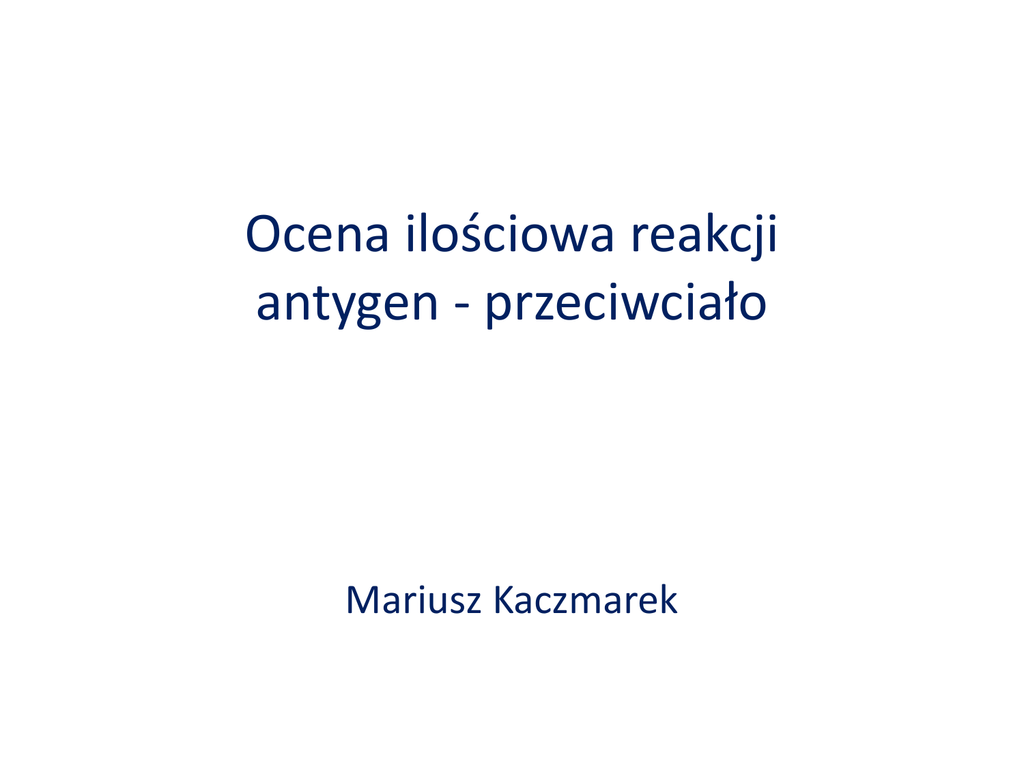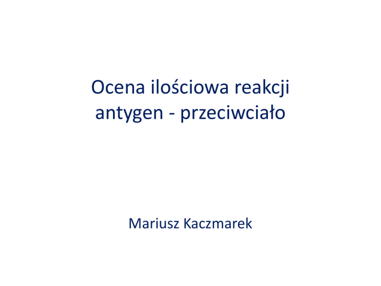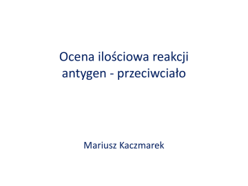 Ocena ilościowa reakcji antygen - przeciwciało Mariusz Kaczmarek Metody ilościowe oparte na tworzeniu immunoprecypitatów • • • • immunodyfuzja radialna wg Mancini immunoelektroforeza rakietowa wg Laurella turbidymetria nefelometria Immunodyfuzja radialna wg Mancini antygeny żel z przeciwciałami wg Orczyk-Pawiłowicz, Kątnik-Prstowska Immunodyfuzja radialna wg Mancini średnica kręgów precypitacyjnych wg Orczyk-Pawiłowicz, Kątnik-Prstowska średnica precypitatu (d lub d2) Immunodyfuzja radialna wg Mancini - krzywa wzorcowa stężenie antygenu (g/ml) Immunoelektroforeza rakietowa wg Laurella żel z przeciwciałami precypitaty + antygeny Turbidymetria Pomiar światła przechodzącego przez zawiesinę źródło światła fotodetektor Nefelometria Pomiar światła rozproszonego przez zawiesinę źródło światła 45 lub 90 fotodetektor Warunki reakcji 1. Prawidłowe przygotowanie roztworów 2. Temperatura 3. Jakość analizowanego materiału • bez elementów komórkowych i związków barwnych • czysty pod względem bakteriologicznym • oczyszczone przeciwciała Krzywa standardowa turbidancja Zależność między natężeniem wiązki światła przechodzącej przez roztwór koloidu lub jej rozproszeniem a stężeniem roztworu koloidalnego dla serii roztworów wzorcowych stężenie antygenu (g/ml) Zastosowanie metod opartych na tworzeniu precypitatów • albumina, • składowe dopełniacza C3c, C4 • • • • • kwaśna 1-glikoproteina, 1-antychymotrypsyna, apolipoproteina, białko CRP, haptoglobina, • • • • • 2-mikroglobulina, RF, hemoglobina, czynniki krzepnięcia, ASO • • • • • • ceruloplazmina, transferyna, fibronektyna, lizozym, immunoglobuliny (IgG, A, M, D, E), podklasy immunoglobulin (IgG1-4, IgA1-2), • łańcuchy lekkie Ig , • hormony Metody ilościowe wykorzystujące znaczniki testy fazy stałej: – radioimmunologiczne (RIA) – immunoenzymatyczne (ELISA) Testy fazy stałej bezpośredni pośredni kanapkowy kanapkowy z podwójnym przeciwciałem detekcyjnym kompetycyjny Test pośredni w fazie stałej antygen przeciwciało I przeciwciało II znakowane Krzywa kalibracyjna zależność liniowa plateau absorbancja tło stężenie badanego składnika Test kompetycyjny w fazie stałej antygen badany antygen znakowany radioaktywność Krzywa wzorcowa Ilość związanego antygenu Metody radioimmunologiczne RIA - Radio-Immuno-Assay Pomiar radioaktywności substancji izotopem promieniotwórczym. znakowanych Najczęściej stosowane izotopy: 125I , 131I – emitery - do znakowania antygenów białkowych 14C ,3H – emitery - do znakowania związków drobnocząsteczkowych 1. 2. 3. 4. Test bezpośredni w fazie płynnej (Farra) Test pośredni w fazie stałej, Test podwójnego wiązania w fazie stałej (test „kanapkowy”, sandwich test), IRMA - Immuno-Radio-Metric Assay Test kompetycyjny w fazie stałej, Metody radioimmunologiczne • hormony, • antygeny nowotworowe (np. CEA, AFP), • autoprzeciwciała, • swoiste przeciwciała klasy IgE (np. RAST,RIST), • leki, • witaminy. wysoka czułość praca z materiałem radioaktywnym, niebezpieczne odpady, niezbędna aparatura Metody immunoenzymatyczne ELISA - enzyme-linked immunosorbent assay Wykorzystanie katalitycznych właściwości enzymów w wykrywaniu i ilościowym oznaczaniu substancji w reakcjach immunologicznych. Najczęściej stosowane enzymy: – – – – – – Fosfataza alkaliczna Peroksydaza chrzanowa -Galaktozydaza Oksydaza glukozowa Ureaza Katalaza Koniugaty i substraty znakowane enzymem przeciwciała lub antygeny detekcyjne Enzym Fosfataza alkaliczna Związek Odczyt (filtr, ) p-nitrofenylofosforan sodowy 410 nm o-fenylenodiamina (OFD) + H2O2 495 nm Peroksydaza chrzanowa Tetrametylobenzydyna (TMB) 650 nm bez przerywania reakcji 450 nm z H2SO4 Testy ELISA w diagnostyce medycznej - oznaczanie antygenów (kompletnych) - oznaczanie specyficznych przeciwciał - testy kompetytywne – oznaczanie haptenów (antygenów niekompletnych) Wykrywanie antygenów • zastosowanie swoistych przeciwciał, • poliklonalność przeciwciał zwiększa swoistość testu, można użyć przeciwciał od dwóch różnych gatunków zwierząt, • częściej stosuje się przeciwciała monoklonalne, także dwa różne. Oznaczenie stężeń: – – – – – – hormonów białkowych markerów towarzyszących nowotworom białek ostrej fazy cytokin, cząsteczek adhezyjnych, niektórych patogenów Wykrywanie swoistych przeciwciał • Faza stała opłaszczona antygenem izolowanym zdanego czynnika patogennego – białka silnie immunogenne wywołujące szybką odpowiedź zainfekowanego organizmu; antygeny rekombinowane zwiększają specyficzność testu; zastosowanie mieszaniny przeciwciał • Badana surowica z poszukiwanymi przeciwciałami. Jeżeli badany miał kontakt z patogenem, przeciwciała są obecne i zwiążą się z antygenami na płytce. • Koniugat - przeciwciało przeciwko ludzkim immunoglobulinom (albo konkretnej ich klasie), znakowane enzymem. Wiąże się do badanych przeciwciał, obecnych w kompleksach na płytce. • Chromogen lub substrat reakcji enzymatycznej, który enzym przekształca w barwny produkt reakcji. Zastosowanie: – diagnostyka chorób zakaźnych – identyfikacja alergenów – diagnostyka chorób autoimmunizacyjnych Wykrywanie haptenów Testy kompetycyjne (konkurencyjne) Oznaczenie stężeń: – hormonów steroidowych i tarczycy – pozostałości i metabolitów leków – używek i suplementów (narkotyki, anaboliki) ELISA wysoka czułość i swoistość wysoki koszt, czas oznaczenia, skomplikowana procedura