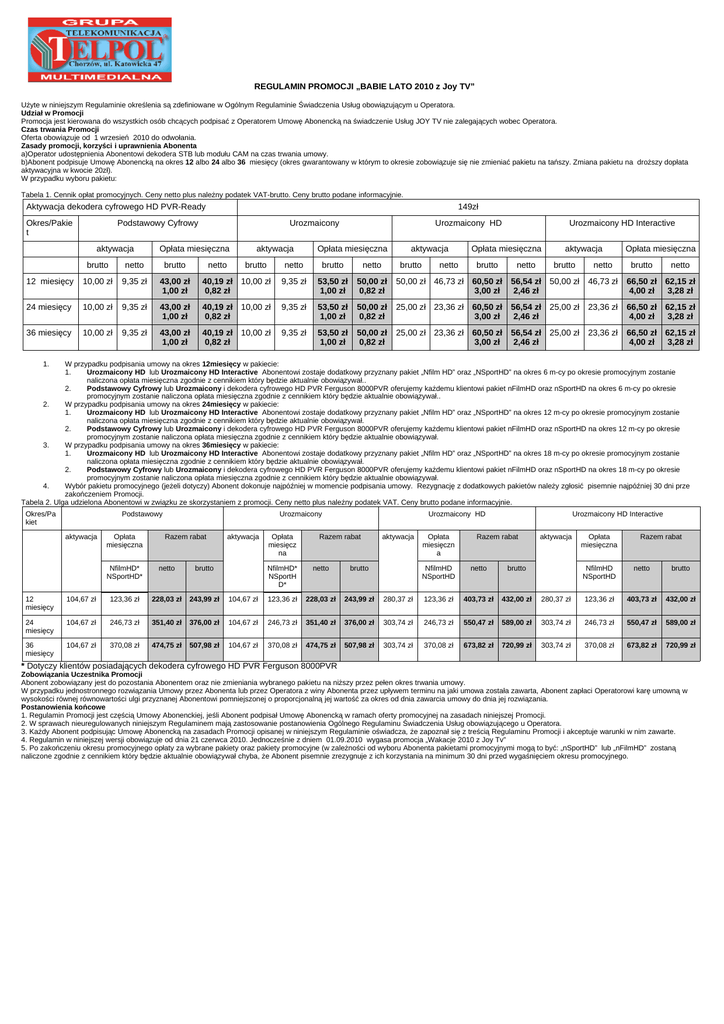 REGULAMIN PROMOCJI „BABIE LATO 2010 z Joy TV” Użyte w niniejszym Regulaminie określenia są zdefiniowane w Ogólnym Regulaminie Świadczenia Usług obowiązującym u Operatora. Udział w Promocji Promocja jest kierowana do wszystkich osób chcących podpisać z Operatorem Umowę Abonencką na świadczenie Usług JOY TV nie zalegających wobec Operatora. Czas trwania Promocji Oferta obowiązuje od 1 wrzesień 2010 do odwołania. Zasady promocji, korzyści i uprawnienia Abonenta a)Operator udostępnienia Abonentowi dekodera STB lub modułu CAM na czas trwania umowy. b)Abonent podpisuje Umowę Abonencką na okres 12 albo 24 albo 36 miesięcy (okres gwarantowany w którym to okresie zobowiązuje się nie zmieniać pakietu na tańszy. Zmiana pakietu na droższy dopłata aktywacyjna w kwocie 20zł). W przypadku wyboru pakietu: Tabela 1. Cennik opłat promocyjnych. Ceny netto plus należny podatek VAT-brutto. Ceny brutto podane informacyjnie. Aktywacja dekodera cyfrowego HD PVR-Ready Okres/Pakie t 149zł Podstawowy Cyfrowy aktywacja Urozmaicony Opłata miesięczna netto aktywacja brutto Urozmaicony HD Opłata miesięczna aktywacja brutto netto Urozmaicony HD Interactive Opłata miesięczna brutto netto aktywacja brutto netto Opłata miesięczna brutto netto brutto netto brutto netto 12 miesięcy 10,00 zł 9,35 zł 43,00 zł 1,00 zł 40,19 zł 10,00 zł 0,82 zł 9,35 zł 53,50 zł 1,00 zł 50,00 zł 0,82 zł 50,00 zł 46,73 zł 60,50 zł 3,00 zł 56,54 zł 50,00 zł 2,46 zł 46,73 zł 66,50 zł 62,15 zł 4,00 zł 3,28 zł brutto netto 24 miesięcy 10,00 zł 9,35 zł 43,00 zł 1,00 zł 40,19 zł 10,00 zł 0,82 zł 9,35 zł 53,50 zł 1,00 zł 50,00 zł 0,82 zł 25,00 zł 23,36 zł 60,50 zł 3,00 zł 56,54 zł 25,00 zł 2,46 zł 23,36 zł 66,50 zł 62,15 zł 4,00 zł 3,28 zł 36 miesięcy 10,00 zł 9,35 zł 43,00 zł 1,00 zł 40,19 zł 10,00 zł 0,82 zł 9,35 zł 53,50 zł 1,00 zł 50,00 zł 0,82 zł 25,00 zł 23,36 zł 60,50 zł 3,00 zł 56,54 zł 25,00 zł 2,46 zł 23,36 zł 66,50 zł 62,15 zł 4,00 zł 3,28 zł 1. W przypadku podpisania umowy na okres 12miesięcy w pakiecie: 1. Urozmaicony HD lub Urozmaicony HD Interactive Abonentowi zostaje dodatkowy przyznany pakiet „Nfilm HD” oraz „NSportHD” na okres 6 m-cy po okresie promocyjnym zostanie naliczona opłata miesięczna zgodnie z cennikiem który będzie aktualnie obowiązywał.. 2. Podstawowy Cyfrowy lub Urozmaicony i dekodera cyfrowego HD PVR Ferguson 8000PVR oferujemy każdemu klientowi pakiet nFilmHD oraz nSportHD na okres 6 m-cy po okresie promocyjnym zostanie naliczona opłata miesięczna zgodnie z cennikiem który będzie aktualnie obowiązywał.. 2. W przypadku podpisania umowy na okres 24miesięcy w pakiecie: 1. Urozmaicony HD lub Urozmaicony HD Interactive Abonentowi zostaje dodatkowy przyznany pakiet „Nfilm HD” oraz „NSportHD” na okres 12 m-cy po okresie promocyjnym zostanie naliczona opłata miesięczna zgodnie z cennikiem który będzie aktualnie obowiązywał. 2. Podstawowy Cyfrowy lub Urozmaicony i dekodera cyfrowego HD PVR Ferguson 8000PVR oferujemy każdemu klientowi pakiet nFilmHD oraz nSportHD na okres 12 m-cy po okresie promocyjnym zostanie naliczona opłata miesięczna zgodnie z cennikiem który będzie aktualnie obowiązywał. 3. W przypadku podpisania umowy na okres 36miesięcy w pakiecie: 1. Urozmaicony HD lub Urozmaicony HD Interactive Abonentowi zostaje dodatkowy przyznany pakiet „Nfilm HD” oraz „NSportHD” na okres 18 m-cy po okresie promocyjnym zostanie naliczona opłata miesięczna zgodnie z cennikiem który będzie aktualnie obowiązywał. 2. Podstawowy Cyfrowy lub Urozmaicony i dekodera cyfrowego HD PVR Ferguson 8000PVR oferujemy każdemu klientowi pakiet nFilmHD oraz nSportHD na okres 18 m-cy po okresie promocyjnym zostanie naliczona opłata miesięczna zgodnie z cennikiem który będzie aktualnie obowiązywał. 4. Wybór pakietu promocyjnego (jeżeli dotyczy) Abonent dokonuje najpóźniej w momencie podpisania umowy. Rezygnację z dodatkowych pakietów należy zgłosić pisemnie najpóźniej 30 dni prze zakończeniem Promocji. Tabela 2. Ulga udzielona Abonentowi w związku ze skorzystaniem z promocji. Ceny netto plus należny podatek VAT. Ceny brutto podane informacyjnie. Okres/Pa kiet Podstawowy aktywacja Opłata miesięczna Urozmaicony Razem rabat NfilmHD* NSportHD* netto brutto aktywacja Opłata miesięcz na Urozmaicony HD Razem rabat NfilmHD* NSportH D* netto brutto aktywacja Opłata miesięczn a Urozmaicony HD Interactive Razem rabat NfilmHD NSportHD netto brutto aktywacja Opłata miesięczna Razem rabat NfilmHD NSportHD netto brutto 12 miesięcy 104,67 zł 123,36 zł 228,03 zł 243,99 zł 104,67 zł 123,36 zł 228,03 zł 243,99 zł 280,37 zł 123,36 zł 403,73 zł 432,00 zł 280,37 zł 123,36 zł 403,73 zł 432,00 zł 24 miesięcy 104,67 zł 246,73 zł 351,40 zł 376,00 zł 104,67 zł 246,73 zł 351,40 zł 376,00 zł 303,74 zł 246,73 zł 550,47 zł 589,00 zł 303,74 zł 246,73 zł 550,47 zł 589,00 zł 36 miesięcy 104,67 zł 370,08 zł 474,75 zł 507,98 zł 104,67 zł 370,08 zł 474,75 zł 507,98 zł 303,74 zł 370,08 zł 673,82 zł 720,99 zł 303,74 zł 370,08 zł 673,82 zł 720,99 zł * Dotyczy klientów posiadających dekodera cyfrowego HD PVR Ferguson 8000PVR Zobowiązania Uczestnika Promocji Abonent zobowiązany jest do pozostania Abonentem oraz nie zmieniania wybranego pakietu na niższy przez pełen okres trwania umowy. W przypadku jednostronnego rozwiązania Umowy przez Abonenta lub przez Operatora z winy Abonenta przez upływem terminu na jaki umowa została zawarta, Abonent zapłaci Operatorowi karę umowną w wysokości równej równowartości ulgi przyznanej Abonentowi pomniejszonej o proporcjonalną jej wartość za okres od dnia zawarcia umowy do dnia jej rozwiązania. Postanowienia końcowe 1. Regulamin Promocji jest częścią Umowy Abonenckiej, jeśli Abonent podpisał Umowę Abonencką w ramach oferty promocyjnej na zasadach niniejszej Promocji. 2. W sprawac