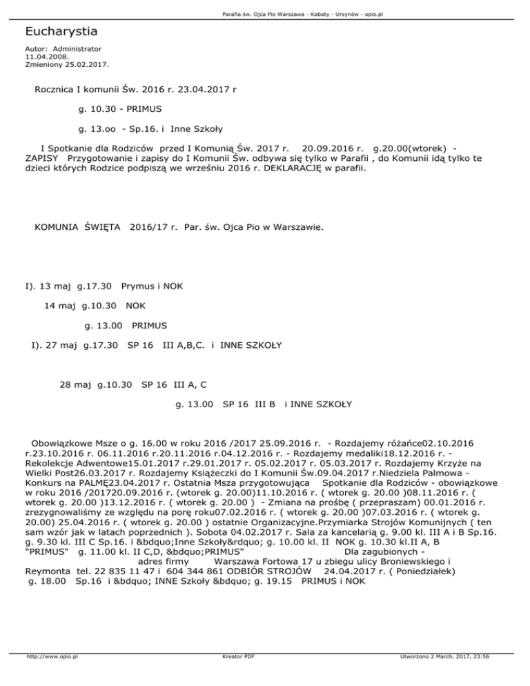 Parafia św. Ojca Pio Warszawa - Kabaty - Ursynów - opio.pl Eucharystia Autor: Administrator 11.04.2008. Zmieniony 25.02.2017. Rocznica I komunii Św. 2016 r. 23.04.2017 r g. 10.30 - PRIMUS g. 13.oo - Sp.16. i Inne Szkoły I Spotkanie dla Rodziców przed I Komunią Św. 2017 r. 20.09.2016 r. g.20.00(wtorek) ZAPISY Przygotowanie i zapisy do I Komunii Św. odbywa się tylko w Parafii , do Komunii idą tylko te dzieci których Rodzice podpiszą we wrześniu 2016 r. DEKLARACJĘ w parafii. KOMUNIA ŚWIĘTA I). 13 maj g.17.30 2016/17 r. Par. św. Ojca Pio w Warszawie. Prymus i NOK 14 maj g.10.30 g. 13.00 I). 27 maj g.17.30 NOK PRIMUS SP 16 28 maj g.10.30 III A,B,C. i INNE SZKOŁY SP 16 III A, C g. 13.00 SP 16 III B i INNE SZKOŁY Obowiązkowe Msze o g. 16.00 w roku 2016 /2017 25.09.2016 r. - Rozdajemy różańce02.10.2016 r.23.10.2016 r. 06.11.2016 r.20.11.2016 r.04.12.2016 r. - Rozdajemy medaliki18.12.2016 r. Rekolekcje Adwentowe15.01.2017 r.29.01.2017 r. 05.02.2017 r. 05.03.2017 r. Rozdajemy Krzyże na Wielki Post26.03.2017 r. Rozdajemy Książeczki do I Komunii Św.09.04.2017 r.Niedziela Palmowa Konkurs na PALMĘ23.04.2017 r. Ostatnia Msza przygotowująca Spotkanie dla Rodziców - obowiązkowe w roku 2016 /201720.09.2016 r. (wtorek g. 20.00)11.10.2016 r. ( wtorek g. 20.00 )08.11.2016 r. ( wtorek g. 20.00 )13.12.2016 r. ( wtorek g. 20.00 ) - Zmiana na prośbę ( przepraszam) 00.01.2016 r. zrezygnowaliśmy ze względu na porę roku07.02.2016 r. ( wtorek g. 20.00 )07.03.2016 r. ( wtorek g. 20.00) 25.04.2016 r. ( wtorek g. 20.00 ) ostatnie Organizacyjne.Przymiarka Strojów Komunijnych ( ten sam wzór jak w latach poprzednich ). Sobota 04.02.2017 r. Sala za kancelarią g. 9.00 kl. III A i B Sp.16. g. 9.30 kl. III C Sp.16. i „Inne Szkoły” g. 10.00 kl. II NOK g. 10.30 kl.II A, B "PRIMUS" g. 11.00 kl. II C,D, „PRIMUS" Dla zagubionych adres firmy Warszawa Fortowa 17 u zbiegu ulicy Broniewskiego i Reymonta tel. 22 835 11 47 i 604 344 861 ODBIÓR STROJÓW 24.04.2017 r. ( Poniedziałek) g. 18.00 Sp.16 i „ INNE Szkoły „ g. 19.15 PRIMUS i NOK http://www.opio.pl Kreator PDF Utworzono 2 March, 2017, 23:56 Parafia św. Ojca Pio Warszawa - Kabaty - Ursynów - opio.pl Hasła do zdjęć z I Komunii św. z dnia 21/22 maja 2016 r. dla poszczególnych dni: sobota: niedziela godz. 10.30: niedziela godz. 13.00: poniedziałek: k2016.05.21 k2016.05.22g1030 k2016.05.22g13 k2016.05.23 Andrzej Sławomir Kiełbowicz tel. 501 601 210 pracownia FIGLOFOTO: 02-797 Warszawa Al. KEN 36 m. 197 przy stacji "Natolin", w części mieszkalnej "Galerii Ursynów" klatka B obok wejścia głównego, piętro 5. tel. 510 124 604 e-mail: [email protected] http://www.opio.pl Kreator PDF Utworzono 2 March, 2017, 23:56 Parafia św. Ojca Pio Warszawa - Kabaty - Ursynów - opio.pl http://www.opio.pl Kreator PDF Utworzono 2 March, 2017, 23:56 Parafia św. Ojca Pio Warszawa - Kabaty - Ursynów - opio.pl http://www.opio.pl Kreator PDF Utworzono 2 March, 2017, 23:56 Parafia św. Ojca Pio Warszawa - Kabaty - Ursynów - opio.pl http://www.opio.pl Kreator PDF Utworzono 2 March, 2017, 23:56 Parafia św. Ojca Pio Warszawa - Kabaty - Ursynów - opio.pl http://www.opio.pl Kreator PDF Utworzono 2 March, 2017, 23:56 Parafia św. Ojca Pio Warszawa - Kabaty - Ursynów - opio.pl http://www.opio.pl Kreator PDF Utworzono 2 March, 2017, 23:56 Parafia św. Ojca Pio Warszawa - Kabaty - Ursynów - opio.pl http://www.opio.pl Kreator PDF Utworzono 2 March, 2017, 23:56 Parafia św. Ojca Pio Warszawa - Kabaty - Ursynów - opio.pl http://www.opio.pl Kreator PDF Utworzono 2 March, 2017, 23:56 Parafia św. Ojca Pio Warszawa - Kabaty - Ursynów - opio.pl http://www.opio.pl Kreator PDF Utworzono 2 March, 2017, 23:56 Parafia św. Ojca Pio Warszawa - Kabaty - Ursynów - opio.pl http://www.opio.pl Kreator PDF Utworzono 2 March, 2017, 23:56 Parafia św. Ojca Pio Warszawa - Kabaty - Ursynów - opio.pl http://www.opio.pl Kreator PDF Utworzono 2 March, 2017, 23:56 Parafia św. Ojca Pio Warszawa - Kabaty - Ursynów - opio.pl Rocznica I komunii Św. 2016 r. 03.04.2016 r. g. 10.30 Sp.16. i Inne Szkoły g. 13.00 PRIMUS, NOK, Próby Środa 30.03.16 r. g. 17.00 - PRIMUS i NOKCzwartek 31.03.16 r. g. 17.00 - Sp.16 i Inne SzkołySpowiedź Piątek 01.04.16 r. g. 17.00 - g.19.00 I Spotkanie dla Rodziców przed I Komunią Św. 2016 r. 22.09.2015 r. g.20.00(wtorek) http://www.opio.pl Kreator PDF Utworzono 2 March, 2017, 23:56 Parafia św. Ojca Pio Warszawa - Kabaty - Ursynów - opio.pl ZAPISY Przygotowanie i zapisy do I Komunii Św. odbywa się tylko w Parafii , do Komunii idą tylko te dzieci których Rodzice podpiszą we wrześniu 2015 r. DEKLARACJĘ w parafii. TERMINY KOMUNII 2016 r. 07 i 08/05 g. 10.30 Sp. 16 kl. III A, B, Inne Szkoły g. 13.00 PRIMUS III C, D sobota g. 17.30 - razem 21 i 22/05 g. 10.30 Sp.16. kl. II D, F g. 13.00 Sp. 16. kl. II E, G, S sobota g. 17.30 razem Obowiązkowe Msze o g. 16.00 w roku 2015 /2016 04.10.2015 r. Rozdajemy różańce18.10.2015 r.08.11.2015 r.22.11.2015 r.06.12.2015 r. - Rozdajemy medaliki20.12.2015 r. - Rekolekcje Adwentowe10.01.2016 r.24.01.2016 r. 21.02.2016 r. Rozdajemy Krzyże na Wielki Post06.03.2016 r. Rozdajemy Książeczki do I Komunii Św.20.03.2016 r. Niedziela Palmowa - Konkurs na PALMĘ10.04.2016 r.24.04.2016 r. Ostatnia Msza przygotowująca Spotkanie dla Rodziców - obowiązkowe w roku 2015 /201622.09.2015 r. (wtorek g. 20.00)13.10.2015 r. ( wtorek g. 20.00 )17.11.2015 r. ( wtorek g. 20.00 )08.12.2015 r. ( wtorek g. 20.00 ) za tydzień rekolekcje00.01.2016 r. zrezygnowaliśmy ze względu na porę roku16.02.2016 r. ( wtorek g. 20.00 )08.03.2016 r. ( wtorek g. 20.00) 19.04.2016 r. ( wtorek g. 20.00 ) ostatnie Organizacyjne Przyśpieszone o tydzień na prośbę Rodziców Przymiarka Strojów Komunijnych ( ten sam wzór jak w latach poprzednich ). Sobota 20.02.2016 r. Sala za kancelarią g. 9.00 kl. III A i B Sp.16. i „Inne Szkoły” g. 10.00 kl. II D,E,F, Sp. 16. g. 10.30 kl.II G,S, Sp.16. g.11.00 kl. II C,D, „Primus”. ODB
