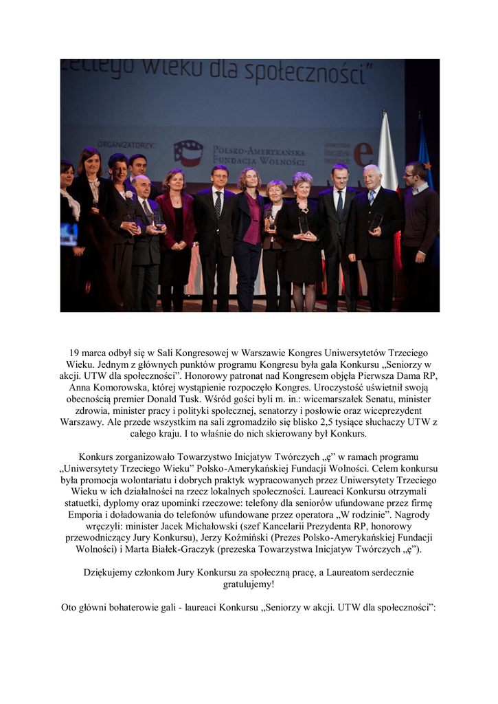 19 marca odbył się w Sali Kongresowej w Warszawie Kongres Uniwersytetów Trzeciego Wieku. Jednym z głównych punktów programu Kongresu była gala Konkursu „Seniorzy w akcji. UTW dla społeczności”. Honorowy patronat nad Kongresem objęła Pierwsza Dama RP, Anna Komorowska, której wystąpienie rozpoczęło Kongres. Uroczystość uświetnił swoją obecnością premier Donald Tusk. Wśród gości byli m. in.: wicemarszałek Senatu, minister zdrowia, minister pracy i polityki społecznej, senatorzy i posłowie oraz wiceprezydent Warszawy. Ale przede wszystkim na sali zgromadziło się blisko 2,5 tysiące słuchaczy UTW z całego kraju. I to właśnie do nich skierowany był Konkurs. Konkurs zorganizowało Towarzystwo Inicjatyw Twórczych „ę” w ramach programu „Uniwersytety Trzeciego Wieku” Polsko-Amerykańskiej Fundacji Wolności. Celem konkursu była promocja wolontariatu i dobrych praktyk wypracowanych przez Uniwersytety Trzeciego Wieku w ich działalności na rzecz lokalnych społeczności. Laureaci Konkursu otrzymali statuetki, dyplomy oraz upominki rzeczowe: telefony dla seniorów ufundowane przez firmę Emporia i doładowania do telefonów ufundowane przez operatora „W rodzinie”. Nagrody wręczyli: minister Jacek Michałowski (szef Kancelarii Prezydenta RP, honorowy przewodniczący Jury Konkursu), Jerzy Koźmiński (Prezes Polsko-Amerykańskiej Fundacji Wolności) i Marta Białek-Graczyk (prezeska Towarzystwa Inicjatyw Twórczych „ę”). Dziękujemy członkom Jury Konkursu za społeczną pracę, a Laureatom serdecznie gratulujemy! Oto główni bohaterowie gali - laureaci Konkursu „Seniorzy w akcji. UTW dla społeczności”: w kategorii „Wolontariusz UTW”: Józef Żuchowski, słuchacz Uniwersytetu Trzeciego Wieku w Stargardzie Szczecińskim, który od 2004 roku wspiera wychowanków lokalnego Domu Dziecka. Organizuje wycieczki, zabawy i pikniki, pozyskuje fundusze i dary rzeczowe. W swoje działania angażuje innych słuchaczy UTW; Wanda Drozd, słuchaczka Słupskiego Uniwersytetu Trzeciego Wieku, która od wielu lat koordynuje na UTW działania grupy wolontariatu. Obecnie w wolontariat zaangażowanych jest 29 słuchaczy. Pani Wanda nie tylko mobilizuje innych do aktywności społecznej, ale także sama współpracuje ze świetlicami środowiskowymi, przedszkolami i domami opieki; Elżbieta Iwanicka, słuchaczka Lubelskiego Uniwersytetu Trzeciego Wieku, która koordynuje prace Wielopokoleniowego Klubu Wolontariusza w Lublinie. W klubie działają słuchacze UTW i młodzi studenci. Wolontariusze współpracują z dziećmi z pogotowia opiekuńczego, odwiedzają samotne osoby starsze, prowadzą zajęcia dla dzieci w świetlicach; Agata Grzecznowska, młoda wolontariuszka Toruńskiego Uniwersytetu Trzeciego Wieku, która od 7 lat współpracuje z UTW. Najpierw pomagała w pracach biurowych i uczyła słuchaczki obsługi komputera. Z czasem zaangażowała się we współpracę z dziećmi ze świetlic i działania międzypokoleniowego banku czasu. Zainspirowała przedstawicieli swojego pokolenia do współpracy z seniorami. W kategorii „Dobra praktyka UTW”: Ustecki Uniwersytet Trzeciego Wieku – Żyj Kolorowo, który od 2009 roku realizuje projekt „Kolorowa Akademia Trzeciego Wieku”. Słuchacze pomagają prowadzić zajęcia w świetlicy szkolnej, organizują cyklicznie zajęcia dla dzieci z przedszkola, a także uczą młode kobiety zarejestrowane w urzędzie pracy zdrowego i taniego przyrządzania potraw. W działania projektu zaangażowanych jest 40 wolontariuszy z Uniwersytetu Trzeciego Wieku, z ich wsparcia korzysta 130 dzieci i 10 młodych kobiet; Uniwersytet Trzeciego Wieku w Łazach, który jest inicjatorem Ogólnopolskiej Olimpiady Sportowej „Trzeci wiek na start”, realizowanej od 2009 roku. Olimpiada jest wspaniałą formą promocji zdrowia i aktywnego wypoczynku wśród pokolenia 50+ , sprzyja też integracji środowiska Uniwersytetów Trzeciego Wieku. W ostatniej olimpiadzie udział wzięło ponad 300 starszych zawodników i ponad 130 wolontariuszy w różnym wieku. Impreza rozpoczyna się symbolicznym zapaleniem znicza olimpijskiego. Ogień został przywieziony przez studentki UTW z Grecji, ze Starego Olimpu; Filia w Radzyniu Podlaskim Lubelskiego Uniwersytetu Trzeciego Wieku, gdzie słuchacze UTW zaangażowali się w produkcję filmu, w którym opowiedzieli młodzieży o starym Radzyniu Podlaskim – miejscu ich młodości. Na premierę filmu przybyło kilkaset osób. Film powstał we współpracy z grupą młodych ludzi z Radzyńskiego Stowarzyszenia dla Kultury „Stuk-Puk”. Współpraca słuchaczy UTW z młodymi ludźmi trwa nadal, grupa planuje wydanie albumu i produkcję kolejnego filmu; Uniwersytet Trzeciego Wieku na Uniwersytecie Wrocławskim, który w sposób kompleksowy promuje wolontariat wśród seniorów. W trakcie zapisów na UTW, słuchacze pytani są o umiejętności, które mogą wykorzystać w działaniach na rzecz Uniwersytetu i lokalnej społeczności. Jury doceniło też wieloletnią współpracę tego UTW ze szkołami i przedszkolami we Wrocławiu, animowaną przez działający na UTW Zespół Łączenia Pokoleń. Nagrodę publiczności, w drodze internetowego głosowania, otrzymał: Uniwersytet Trzeciego Wieku w Międzychodzie, którego słuchacze wraz z grupą przedszkolaków i mieszkańców miasta od 2008 roku realizują akcję zazieleniania i ukwiecania miasta. Słuchacze UTW odwiedzają międzychodzkie przedszkola. Wspólnie z dziećmi zaprojektowali i stworzyli miejski klomb kwiatowy, zasadzili konwalie nad miejskim jeziorem oraz posadzili 5 klonów na 5-lecie Uniwersytetu. W akcji „Zielony Zakątek” co roku bierze udział ponad 50 wolontariuszy z UTW i 600 przedszkolaków. Publiczność mogła zagłosować na 1 z 5 inicjatyw UTW rekomendowanych do tej nagrody przez Jury Konkursu. Oddano łącznie 2201 głosów. UTW w Międzychodzie, laureat nagrody publiczności otrzymał 918 głosów. Wśród UTW nom