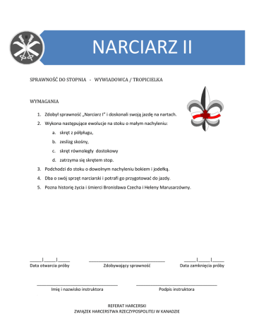NARCIARZ II SPRAWNOŚĆ DO STOPNIA - WYWIADOWCA / TROPICIELKA WYMAGANIA 1. Zdobył sprawność „Narciarz I” i doskonali swoją jazdę na nartach. 2. Wykona następujące ewolucje na stoku o małym nachyleniu: a. skręt z półpługu, b. zeslizg skośny, c. skręt równoległy dostokowy d. zatrzyma się skrętem stop. 3. Podchodzi do stoku o dowolnym nachyleniu bokiem i jodełką. 4. Dba o swój sprzęt narciarski i potrafi go przygotować do jazdy. 5. Pozna historię życia i śmierci Bronisława Czecha i Heleny Marusarzówny. _____|_____|_____ Data otwarcia próby ________________________________ Zdobywający sprawność __________________________________ Imię i nazwisko instruktora _____|_____|_____ Data zamknięcia próby __________________________________ Podpis instruktora 1. REFERAT HARCERSKI ZWIĄZEK HARCERSTWA RZECZYPOSPOLITEJ W KANADZIE