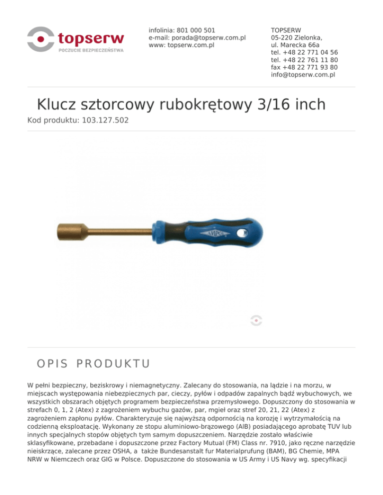 infolinia: 801 000 501 e-mail: [email protected] www: topserw.com.pl TOPSERW 05-220 Zielonka, ul. Marecka 66a tel. +48 22 771 04 56 tel. +48 22 761 11 80 fax +48 22 771 93 80 [email protected] Klucz sztorcowy rubokrętowy 3/16 inch Kod produktu: 103.127.502 OPIS PRODUKTU W pełni bezpieczny, beziskrowy i niemagnetyczny. Zalecany do stosowania, na lądzie i na morzu, w miejscach występowania niebezpiecznych par, cieczy, pyłów i odpadów zapalnych bądź wybuchowych, we wszystkich obszarach objętych programem bezpieczeństwa przemysłowego. Dopuszczony do stosowania w strefach 0, 1, 2 (Atex) z zagrożeniem wybuchu gazów, par, mgieł oraz stref 20, 21, 22 (Atex) z zagrożeniem zapłonu pyłów. Charakteryzuje się najwyższą odpornością na korozję i wytrzymałością na codzienną eksploatację. Wykonany ze stopu aluminiowo-brązowego (AlB) posiadającego aprobatę TUV lub innych specjalnych stopów objętych tym samym dopuszczeniem. Narzędzie zostało właściwie sklasyfikowane, przebadane i dopuszczone przez Factory Mutual (FM) Class nr. 7910, jako ręczne narzędzie nieiskrzące, zalecane przez OSHA, a także Bundesanstalt fur Materialprufung (BAM), BG Chemie, MPA NRW w Niemczech oraz GIG w Polsce. Dopuszczone do stosowania w US Army i US Navy wg. specyfikacji MIL oraz standardów NATO. Wykonanie zgodne z górną granicą normy DIN. Narzędzie posiada trwałe oznaczenie producenta/symbolu produktu pozwalającego na objęcie dożywotnią gwarancją uszkodzeń lub nieprawidłowego działania w normalnych warunkach użytkowania oraz polisą ubezpieczeniową odpowiedzialności za produkt na kwotę 10.000.000 CHF. Twardość stopu wg Brinella 200 HBW, wytrzymałość na rozciąganie 680 Nmm2, granica plastyczności 350 Nmm2. Wymiary: rozmiar 3/16 inch, długość sztorca 85 mm, długość klucza 185 mm, waga 60 g. DANE TECHNICZNE Rozmiar 3/16 cal Długość klucza 185 mm Długość sztorca 85 mm Waga 60 g Normy OSHA, DIN Dopuszczenie MIL do stosowania w USA Army i USA Navy, NATO Dożywotnia gwarancja Tak Testowanie Factory Mutual Research Corporation nr 7910