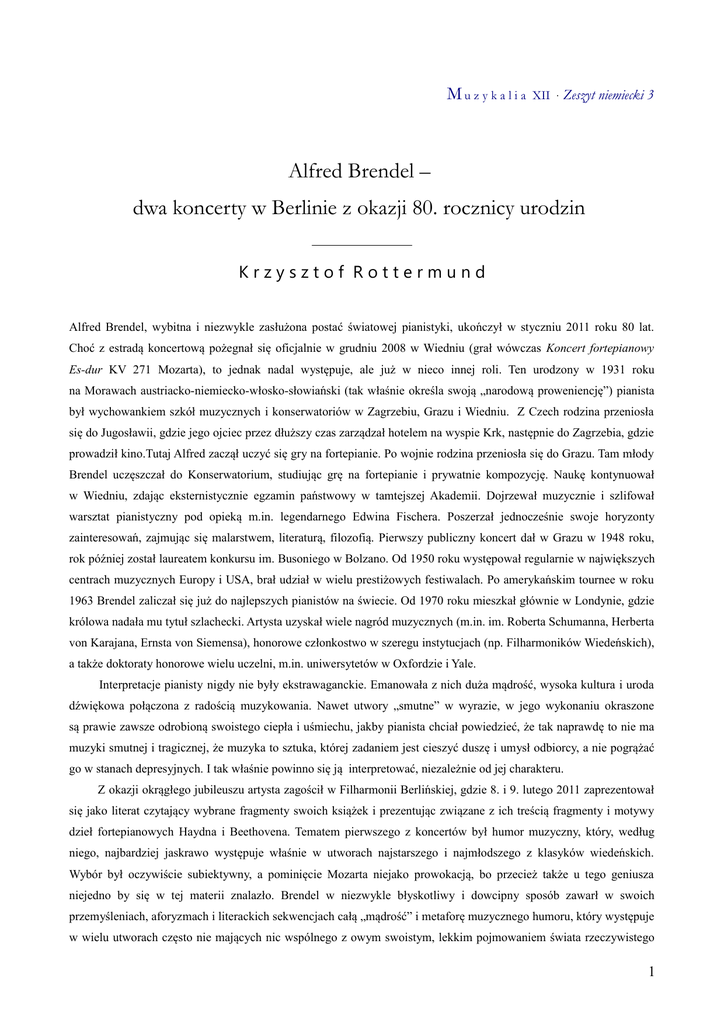 Mu z y k a l i a XII · Zeszyt niemiecki 3 Alfred Brendel – dwa koncerty w Berlinie z okazji 80. rocznicy urodzin Krzysztof Rottermund Alfred Brendel, wybitna i niezwykle zasłużona postać światowej pianistyki, ukończył w styczniu 2011 roku 80 lat. Choć z estradą koncertową pożegnał się oficjalnie w grudniu 2008 w Wiedniu (grał wówczas Koncert fortepianowy Es-dur KV 271 Mozarta), to jednak nadal występuje, ale już w nieco innej roli. Ten urodzony w 1931 roku na Morawach austriacko-niemiecko-włosko-słowiański (tak właśnie określa swoją „narodową proweniencję”) pianista był wychowankiem szkół muzycznych i konserwatoriów w Zagrzebiu, Grazu i Wiedniu. Z Czech rodzina przeniosła się do Jugosławii, gdzie jego ojciec przez dłuższy czas zarządzał hotelem na wyspie Krk, następnie do Zagrzebia, gdzie prowadził kino.Tutaj Alfred zaczął uczyć się gry na fortepianie. Po wojnie rodzina przeniosła się do Grazu. Tam młody Brendel uczęszczał do Konserwatorium, studiując grę na fortepianie i prywatnie kompozycję. Naukę kontynuował w Wiedniu, zdając eksternistycznie egzamin państwowy w tamtejszej Akademii. Dojrzewał muzycznie i szlifował warsztat pianistyczny pod opieką m.in. legendarnego Edwina Fischera. Poszerzał jednocześnie swoje horyzonty zainteresowań, zajmując się malarstwem, literaturą, filozofią. Pierwszy publiczny koncert dał w Grazu w 1948 roku, rok później został laureatem konkursu im. Busoniego w Bolzano. Od 1950 roku występował regularnie w największych centrach muzycznych Europy i USA, brał udział w wielu prestiżowych festiwalach. Po amerykańskim tournee w roku 1963 Brendel zaliczał się już do najlepszych pianistów na świecie. Od 1970 roku mieszkał głównie w Londynie, gdzie królowa nadała mu tytuł szlachecki. Artysta uzyskał wiele nagród muzycznych (m.in. im. Roberta Schumanna, Herberta von Karajana, Ernsta von Siemensa), honorowe członkostwo w szeregu instytucjach (np. Filharmoników Wiedeńskich), a także doktoraty honorowe wielu uczelni, m.in. uniwersytetów w Oxfordzie i Yale. Interpretacje pianisty nigdy nie były ekstrawaganckie. Emanowała z nich duża mądrość, wysoka kultura i uroda dźwiękowa połączona z radością muzykowania. Nawet utwory „smutne” w wyrazie, w jego wykonaniu okraszone są prawie zawsze odrobioną swoistego ciepła i uśmiechu, jakby pianista chciał powiedzieć, że tak naprawdę to nie ma muzyki smutnej i tragicznej, że muzyka to sztuka, której zadaniem jest cieszyć duszę i umysł odbiorcy, a nie pogrążać go w stanach depresyjnych. I tak właśnie powinno się ją interpretować, niezależnie od jej charakteru. Z okazji okrągłego jubileuszu artysta zagościł w Filharmonii Berlińskiej, gdzie 8. i 9. lutego 2011 zaprezentował się jako literat czytający wybrane fragmenty swoich książek i prezentując związane z ich treścią fragmenty i motywy dzieł fortepianowych Haydna i Beethovena. Tematem pierwszego z koncertów był humor muzyczny, który, według niego, najbardziej jaskrawo występuje właśnie w utworach najstarszego i najmłodszego z klasyków wiedeńskich. Wybór był oczywiście subiektywny, a pominięcie Mozarta niejako prowokacją, bo przecież także u tego geniusza niejedno by się w tej materii znalazło. Brendel w niezwykle błyskotliwy i dowcipny sposób zawarł w swoich przemyśleniach, aforyzmach i literackich sekwencjach całą „mądrość” i metaforę muzycznego humoru, który występuje w wielu utworach często nie mających nic wspólnego z owym swoistym, lekkim pojmowaniem świata rzeczywistego 1 Mu z y k a l i a XII · Zeszyt niemiecki 3 i muzycznego. Talent aktorski Brendla niewątpliwie pomaga mu w owej swoistej nowej roli, którą traktuje jednak całkiem serio. W swoich muzycznych wykładach Brendel stawia sobie m.in. następujące pytanie: „Czy muzyka sama z siebie, bez pomocy słów i sceny, może być komiczna?” Ponieważ niektórzy filozofowie i muzycy zaprzeczają temu stwierdzeniu Brendel, nie zgadzając się z nimi, udowadnia swoje tezy zarówno piórem, jak i granymi i komentowanymi na żywo przykładami muzycznymi. To głównie dzięki temu właśnie artyście zawdzięczamy przywrócenie do repertuaru pianistycznego zapomnianych, a przecież genialnych Sonat Franciszka Schuberta. Brendel był też pierwszym w ogóle pianistą, który grał i nagrał wszystkie dzieła fortepianowe Beethovena. Dokonał bardzo wielu rejestracji fonograficznych, głównie muzyki klasycznej i romantycznej. Oprócz klasyków wiedeńskich sięgał chętnie po dzieła Schuberta, Liszta i Brahmsa. Należał także do najznakomitszych akompaniatorów, wykonujących lirykę wokalno-instrumentalną, np. pieśni Schuberta i Schumann (m.in. z Dieterem Fischerem-Dieskau). Nie gardził jednak kompozycjami XX wieku, np. Schönbergiem, którego Koncert fortepianowy dość często wykonywał. Ostatnio nagrał wraz z synem Adrianem wszystkie Sonaty wiolonczelowe Beethovena. Na drugim berlińskim koncercie 9. lutego Alfred Brendel nie dotknął już klawiatury fortepianu, popisując się wyłącznie swym talentem aktorskim i literackim. Natomiast oprawę muzyczną wieczoru znakomicie zaserwowali smyczkowcy: William Coleman – altówka, Adrian Brendel – wiolonczela i Matthew McDonald – kontrabas. W wybranych utworach z cyklu Aus dem Nachlass na altówkę, wiolonczelę i kontrabas (w różnych zestawieniach instrumentów) Maurizio Kagel pokazł swój kunszt kompozytorskiego humoru i przekory. A zwieńczenie wieczoru stanowił kapitalny, pełen muzycznego komizmu trzyczęściowy Duet D-dur na wiolonczelę i kontrabas Gioacchino Rossiniego. Dowcip, ironia i inteligencja Alfreda Brendla, emanująca z jego esejów i innych dzieł literackich, znalazły uzupełnienie w świetnie dobranych i wykonanych kompozycjach obu berlińskich koncertów. Alfred Brendel 2