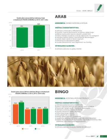 Owies - ARAB / BINGO Średni plon ziarna [dt/ha] odmiany Arab w badaniach PDOiR (COBORU) w 2010 i 2011 roku dt/ha HODOWCA: DANKO HODOWLA ROŚLIN 58,9 60 ARAB 56,5 KRÓTKA CHARAKTERYSTYKA: 50 odmiana uniwersalna, żółtoziarnista wysokie i wierne plonowanie na terenie całego kraju dobrze wyrównane ziarno o dużym udziale łuski rośliny średniej wysokości o dużej odporności na wyleganie odmiana średnio-późna, równomiernie dojrzewająca wysoki ciężar ziarna w stanie zsypnym tolerancja na zakwaszenie gleby wysoka zdrowotność oraz odporność na choroby 40 30 WYMAGANIA GLEBOWE: 20 2010 odmiana zalecana na gleby średnie 2011 Średni plon ziarna [dt/ha] odmiany Bingo w badaniach PDOiR (COBORU) w 2014, 2015 i 2016 roku dt/ha 90 BINGO HODOWCA: HODOWLA ROŚLIN STRZELCE 80 77,6 73,9 70 63,2 64,5 65,3 64,0 60 40 40 2014 2015 Wzorzec 2016 KRÓTKA CHARAKTERYSTYKA: odmiana zarejestrowana w 2009 roku jedna z najwyżej plonujących odmian owsa w Polsce doskonale nadaje się do mieszanek zbożowych odmiana wczesna o sztywnej słomie wysoka zawartość białka i tłuszczu duża masa tysiąca nasion niski udział łuski w ziarnie bardzo dobra wartość żywieniowa wyjątkowa zdrowotność łanu przez cały okres wegetacji bardzo duża odporność na choroby: mączniak prawdziwy, rdza źdźbłowa, rdza wieńcowa, septorioza liści WYMAGANIA GLEBOWE: odmiana zalecana na gleby średnie do słabszych Bingo Wiosna 2017 25