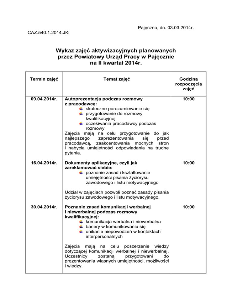 Pajęczno, dn. 03.03.2014r. CAZ.540.1.2014.JKi Wykaz zajęć aktywizacyjnych planowanych przez Powiatowy Urząd Pracy w Pajęcznie na II kwartał 2014r. Termin zajęć Temat zajęć Godzina rozpoczęcia zajęć 09.04.2014r. Autoprezentacja podczas rozmowy z pracodawcą: skuteczne porozumiewanie się przygotowanie do rozmowy kwalifikacyjnej oczekiwania pracodawcy podczas rozmowy Zajęcia mają na celu przygotowanie do jak najlepszego zaprezentowania się przed pracodawcą, zaakcentowania mocnych stron i nabycia umiejętności odpowiadania na trudne pytania. 10:00 16.04.2014r. Dokumenty aplikacyjne, czyli jak zareklamować siebie: poznanie zasad i kształtowanie umiejętności pisania życiorysu zawodowego i listu motywacyjnego 10:00 Udział w zajęciach pozwoli poznać zasady pisania życiorysu zawodowego i listu motywacyjnego. 30.04.2014r. Poznanie zasad komunikacji werbalnej i niewerbalnej podczas rozmowy kwalifikacyjnej: komunikacja werbalna i niewerbalna bariery w komunikowaniu się unikanie niepowodzeń w kontaktach interpersonalnych Zajęcia mają na celu poszerzenie wiedzy dotyczącej komunikacji werbalnej i niewerbalnej. Uczestnicy zostaną przygotowani do prezentowania własnych umiejętności, możliwości i wiedzy. 10:00 07.05.2014r. Networking w poszukiwaniu pracy: identyfikacja barier utrudniających podjęcie pracy źródła nowych miejsc pracy 10:00 Celem zajęć jest analiza najczęściej stosowanych sposobów poszukiwania pracy, wzbogacenie wiedzy i umiejętności dotyczących aktywnego poruszania się po rynku pracy. 14.05.2014r. Metody aktywnego działania na rynku pracy – poszukuję zatrudnienia: metody poszukiwania pracy analiza lokalnego rynku pracy plan działań w zakresie poszukiwania pracy 10:00 Uczestnicy zajęć poznają metody poszukiwania zatrudnienia oraz uzyskają informacje o tym jak dotrzeć do informacji o wolnych miejscach pracy. 21.05.2014r. Budowanie własnego wizerunku w oczach pracodawcy: analiza własnych umiejętności i predyspozycji zawodowych zasady konstruowania dokumentów aplikacyjnych Udział w zajęciach pozwoli zidentyfikować posiadane umiejętności i predyspozycje zawodowe, zwiększy poczucie kompetencji i pewności siebie wśród uczestników szkolenia. Uczestnicy zajęć poznają zasady i uzyskają umiejętności pisania życiorysu zawodowego i listu motywacyjnego. 10:00 28.05.2014r. Analiza niepowodzeń w poszukiwaniu pracy: najczęściej stosowane sposoby poszukiwania pracy bariery przeszkadzające w znalezieniu pracy Uczestnicy poznają zasady ułatwiające poszukiwanie pracy, zidentyfikują bariery utrudniające poszukiwanie pracy oraz poznają metody pokonywania przeszkód na drodze do realizacji wyznaczonych celów. 10:00 04.06.2014r. Rynek pracy – techniki poszukiwania pracy: jak skutecznie poruszać się po rynku pracy metody poszukiwania pracy zasady skutecznego dialogu z pracodawcą. 10:00 Zajęcia te mają na celu przygotowanie uczestników do aktywnego poruszania się po współczesnym rynku pracy oraz do rozmowy kwalifikacyjnej. 11.06.2014r. Pozytywne myślenie: moje nastawienie do życia, jak zwalczyć negatywne myślenie wywołujące stres, mój osobisty poziom stresu 10:00 Udział w zajęciach pozwoli zidentyfikować reakcje na trudne sytuacje, zmienić sposób myślenia o sytuacji utraty pracy oraz określi sposób radzenia sobie w trudnych sytuacjach życiowych. Osoby zainteresowane udziałem w poszczególnych zajęciach proszone są o zgłaszanie się najpóźniej 7 dni przed planowanym terminem zajęć do lidera Klubu Pracy osobiście w pokoju numer 107 w siedzibie Powiatowego Urzędu Pracy w Pajęcznie