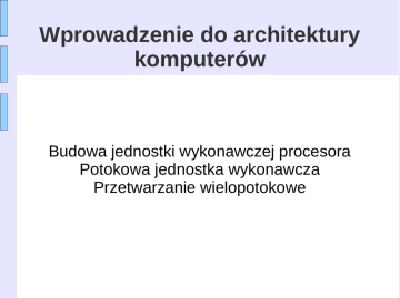 Wprowadzenie do architektury komputerów Budowa jednostki wykonawczej procesora Potokowa jednostka wykonawcza Przetwarzanie wielopotokowe Budowa procesora Jednostka wykonawcza Procesor Procesor jednocykowy ● ● ● Procesory o prostym modelu programowym można zrealizować w postaci układu sekwencyjnego, który podczas każdej instrukcji zmienia stan tylko jeden raz – na końcu instrukcji Całe wykonanie instrukcji odbywa się w układzie kombinacyjnym Założenia dla modelu procesora ● ● ● ● ● model programowy MIPS (RISC) z uproszczeniami architektura Harvard – rozdzielone pamięci programu i danych ● pamięć programu jest pamięcią stałą (ROM) czyli układem kombinacyjnym instrukcje o długości 32-bitów zapisane w pamięci o szerokości słowa równej 32 bity adresowanie pamięci bajtowe wymuszone wyrównanie naturalne danych i instrukcji Format instrukcji Modelowy procesor ma możliwość wykonywania instrukcji MIPS w dwóch spośród trzech formatów – R oraz I. W obu formatach występują pola głównego kodu operacyjnego i dwa numery rejestrów. Pozostała część słowa instrukcji jest różna dla obu formatów. Procesor jednocyklowy – pobranie instrukcji PC – licznik instrukcji PC_inc – inkrementer licznika instrukcji IM – pamięć instrukcji nextPC – ścieżka zawierająca następną zawartość PC Procesor jednocyklowy – pobieranie instrukcji ● ● Licznik instrukcji PC zrealizowany jako rejestr typu D Zawartość licznika instrukcji jest podawana na ● ● ● ● wejście adresowe pamięci programu IM wejście inkrementera PC_inc – układu kombinacyjnego generującego wartość PC+4 – potencjalny adres następnej instrukcji Na wyjściu pamięci instrukcji pojawia się binarny obraz instrukcji w postaci słowa 32-bitowego Poszczególne części tego słowa zawierają (w zależności od formatu) ● ● ● ● kod operacyjny instrukcji (jedno lub dwa pola) 0,1,2 lub 3 numery rejestrów (docelowy, źródłowe) 16-bitową stałą natychmiastową używaną jako argument operacji lub przemieszczenie adresu 5-bitową wartość przesunięcia bitowego Procesor jednocyklowy – układ sterujący ● Na wejście układu sterującego jest podawana część słowa instrukcji ● ● ● główny kod operacyjny – pole OPC (tylko dla instrukcji w formacie R) pole FUN Układ sterujący generuje sygnały sterujące pozostałymi częściami procesora, w tym m,in, ● ● ● ● ● ● sygnały sterujące multiplexerami sygnały zezwolenia na odczyt i zapis pamięci danych sygnały zezwolenia na zapis rejestru docelowego kod operacji dla jednostki arytmetyczno-logicznej sygnał zezwolenia na skok warunkowy sygnał sterujący pracą układu rozszerzania danej natychmiastowej Procesor jednocyklowy – przygotowanie argumentów OPC, FUN, Rs, Rt, Rd, offset – pola obrazu binarnego instrukcji. RdA1, RdA2 – adresy odczytu zestawu rejestrów (numery odczytywanych rejestrów). WrA – Numer rejestru zapisywanego. WrD – dane zapisywane do rejstru. RdD1, RdD2 – dane odczytywane z rejestrów. BrOffset – przemieszczenie skoku. StoreData - dane zapisywane do pamięci. Mux_ALU – multiplekser wyboru drugiego argumentu źródłowego. Procesor jednocyklowy – przygotowanie argumentów ● Argumenty rejestrowe ● ● ● Argument natychmiastowy (format I) – uzyskany przez rozszerzenie 16bitowego pola stałej do 32 bitów w układzie rozszerzenia Ext ● ● ● ● ● pierwszy argument – rejestr o numerze Rs drugi argument – rejestr o numerze Rt (tylko w formacie R) instrukcje arytmetyczne, skoki warunkowe, odwołania do pamięci – rozszerzenie bitem znaku instrukcje logiczne – rozszerzenie zerami wybór drugiego argumentu realizowany przez multiplexer Mux_ALU w zależności od formatu instrukcji Jednostka arytmetyczna otrzymuje na wejściach dwa argumenty 32bitowe Numer rejestru docelowego pochodzi z pola Rt lub Rd Procesor jednocyklowy – ALU, pamięć danych Br_Add – sumator adresów docelowych skoków. MUX_BR – multiplekser skoków warunkowych. ALU – jednostka arytmetyczno – logiczna. Result – wynik operacji. Cond – warunek skoku. DM – pamięć danych. WrData – dane zapisywane do rejestru. Procesor jednocyklowy – ALU, układ skoków ● Jednostka arytmetyczno-logiczna wykonuje na argumentach wejściowych operację określoną przez wykonywaną instrukcję ● ● ● Sumator skoków generuje potencjalny adres docelowy skoku warunkowego ● ● przy instrukcjach odwołań do pamięci jest to sumowanie zawartości rejestru bazowego z przemieszczeniem, którego wynikiem jest adres odwołania przy instrukcjach skoków warunkowych ALU porównuje dwa argumenty sprawdzając określoną relację, a wartość logiczną relacji wystawia na wyjście warunku skoku COND adres powstaje przez zsumowanie zinkrementowanej zawartości PC z przeskalowanym (x4) przemieszczeniem zawartym w kodzie instrukcji Multiplekser skoków względnych MUX_BR wybiera adres następnej instrukcji Procesor jednocyklowy – wymiana danych z pamięcią ● ● ● Moduł wymiany danych z pamięcią jest bezczynny podczas instrukcji innych niż ładowanie i składowanie danych Wartość z wyjścia ALU jest używana jako adres odczytu lub zapisu pamięci W instrukcjach składowania do pamięci jest zapisana zawartość rejestru Rt ● ● zapis następuje na końcu wykonania instrukcji W instrukcji ładowania następuje odczyt zawartości pamięci Procesor jednocyklowy – zakończenie wykonywania instrukcji ● Multiplexer wyboru wyniku służy do wybrania wartości, która ma być zapisana do rejestru ● ● ● Po przepropagowaniu sygnałów przez wszystkie układy procesora następuje zakończenie wykonania instrukcji, sterowane zboczem sygnału zegarowego Zbocze zegara powoduje ● ● ● ● jest to albo wartość z wyjścia ALU, albo dana odczytana z pamięci zapis do PC wartości z wyjścia multipleksera skoków (w instr. arytmetycznych, logic