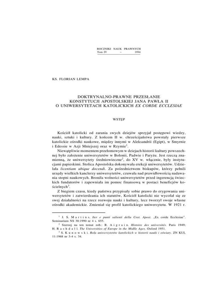 ROCZNIKI NAUK PRAWNYCH Tom IV − 1994 KS. FLORIAN LEMPA DOKTRYNALNO-PRAWNE PRZESŁANIE KONSTYTUCJI APOSTOLSKIEJ JANA PAWŁA II O UNIWERSYTETACH KATOLICKICH EX CORDE ECCLESIAE WSTE˛P Kościół katolicki od zarania swych dziejów sprzyjał poste˛ powi wiedzy, nauki, sztuki i kultury. Z końcem II w. chrześcijaństwa powstały pierwsze katolickie ośrodki naukowe, mie˛dzy innymi w Aleksandrii (Egipt), w Smyrnie i Edessie w Azji Mniejszej oraz w Rzymie1. Niewatpliwie ˛ momentem przełomowym w dziejach historii kultury powszechnej było założenie uniwersytetów w Bolonii, Padwie i Paryżu. Jest rzecza˛ znamienna, ˛ że uniwersytety średniowieczne2, do XV w. włacznie, ˛ były instytucjami papieskimi. Stolica Apostolska dokonywała erekcji uniwersytetów. Udzielała licentiam ubique docendi. Za pośrednictwem biskupów, którzy pełnili urze˛dy wielkich kanclerzy uniwersytetów, czuwała nad prawidłowościa˛ nadawania stopni naukowych. Broniła wolności uniwersytetów przed ingerencja˛ świeckich fundatorów i zapewniała im pomoc finansowa˛ w postaci beneficjów kościelnych3. Z biegiem czasu, kiedy państwa przypisały sobie prawo do erygowania uniwersytetów i zatwierdzania ich statutów, Kościół katolicki nie wycofał sie˛ ze swej działalności na rzecz rozwoju nauki i kultury, lecz tworzył swoje własne ośrodki akademickie. Zmieniał sie˛ profil katolickiego uniwersytetu. W 1921 r. 1 J. S. M a r t i n s. Iter e punti salienti della Cost. Apost. „Ex corde Ecclesiae”. Seminarium NS 30:1990 nr 4 s. 655. 2 Szerzej na ten temat zob.: R. A i g r a i n. Histoire des universités. Paris 1949; H. R a s h d a l l. The Universities of Europe in the Midlle Ages. Oxford 1951. 3 S. K u n o w s k i. Rola uniwersytetów katolickich w historii nauki i oświaty. ZN KUL 11:1968 nr 3-4 s. 34. KS. FLORIAN LEMPA 104 powstał modelowy uniwersytet katolicki w Mediolanie (bez wydziału teologicznego). W jego programie studiów znalazły sie˛ nauki matematyczno-przyrodnicze, psychologiczne, nauki rolnicze i medyczne, które z założenia wykładano w świetle teologii katolickiej. Stolica Apostolska dbała o to, aby erygowane przez nia˛ w okresie mie˛dzywojennym uniwersytety katolickie w swym nowym kształcie dawały świadectwo obecności chrześcijaństwa w dziedzinie kultury naukowej, artystycznej i technicznej. Od 1917 r. funkcjonowanie uniwersytetów katolickich określały normy podane w kan. 1376-1379 pierwszego KPK. Dalszej regulacji sytuacji prawnej uniwersytetów katolickich w zmienionych warunkach społecznych dokonał papież Pius XI moca˛ konstytucji apostolskiej Deus scientiarum Dominus, z 24 maja 1931 r.4 Zawarte w niej przepisy dotyczyły jednakże tylko uniwersytetów kościelnych i fakultetów nauk teologicznych, a w szczególności ich erekcji, programów studiów i nadawania stopni akademickich. W tym samym zakresie uniwersytetów katolickich dotyczyła Instrukcja wykonawcza do wspomnianej konstytucji, która˛ 12 czerwca 1931 r. wydała ówczesna Kongregacja Seminariów i Studiów Uniwersyteckich5. W bliskiej przeszłości w kwestii uniwersytetów katolickich wypowiedział sie˛ Sobór Watykański II6, podkreślajac ˛ szczególnie w swej deklaracji Gravissimum educationis specyficzna˛ ich misje˛ w Kościele i w świecie. Zgodnie z podanym w niej poleceniem Kongregacja Wychowania Katolickiego promulgowała 20 maja 1968 r. „Niektóre normy dokonujace ˛ odnowy konstytucji apostolskiej Deus scientiarum Dominus”7. W rzeczy samej odnosiły sie˛ one tylko do akademickich studiów na fakultetach kościelnych. Dokumentem o fundamentalnym znaczeniu dla uniwersytetów i fakultetów kościelnych była naste˛pnie konstytucja apostolska Jana Pawła II Sapientia Christiana z 15 kwietnia 1979 r.8 W ślad za nia˛ Kongregacja Nauczania Katolickiego wydała 29 kwietnia 1979 r. Instrukcje˛ wykonawcza˛ określajac ˛ a˛ zasady jej aplikacji9. Pozycje˛ prawna˛ wszystkich uniwersytetów katolickich, w tym także uniwersytetów kościelnych i fakultetów kościelnych, po raz pierwszy od promulgacji 4 AAS 23:1931 s. 241-262. AAS 23:1931 s. 263-284. 6 Zob. W. G r a n a t. Uniwersytet katolicki w świetle uchwał Soboru Watykańskiego II. ZN KUL 11:1968 nr 3-4 s. 17-32. 7 Normae quaedam ad constitutionem apostolicam Deus scientiarum Dominus de studiis academicis ecclesiasticis recognoscendam. Typis Polyglottis Vaticanis 1968. 8 AAS 71:1979 s. 469-499. 9 Tamże s. 500-521. 5 PRZESŁANIE KONSTYTUCJI APOSTOLSKIEJ EX CORDE ECCLESIAE 105 KPK z 1917 roku, określił promulgowany 25 stycznia 1983 r. nowy KPK dla Kościoła łacińskiego. Najwyższy prawodawca kościelny poświe˛cił tej sprawie dwa odre˛bne rozdziały tytułu III „Wychowanie katolickie” ksie˛gi III „Nauczycielskie zadanie Kościoła”. Pierwszy z nich został zatytułowany „Uniwersytety katolickie oraz inne instytuty studiów wyższych” (kan. 807-814), a drugi nosi tytuł „Uniwersytety i fakultety kościelne” (kan. 815-821)10. Zawarte w nich przepisy uregulowały w znacznym stopniu kwestie dotyczace ˛ założenia, erekcji i dyscypliny wewne˛trznej tychże uniwersytetów i katolickich instytutów wyższych. Konstytucja apostolska Jana Pawła II Ex corde Ecclesiae11 jest ostatnim w porzadku ˛ chronologicznym i zarazem pierwszym w dziejach Kościoła katolickiego dokumentem najwyższej rangi, który w całości został poświe˛cony uniwersytetom katolickim i katolickim instytutom wyższym, tak w aspekcie doktrynalnym, jak i prawnym. 1. GENEZA KONSTYTUCJI Prace nad przygotowaniem konstytucji na temat uniwersytetów katolickich zainicjowane zostały w 1969 r. Z inicjatywa˛ w tym wzgle˛dzie wystapiła ˛ ówczesna Kongregacja Wychowania Katolickiego. Powodem podje˛cia tych prac były wskazania Soboru Watykańskiego II oraz zaznaczajacy ˛ sie˛ od 1968 r. kryzys w działalności uniwersytetów, który skłonił wiele państw do rewizji obowiazuj ˛ acego ˛ je ustawodawstwa. 10 Zdaniem E. Te