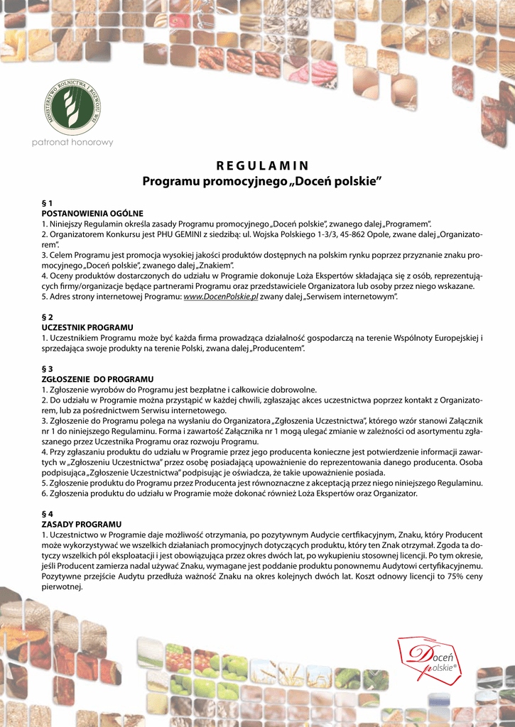 patronat honorowy REGULAMIN Programu promocyjnego „Doceń polskie” §1 POSTANOWIENIA OGÓLNE 1. Niniejszy Regulamin określa zasady Programu promocyjnego „Doceń polskie”, zwanego dalej „Programem”. 2. Organizatorem Konkursu jest PHU GEMINI z siedzibą: ul. Wojska Polskiego 1-3/3, 45-862 Opole, zwane dalej „Organizatorem”. 3. Celem Programu jest promocja wysokiej jakości produktów dostępnych na polskim rynku poprzez przyznanie znaku promocyjnego „Doceń polskie”, zwanego dalej „Znakiem”. 4. Oceny produktów dostarczonych do udziału w Programie dokonuje Loża Ekspertów składająca się z osób, reprezentujących firmy/organizacje będące partnerami Programu oraz przedstawiciele Organizatora lub osoby przez niego wskazane. 5. Adres strony internetowej Programu: www.DocenPolskie.pl zwany dalej „Serwisem internetowym”. §2 UCZESTNIK PROGRAMU 1. Uczestnikiem Programu może być każda firma prowadząca działalność gospodarczą na terenie Wspólnoty Europejskiej i sprzedająca swoje produkty na terenie Polski, zwana dalej „Producentem”. §3 ZGŁOSZENIE DO PROGRAMU 1. Zgłoszenie wyrobów do Programu jest bezpłatne i całkowicie dobrowolne. 2. Do udziału w Programie można przystąpić w każdej chwili, zgłaszając akces uczestnictwa poprzez kontakt z Organizatorem, lub za pośrednictwem Serwisu internetowego. 3. Zgłoszenie do Programu polega na wysłaniu do Organizatora „Zgłoszenia Uczestnictwa”, którego wzór stanowi Załącznik nr 1 do niniejszego Regulaminu. Forma i zawartość Załącznika nr 1 mogą ulegać zmianie w zależności od asortymentu zgłaszanego przez Uczestnika Programu oraz rozwoju Programu. 4. Przy zgłaszaniu produktu do udziału w Programie przez jego producenta konieczne jest potwierdzenie informacji zawartych w „Zgłoszeniu Uczestnictwa” przez osobę posiadającą upoważnienie do reprezentowania danego producenta. Osoba podpisująca „Zgłoszenie Uczestnictwa” podpisując je oświadcza, że takie upoważnienie posiada. 5. Zgłoszenie produktu do Programu przez Producenta jest równoznaczne z akceptacją przez niego niniejszego Regulaminu. 6. Zgłoszenia produktu do udziału w Programie może dokonać również Loża Ekspertów oraz Organizator. §4 ZASADY PROGRAMU 1. Uczestnictwo w Programie daje możliwość otrzymania, po pozytywnym Audycie certfikacyjnym, Znaku, który Producent może wykorzystywać we wszelkich działaniach promocyjnych dotyczących produktu, który ten Znak otrzymał. Zgoda ta dotyczy wszelkich pól eksploatacji i jest obowiązująca przez okres dwóch lat, po wykupieniu stosownej licencji. Po tym okresie, jeśli Producent zamierza nadal używać Znaku, wymagane jest poddanie produktu ponownemu Audytowi certyfikacyjnemu. Pozytywne przejście Audytu przedłuża ważność Znaku na okres kolejnych dwóch lat. Koszt odnowy licencji to 75% ceny pierwotnej. 2. W ciągu roku odbywają się maksymalnie 4 (cztery) Audyty certyfikacyjne. 3. Producent deklarując chęć zgłoszenia produktu do udziału w Programie zobowiązuje się dostarczyć na własny koszt próbkę produktu (w ilości 4-6 szt. każdego asortymentu) w terminie oraz do miejsca Audytu certyfikacyjnego wskazanego przez Organizatora. Organizator o miejscu oraz terminie Audytu certyfikacyjnego zobowiązuje się poinformować Producenta przynajmniej z 7 (siedmio) dniowym wyprzedzeniem. 4. W przypadku produktów zgłoszonych przez Lożę Ekspertów – Organizator zobowiązuje się poinformować Producenta o tym fakcie i przesyłać kartę „Zgłoszenia Uczestnictwa” oraz informację o miejscu i terminie Audytu certyfikacyjnego z co najmniej 7 (siedmio) dniowym wyprzedzeniem. Producent, jeśli wyrazi chęć wzięcia udziału w certyfikacji, odsyła wypełnioną kartę „Zgłoszenia Uczestnictwa” dla każdego zgłaszanego produktu oddzielnie, w ciągu 7 (siedmiu) dni od momentu, gdy został poinformowany o nominacji do Znaku. 5. Audyt certyfikacyjny zgłoszonego produkt polega na: - weryfikacji danych zawartych w „Zgłoszeniu Uczestnictwa” - ocenie produktu przez Lożę Ekspertów, która polega na ocenie punktowej, w skali od 1 do 10 punktów, w zakresie trzech cech: smak produktu (1-10 pkt.), wygląd produktu (1-10 pkt.), stosunek ceny produktu do jego jakości (1-10 pkt.). Następnie z poszczególnych ocen, każdego członka Loży Ekspertów, zostaną wyciągnięte średnie arytmetyczne, które stanowić będą wynik końcowy. 6. Do pozytywnego przejścia Audytu certyfikacyjnego, a tym samym otrzymania prawa do używania Znaku, konieczne jest spełnienie dwóch kryteriów: - pozytywna weryfikacja danych zawartych w „Zgłoszeniu Uczestnictwa” - uzyskanie wyniku końcowego oceny Loży Ekspertów na poziomie co najmniej 7,50 (siedem i pół) punktów. 7. W przypadku, gdy produkt otrzyma wynik końcowy oceny Loży Ekspertów równy 10 punktów – otrzymuje tytuł TOP PRODUKT. Korzystanie z tytułu TOP PRODUKT jest możliwe po wykupieniu licencji na używanie Znaku. 8. Każdy z produktów, który posiada Znak może być poddany ponownemu Audytowi certyfikacyjnemu na wniosek innego Producenta, Loży Ekspertów lub Organizatora, jeśli zachodzi podejrzenie, że jego jakość uległa pogorszeniu w istotnym stopniu. §5 POSTANOWIENIA KOŃCOWE 1. Informacje o pozytywnym (lub negatywnym) wyniku Audytu certyfikacyjnego przekazane zostaną Producentom po jego zakończeniu drogą elektroniczną. 2. Wszelkie kwestie sporne oraz inne związane z interpretacją niniejszego Regulaminu oraz zasad stosowania Programu rozstrzygane są przez Organizatora. 3. Reklamacje dotyczące Programu należy złożyć na piśmie na adres: Doceń polskie, ul. Skłodowskiej 42, 47-400 Racibórz z dopiskiem „REKLAMACJA - Program Doceń polskie”. 4. Reklamacje rozpatrywane będą przez Komisję Reklamacyjną, powołaną przez Organizatora, niezwłocznie, jednakże nie później niż w terminie 30 (trzydziestu) dni od daty wpłynięcia reklamacji. 5. Dec