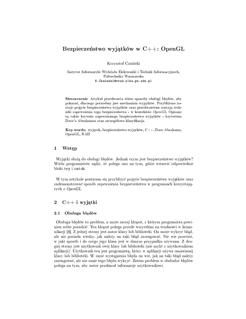 Bezpiecze«stwo wyj¡tków w C++: OpenGL Krzysztof Czai«ski Instytut Informatyki Wydziaªu Elektroniki i Technik Informacyjnych, Politechnika Warszawska [email protected] Artykuª przedstawia ró»ne sposoby obsªugi bª¦dów, aby pokaza¢, dlaczego potrzebny jest mechanizm wyj¡tków. Przybli»one zostaje poj¦cie bezpiecze«stwa wyj¡tków oraz przedstawione zostaj¡ techniki zapewnienia tego bezpiecze«stwa - w kontek±cie OpenGL. Opisane s¡ tak»e kryteria zapewnionego bezpiecze«stwa wyj¡tków - kryterium Dave'a Abrahamsa oraz szczegóªowa klasykacja. Streszczenie wyj¡tek, bezpiecze«stwo wyj¡tków, C++, Dave Abrahams, OpenGL, RAII Key words: 1 Wst¦p Wyj¡tki sªu»¡ do obsªugi bª¦dów. Jednak czym jest bezpiecze«stwo wyj¡tków? Wielu programistów s¡dzi, »e polega ono na tym, gdzie wstawi¢ odpowiednie bloki try i catch. W tym artykule postaram si¦ przybli»y¢ poj¦cie bezpiecze«stwa wyj¡tków oraz zademonstrowa¢ sposób zapewnienia bezpiecze«stwa w programach korzystaj¡cych z OpenGL. 2 C++ i wyj¡tki 2.1 Obsªuga bª¦dów Obsªuga bª¦dów to problem, a mo»e raczej kªopot, z którym programista powinien sobie poradzi¢. Ten kªopot polega przede wszystkim na trudno±ci w komunikacji [8]. Z jednej strony jest autor klasy lub biblioteki. On mo»e wykry¢ bª¡d, ale nie posiada wiedzy, jak nale»y na taki bª¡d zareagowa¢. Nie wie przecie», w jaki sposób i do czego jego klasa jest w danym przypadku u»ywana. Z drugiej strony jest u»ytkownik owej klasy lub biblioteki (nie myli¢ z u»ytkownikiem aplikacji). U»ytkownik ten jest programist¡, który w aplikacji u»ywa omawianej klasy lub biblioteki. W razie wyst¡pienia bª¦du on wie, jak na taki bª¡d nale»y zareagowa¢, ale nie umie tego bª¦du wykry¢. Zatem problem w obsªudze bª¦dów polega na tym, aby autor przekazaª informacje u»ytkownikowi. 2 Krzysztof Czai«ski Jako przykªad posªu»¡: klasa std::vector<int> int& at(size_t i), zwracaj¡ca referencj¦ do i-tego elementu wek- operacja tora Sytuacj¡ wyj¡tkow¡ (czyli tak¡, »e nale»y sygnalizowa¢ bª¡d) jest odwoªanie do nieistniej¡cego elementu wektora. Niech dla przykªadu w wektorze v znajduje si¦ 5 elementów; niech u»ytkownik wykona prób¦ odwoªania si¦ do elementu na pozycji 10. { int > std : : vector< for ( size_t i v; = 0 ; i < 5 ; ++i ) v . push_back ( 2 ∗ i + 3 ) ; // s y t u a c j a wyjatkowa v . at (10) = 1 ; } W jaki sposób mo»na tak¡ sytuacj¦ wyj¡tkow¡ potraktowa¢? Prócz zastosowania mechanizmu wyj¡tków, mo»liwo±ci jest kilka: 1. ignorowanie 2. zako«czenie dziaªania programu 3. wy±wietlenie komunikatu dla u»ytkownika aplikacji 4. kod powrotu 5. zmienna globalna 6. specjalny stan obiektu Zastosowanie jednego z powy»szych sposobów ma bardziej lub mniej powa»ne wady. Najmniej po»¡dan¡ konsekwencj¡ wybranego sposobu traktowania bª¦dów jest nieprawidªowe dziaªanie aplikacji. Dotyczy ona pierwszych trzech sposobów. Ignorowanie bª¦dów prowadzi zwykle do tego, »e chwil¦ pó¹niej pojawia si¦ sympatyczny komunikat Program wykonaª nieprawidªow¡ operacj¦ i zostanie zamkni¦ty. Niewiele si¦ zmienia, gdy program zako«czy swoje dziaªanie sam. Sposób (3) spowoduje, »e u»ytkownik aplikacji zobaczy komunikat, który b¦dzie dla niego zupeªnie niezrozumiaªy. Wad¡ sposobu (4) jest przykªadzie, metoda bool. rezerwacja warto±ci zwracanej. W przytoczonym powy»ej at musiaªaby zwraca¢ informacj¦ o powodzeniu, np. typu W konsekwencji musiaªaby przyjmowa¢ jako argument np. referencj¦ do wska¹nika, który w przypadku powodzenia byªby ustawiany, aby pokazywaª na »¡dany element wektora. Jest to komplikacja zupeªnie niepo»¡dna. Powy»sz¡ wad¦ mo»na zniwelowa¢, stosuj¡c zmienn¡ globaln¡ (5) jako miejsce informacji o bª¦dzie. Jednak stosowanie zmiennych globalnych samo w sobie prowadzi do wielu problemów, zwªaszcza w kontek±cie wspóªbie»no±ci aplikacji, co w dzisiejszych czasach jest powszechne. Bezpiecze«stwo wyj¡tków w C++: OpenGL 3 W zwi¡zku z powy»szym, mo»na zastosowa¢ sposób (6) - zaprojektowa¢ specjalny bª¦dny stan obiektu. To z kolei niepotrzebnie komplikuje projekt klasy i w konsekwencji zwi¦ksza prawdopodobie«stwo pomyªki programisty. Jednym z aspektów problemu komunikacyjnego autor-u»ytkownik jest to, czy wiadomo±¢ o bª¦dzie dotrze do u»ytkownika. Kolejn¡ wad¡ - dotycz¡c¡ sposobów (4), (5) i (6) traktowania bª¦dów - jest brak wymuszenia na u»ytkowniku biblioteki obsªugi bª¦du. Przy ka»dym u»yciu metody at w naszym przykªadzie u»ytkownik powinien sprawdza¢ czy bª¡d nie wyst¡piª. Jednak »aden mechanizm go do tego nie zmusza, wi¦c istnieje szansa, »e bª¡d zostanie niechc¡cy zignorowany. Nawet je±li u»ytkownik b¦dzie na tyle solidny, »e nie zapomni obsªu»y¢ wszystkich bª¦dów, to pozostanie kolejna wada: Kod obsªugi sytuacji wyj¡tkowych b¦dzie pomieszany z pozostaªym kodem programu. W konsekwencji program b¦dzie mniej czytelny i bardziej skomplikowany. Taka sytuacja oznacza wi¦ksze prawdopodobie«stwo pomyªki programisty i w konsekwencji bª¦dnie dziaªaj¡c¡ aplikacj¦. 2.2 Mechanizm wyj¡tków Mechanizm wyj¡tków zostaª wymy±lony do obsªugi bª¦dów, pozbawionej wymienionych wad. Jednak stosowanie mechanizmu wyj¡tków poci¡ga za sob¡ dalsze konsekwencje. Cz¦sto w programie istnieje potrzeba przydzielenia i zwolnienia zasobów. Dla ustalenia uwagi, niech to b¦dzie pami¦¢ dynamiczna. { a = new A ; // ( 1 ) Kod , k t o r y uzywa a i moze r z u c a c w y j a t e k delete a ; A∗ } Je±li w miejscu oznaczonym (1) zostanie rzucony wyj¡tek, pami¦¢ nie zostanie zwolniona. Oto mo»liwe rozwi¡zanie powy»szego problemu: { A∗ a = NULL ; try { a = new A ; // ( 1 ) Kod , k t o r y uzywa a i moze r z u c a c w y j a t e k delete a ; } catch ( . . . ) delete a ; throw ; { } } 4 Krzysztof Czai«ski Ewentualny wyj¡tek jest ªapany, zasób jest zwalniany, a nast¦pnie wyj¡tek jest rzu