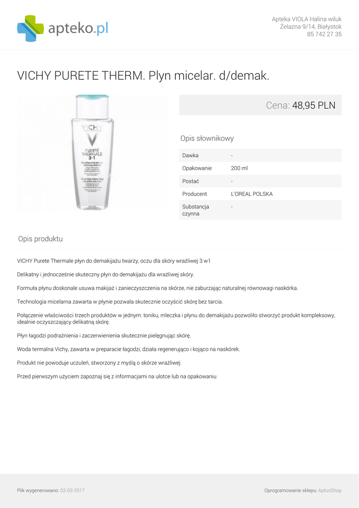 Apteka VIOLA Halina wiluk Żelazna 9/14, Białystok 85 742 27 35 VICHY PURETE THERM. Plyn micelar. d/demak. Cena: 48,95 PLN Opis słownikowy Dawka - Opakowanie 200 ml Postać - Producent L'OREAL POLSKA Substancja czynna - Opis produktu VICHY Purete Thermale płyn do demakijażu twarzy, oczu dla skóry wrażliwej 3 w1 Delikatny i jednocześnie skuteczny płyn do demakijażu dla wrażliwej skóry. Formuła płynu doskonale usuwa makijaż i zanieczyszczenia na skórze, nie zaburzając naturalnej równowagi naskórka. Technologia micelarna zawarta w płynie pozwala skutecznie oczyścić skórę bez tarcia. Połączenie właściwości trzech produktów w jednym: toniku, mleczka i płynu do demakijażu pozwoliło stworzyć produkt kompleksowy, idealnie oczyszczający delikatną skórę. Płyn łagodzi podrażnienia i zaczerwienienia skutecznie pielęgnując skórę. Woda termalna Vichy, zawarta w preparacie łagodzi, działa regenerująco i kojąco na naskórek. Produkt nie powoduje uczuleń, stworzony z myślą o skórze wrażliwej Przed pierwszym użyciem zapoznaj się z informacjami na ulotce lub na opakowaniu Plik wygenerowano: 02-03-2017 Powered by TCPDF (www.tcpdf.org) Oprogramowanie sklepu: AptusShop