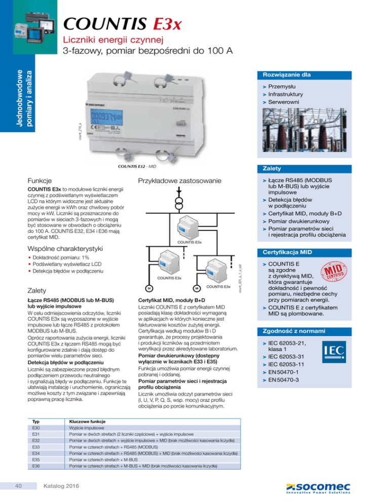 COUNTIS E3x Jednoobwodowe pomiary i analiza Liczniki energii czynnej 3-fazowy, pomiar bezpośredni do 100 A Rozwiązanie dla count_219_a > Przemysłu > Infrastruktury > Serwerowni COUNTIS E32 - MID Funkcje Zalety Przykładowe zastosowanie > Łącze RS485 (MODBUS lub M-BUS) lub wyjście impulsowe > Detekcja błędów w podłączeniu > Certyfikat MID, moduły B+D > Pomiar dwukierunkowy > Pomiar parametrów sieci i rejestracja profilu obciążenia COUNTIS E3x to modułowe liczniki energii czynnej z podświetlanym wyświetlaczem LCD na którym widoczne jest aktualne zużycie energii w kWh oraz chwilowy pobór mocy w kW. Liczniki są przeznaczone do pomiarów w sieciach 3-fazowych i mogą być stosowane w obwodach o obciążeniu do 100 A. COUNTIS E32, E34 i E36 mają certyfikat MID. COUNTIS E3x Wspólne charakterystyki COUNTIS E3x COUNTIS E3x Zalety Łącze RS485 (MODBUS lub M-BUS) lub wyjście impulsowe W celu odmiejscowienia odczytów, liczniki COUNTIS E3x są wyposażone w wyjście impulsowe lub łącze RS485 z protokołem MODBUS lub M-BUS. Oprócz raportowania zużycia energii, liczniki COUNTIS E3x z łączem RS485 mogą być konfigurowane zdalnie i dają dostęp do pomiarów wielu parametrów sieci. Detekcja błędów w podłączeniu Liczniki są zabezpieczone przed błędnym podłączeniem przewodu neutralnego i sygnalizują błędy w podłączeniu. Funkcje te ułatwiają instalację i uruchomienie, ograniczają możliwe koszty z tym związane i zapewniają poprawną pracę licznika. 40 Certyfikat MID, moduły B+D Liczniki COUNTIS E z certyfikatem MID posiadają klasę dokładności wymaganą w aplikacjach w których konieczne jest fakturowanie kosztów zużytej energii. Certyfikacja według modułów B i D gwarantuje, że procesy projektowania i produkcji liczników są przedmiotem weryfikacji przez akredytowane laboratorium. Pomiar dwukierunkowy (dostępny wyłącznie w licznikach E33 i E35) Funkcja umożliwia pomiar energii czynnej pobranej i oddanej. Pomiar parametrów sieci i rejestracja profilu obciążenia Licznik umożliwia odczyt parametrów sieci (I, U, V, P, Q, S, wsp. mocy) oraz profilu obciążenia po porcie komunikacyjnym. Typ Kluczowe funkcje E30 Wyjście impulsowe E31 Pomiar w dwóch strefach (2 liczniki częściowe) + wyjście impulsowe E32 Pomiar w dwóch strefach + wyjście impulsowe + MID (brak możliwości kasowania liczydła) E33 Pomiar w czterech strefach + RS485 (MODBUS) E34 Pomiar w czterech strefach + RS485 (MODBUS) + MID (brak możliwości kasowania liczydła) E35 Pomiar w czterech strefach + M-BUS E36 Pomiar w czterech strefach + M-BUS + MID (brak możliwości kasowania liczydła) Katalog 2016 count_225_a_1_x_cat Certyfikacja MID • Dokładność pomiaru: 1% • Podświetlany wyświetlacz LCD • Detekcja błędów w podłączeniu > COUNTIS E są zgodne z dyrektywą MID, która gwarantuje dokładność i pewność pomiaru, niezbędne cechy przy pomiarach energii. > COUNTIS E z certyfikatem MID są plombowane. Zgodność z normami > IEC 62053-21, klasa 1 > IEC 62053-31 > IEC 62053-11 > EN 50470-1 > EN 50470-3 COUNTIS E3x Liczniki energii czynnej 3-fazowy, pomiar bezpośredni do 100 A Panel czołowy Dane techniczne 1 count_179x_b_1_cat 2 5 6 7 3 4 1. Osłona zacisków (COUNTIS E32, E34 i E36). 2. Podświetlany wyświetlacz LCD. 3. Oznakowanie MID (COUNTIS E32, E34 i E36). 4. Numer seryjny (COUNTIS E32, E34 i E36). 5. Przycisk nawigacji. 6. Przycisk kasowania. 7. Dioda metrologiczna LED. Pomiar prądu Typ 3-fazowy, pomiar bezpośredni do 100 A Pobór mocy na wejściu Maks. 0.5 VA na fazę 80 mA Prąd rozruchu (Ist) 0.5 A(1) Prąd minimalny (Imin) Prąd przejścia (Itr) 2 A(2) Prąd odniesienia (Iref) 20 A(3) Prąd maksymalny (Imax) 100 A Przeciążenie chwilowe 3000 A maks. przez 10 ms Pomiar napięcia Zakres pomiaru 230 ... 400 V AC ± 20% Pobór mocy 2 VA Ciągłe przeciążenie 280 V AC (L-N) / 480 V AC (L-L) Dokładność pomiaru energii Czynna (według IEC 62053-21) Klasa 1 Czynna (według EN 50470) Klasa B Zasilanie pomocnicze Pobierane z obwodów pomiarowych Tak Częstotliwość 50/60 Hz Wyjście impulsowe (E30/E31/E32) Ilość 1 Typ transoptora IEC 62053-31, klasa A (20 ... 30 V DC) Stała waga impulsu 100 Wh Czas trwania impulsu 100 ms Warunki pracy i przechowywania Temperatura pracy -10 ... +55°C Temperatura przechowywania -20 ... +70°C Wilgotność względna 85% Komunikacja E33/34 E35/E36 Łącze RS485 Podłączenia 2 przewody, 2 przewody, Typ półdupleks półdupleks Protokół MODBUS RTU M-BUS Szybkość 4800 … 38400 bodów 300 … 9600 bodów Obudowa 62.5 45 126 45 Partial 90 count_192_b_1_x_cat COUNTIS E30 Error RESET 3X230(400)VAC 50/60Hz 0.5-20(100)A C=2Wh / imp 100A Typ Szerokość w modułach Wymiary S x W x G Stopień ochrony obudowy Stopień ochrony panelu czołowego Typ wyświetlacza Pojemność zacisków (drut) Pojemność zacisków (linka) Waga Modułowa 7 126 x 90 x 62.5 mm IP20 IP51 Podświetlany LCD od 2.5 do 35 mm2 od 2.5 do 35 mm2 490 g (1) I(min) ≤ 0.5 * Itr (2) Klasa dokładności jest gwarantowana pomiędzy Itr a Imax (3) I(ref) = I(b) (prąd bazowy) = 10 * I(tr) dla liczników COUNTIS do pomiarów bezpośrednich L3 N L1’ L2’ L3’ 1 1 1 + 2 N 4 6 COUNTIS E30 1 3 5 7 9 11 L1 L1’ L2 L2’ L3 L3’ L1 L2 L3 N L1’ L2’ L3’ 1 1 1 + 2 15 17 13 N RS485 COUNTIS E33/E34/E35/E36 1 3 5 7 9 11 L1 L1’ L2 L2’ L3 L3’ count_185_c_1_x_cat count_184_c_1_x_cat L1 L2 count_188_e_1_x_cat Podłączenia N L1’ L2’ L3’ 1 L1 L2 L3 1 1 + 2 N 4 6 8 10 COUNTIS E31/E32 T1/2 1 3 5 7 9 11 L1 L1’ L2 L2’ L3 L3’ 1. Bezpiecznik maks. 100 A o charakterystyce gG. Numery zamówieniowe Typ Bezpośredni, 100 A - 3-fazowy Bezpośredni, 100 A - 3-fazowy, dwie strefy Bezpośredni, 100 A - 3-fazowy, dwie strefy, MID Bezpośredni, 100 A - 3-fazowy, cztery strefy, RS485, MODBUS(1) Bezpośredni, 100 A - 3-fazowy, cztery strefy, RS485, MODBUS, MID(1) Bezpośredni, 100 A - 3-fazowy, cztery strefy, M-BUS(1) Bezpośredni, 100 A - 3-fazowy, czte
